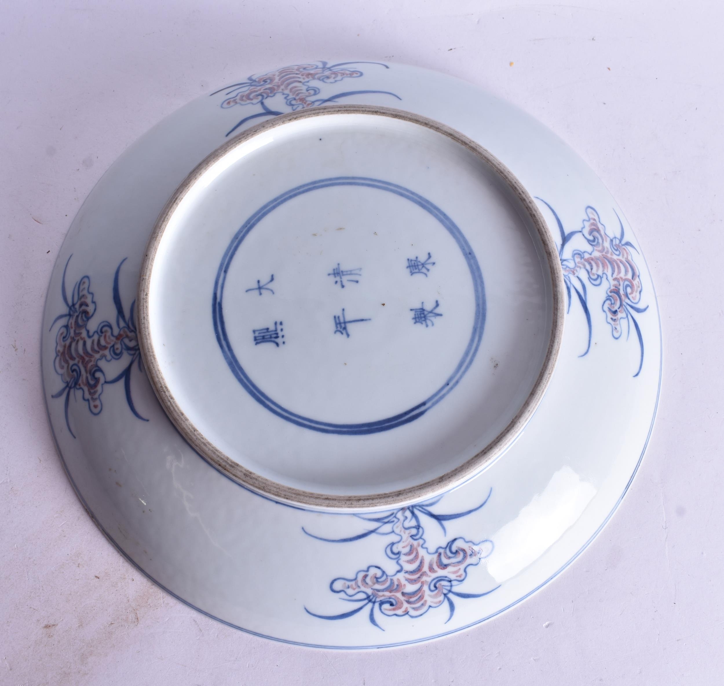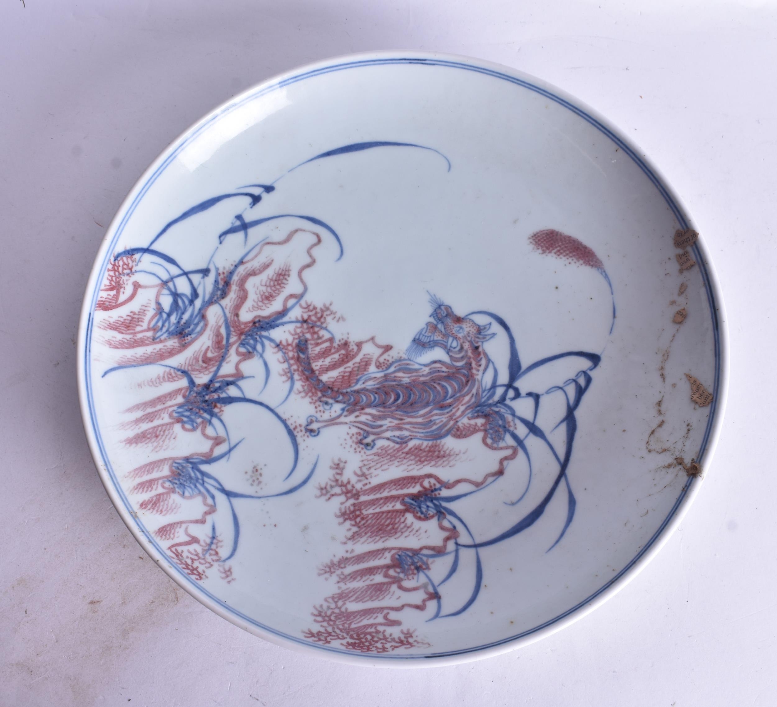 A CHINESE BLUE AND WHITE IRON RED PAINTED BEAST DISH. 26 cm ...