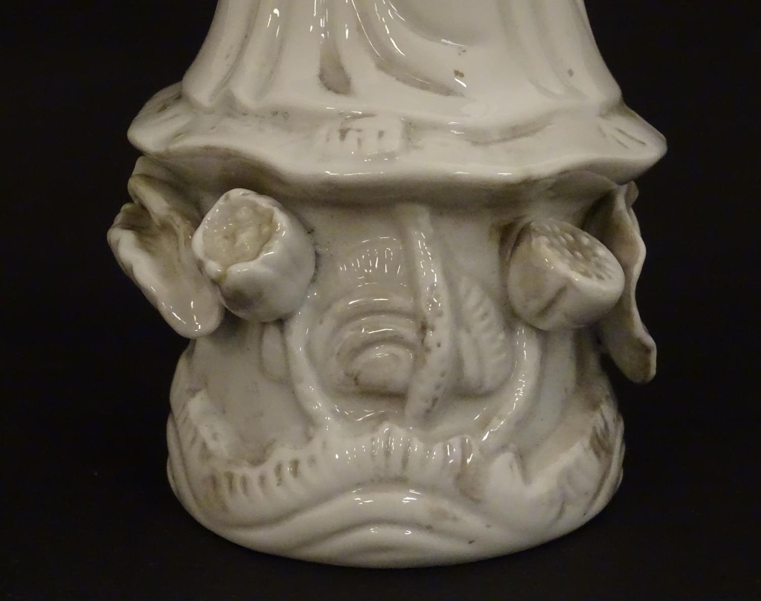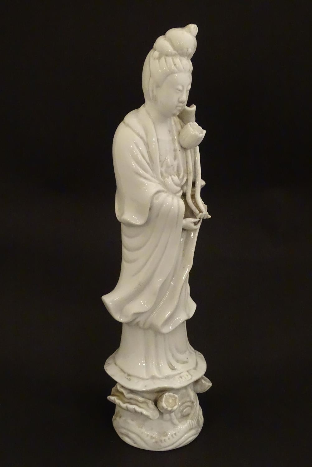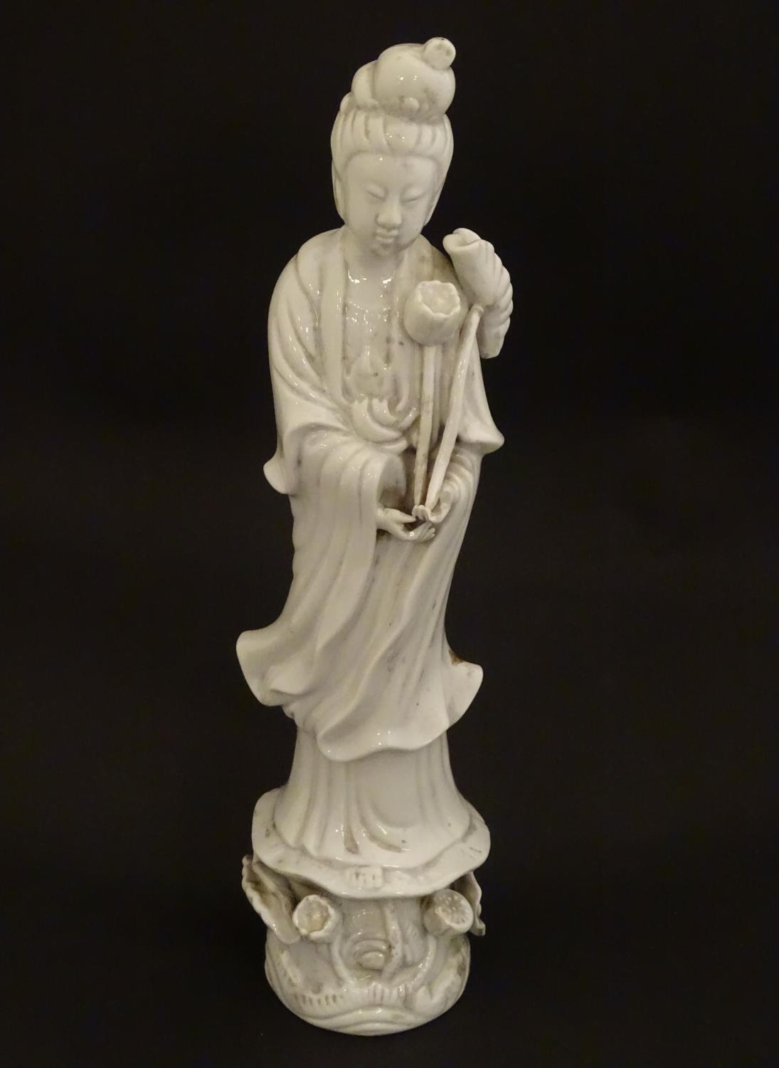 A Chinese blanc de chine figure of Guanyin holding flowers, raised on a base of lotus flowers and lily pads. Approx. 14" high.