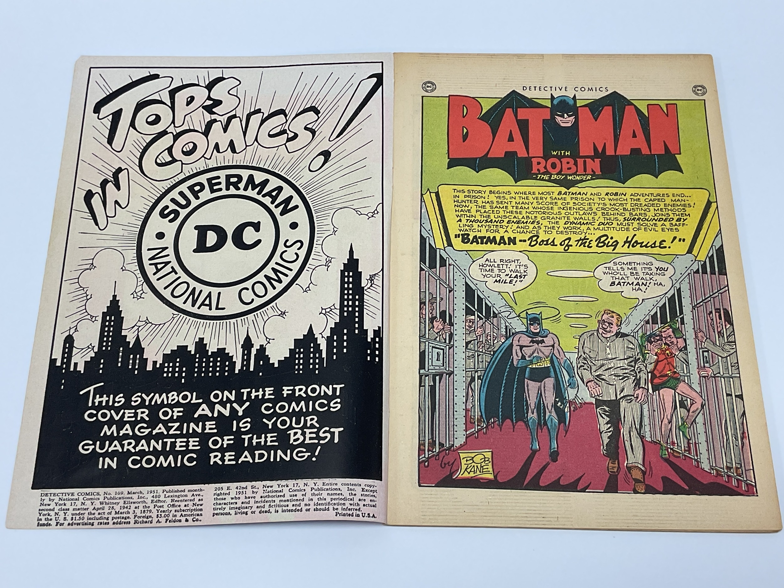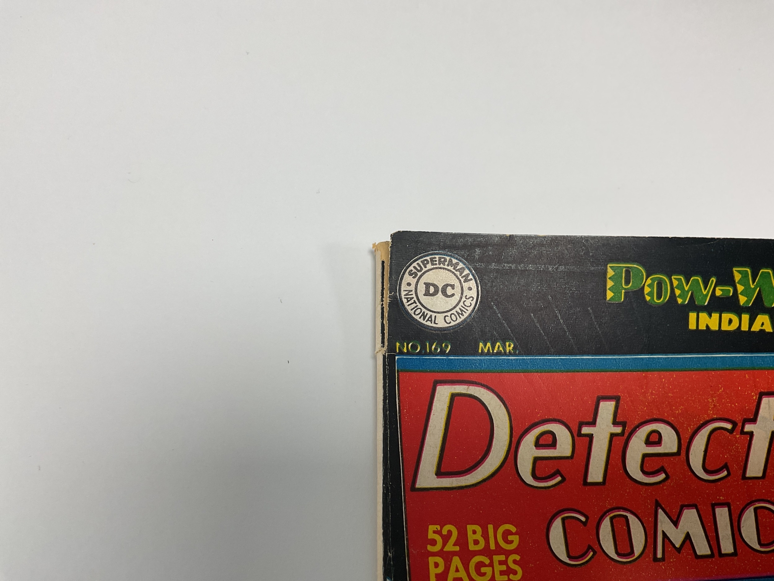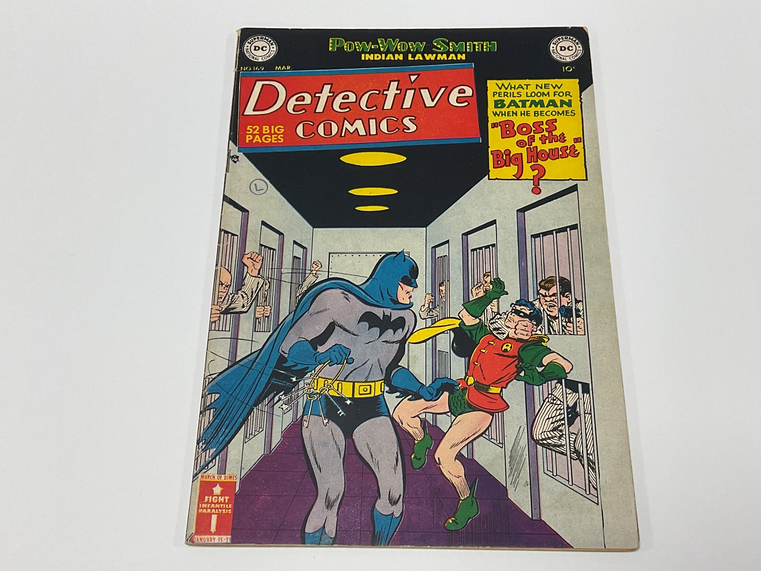Detective Comics #169 by DC, 10 cents, Golden Age (1951). Faults include small amount of cover loss to front cover, small amount of spine loss, wear to spine, tear to top of front cover (approximately 3cm), other minor tears / nicks to covers, L stamp to front cover, marking to covers, some wear / creasing to covers, minor nicks to odd pages, mainly minor marking to odd pages.