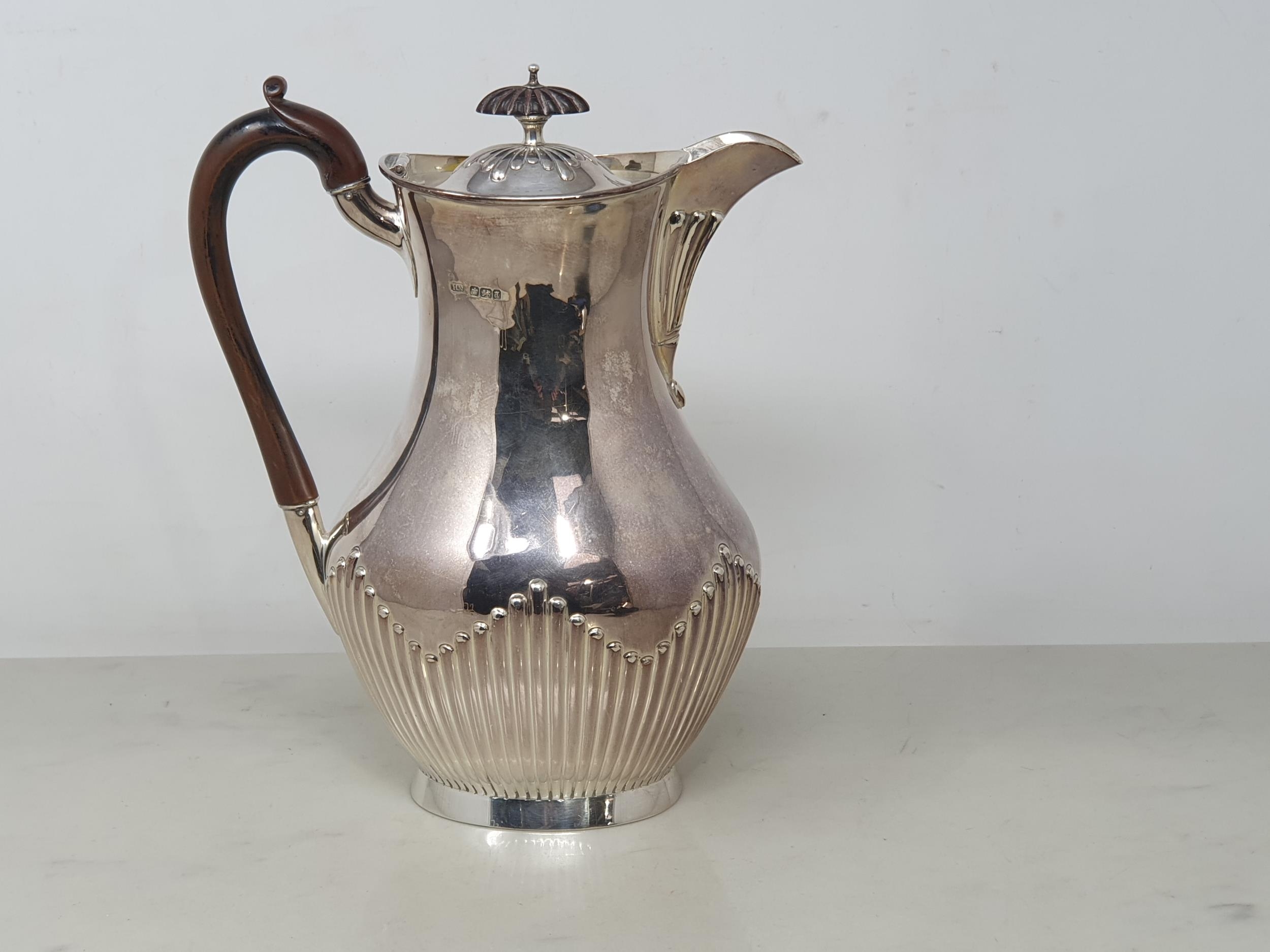 A Victorian silver Hot water Jug of oval semi-fluted form with ebonised handle, Sheffield 1893, 630gms all in