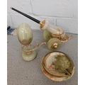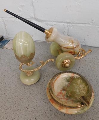 Assortment of onyx items, pen holder, ash tray, egg stand