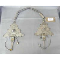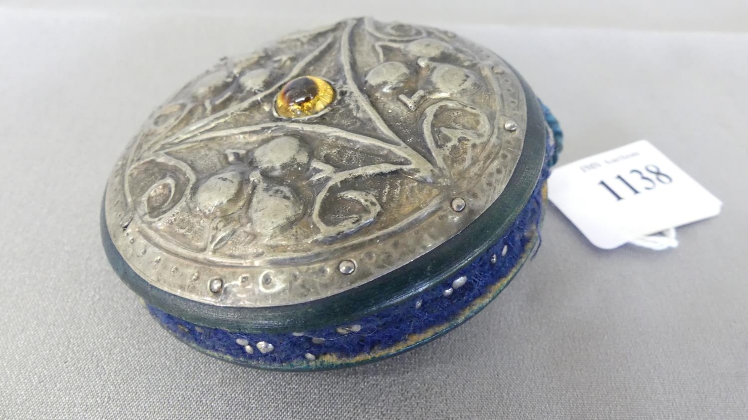 Circular Arts & Crafts Hammered Pewter Pin Cushion / Holder inset with central Amber coloured cabochon Jewel.