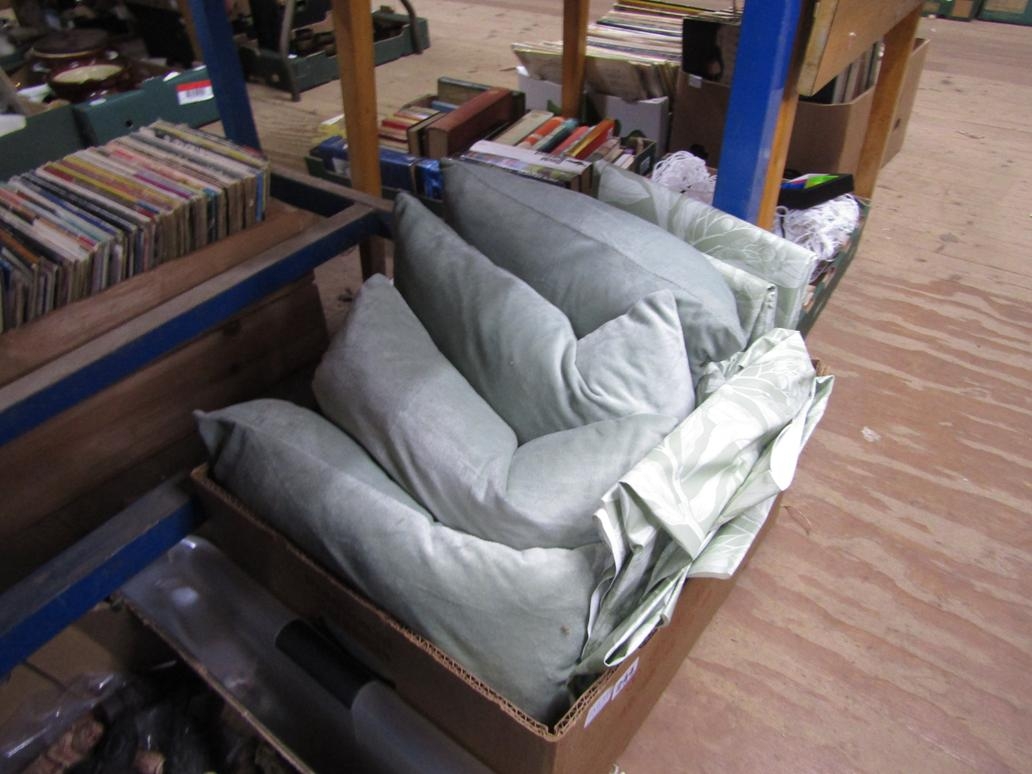 BOX OF CUSHIONS, SHOWER CURTAINS