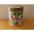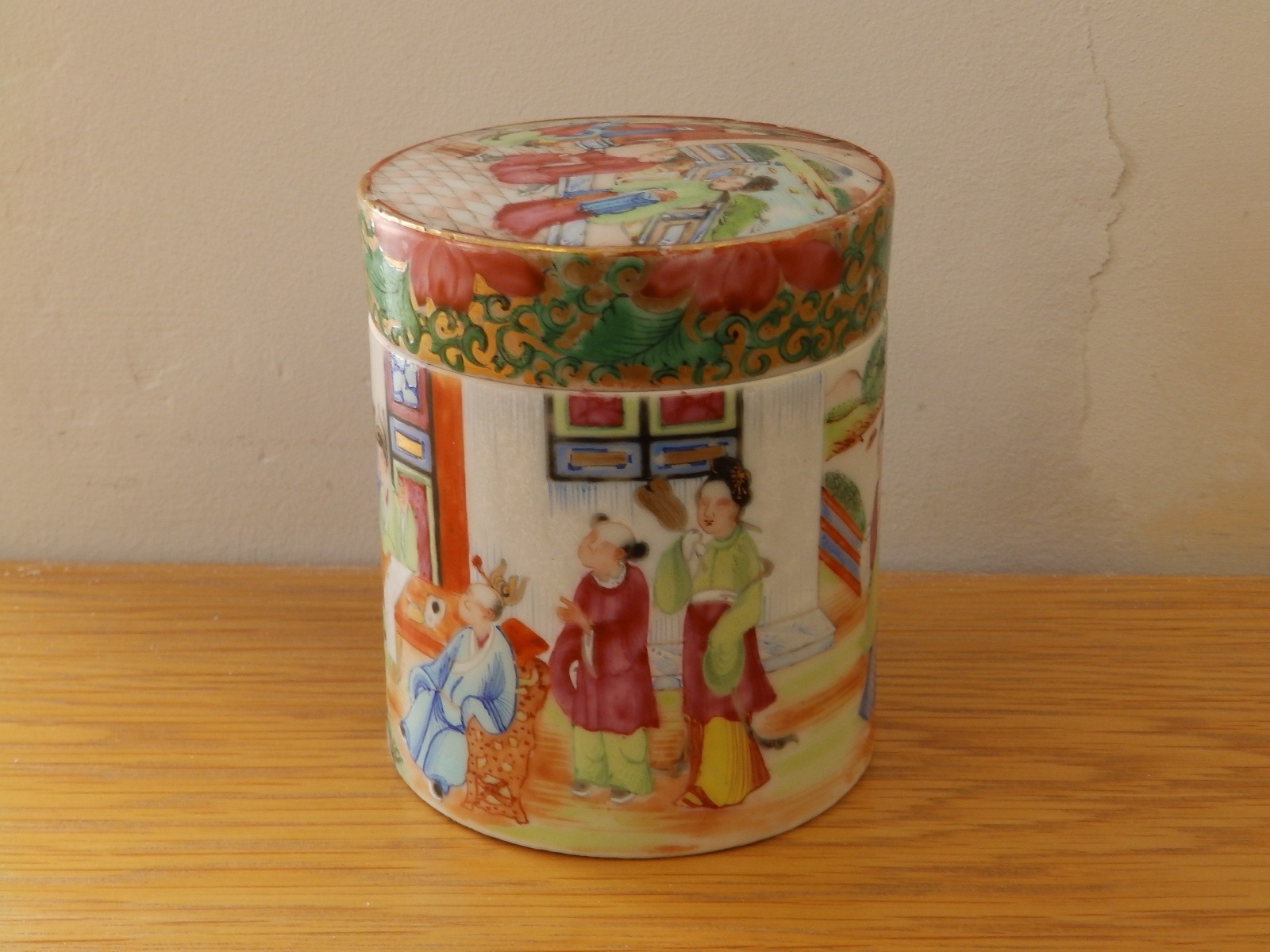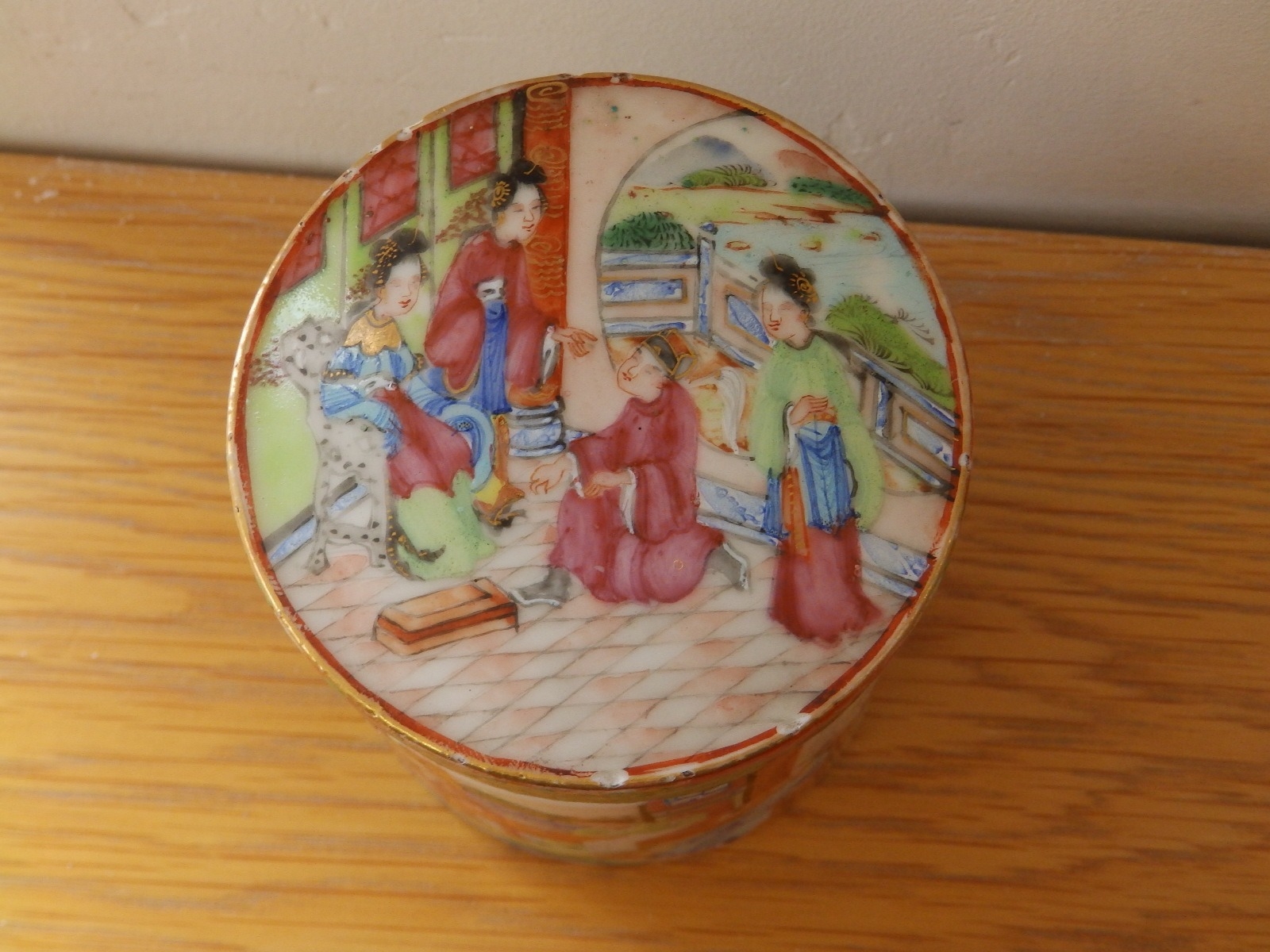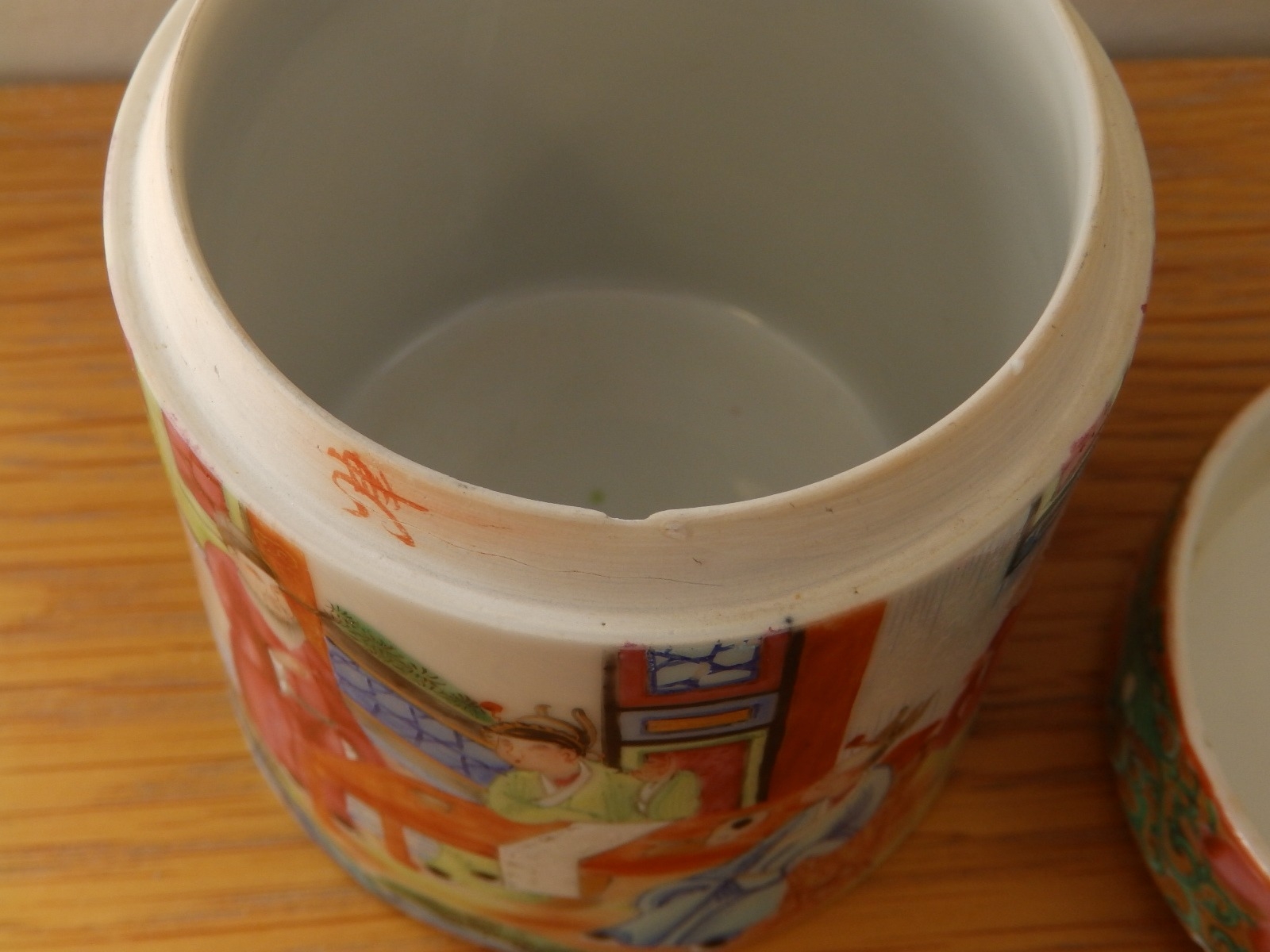 A Cantonese porcelain cylindrical jar , 3.6" high - cover chipped.