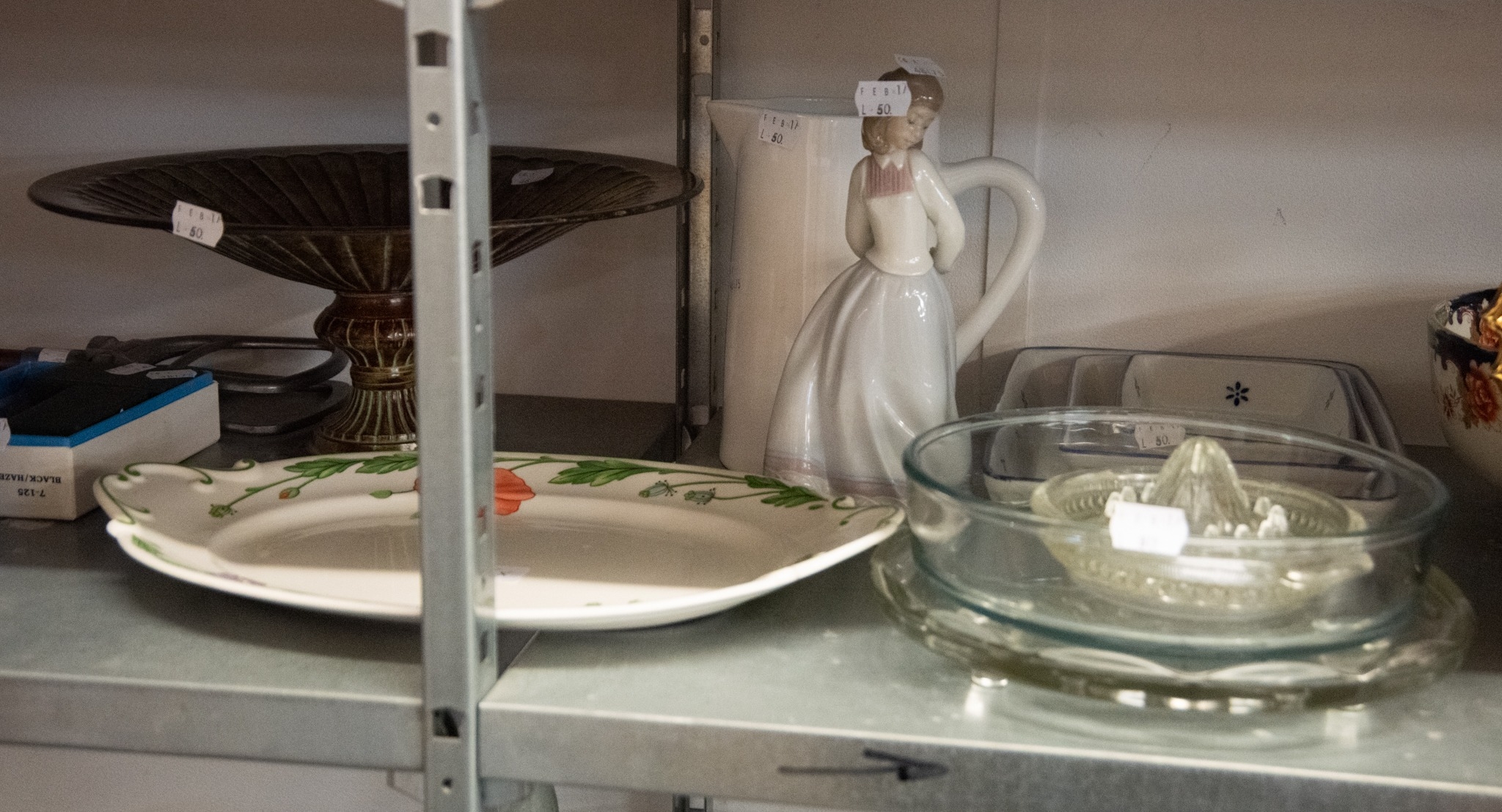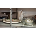 A SELECTION OF CERAMICS TO INCLUDE; LLADRO FIGURE OF A LADY HOLDING FLOWERS, VILLEROY AND BOCH (AMAPOLA) SERVING PLATE, A METAL BRASS VERDIGRIS RAISED DISH, A MAXWELL WILLIAM MILK/WATER JUG ETC..