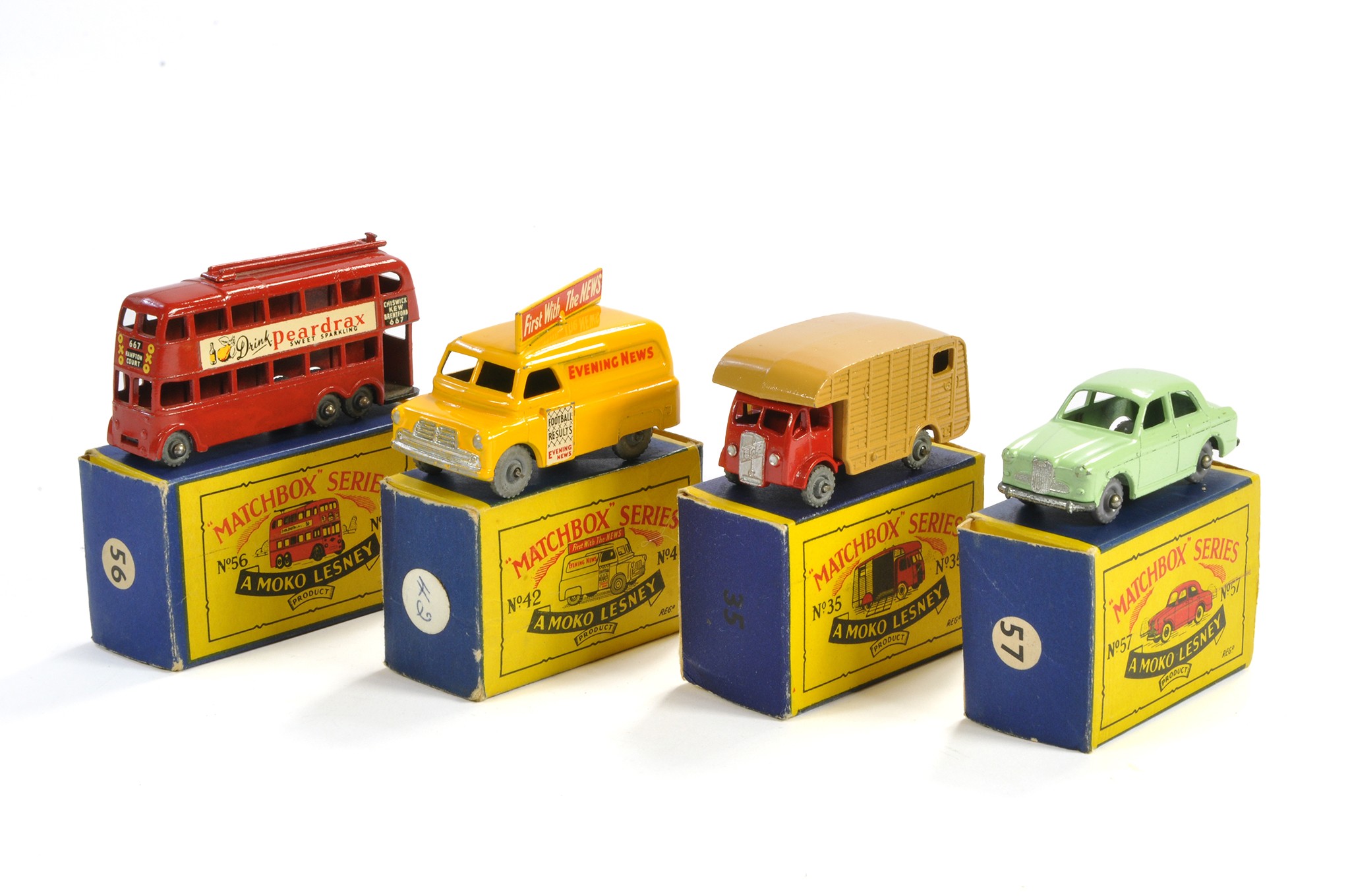 Matchbox Regular wheels comprising four boxed issues. To include No. 35 Horsebox, No. 42 Evening News Van, No. 56 Trolleybus and No. 57 Wolseley 1500. Generally very good to excellent in good to very good boxes (do have sticker labels on).