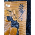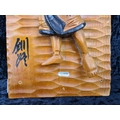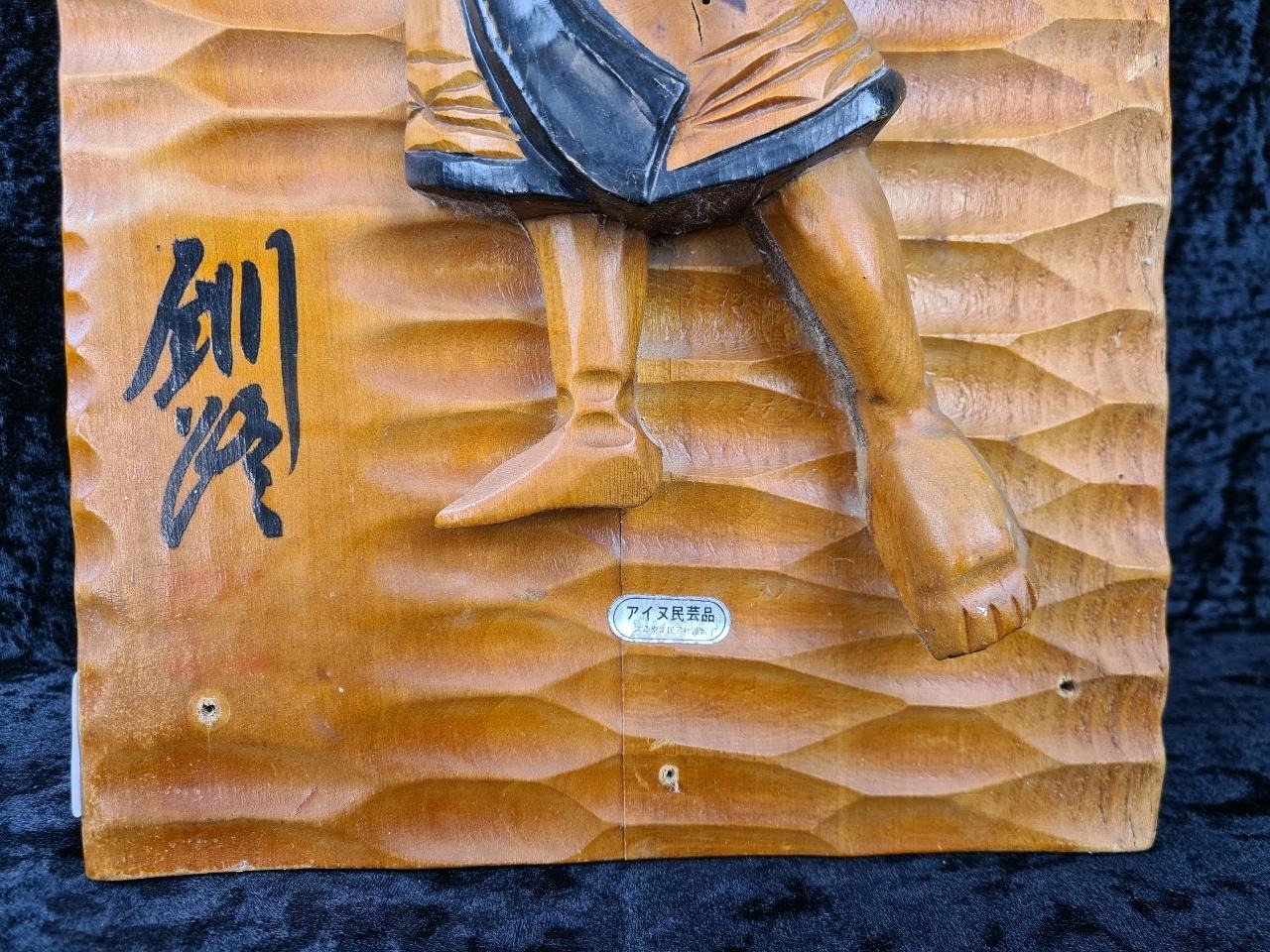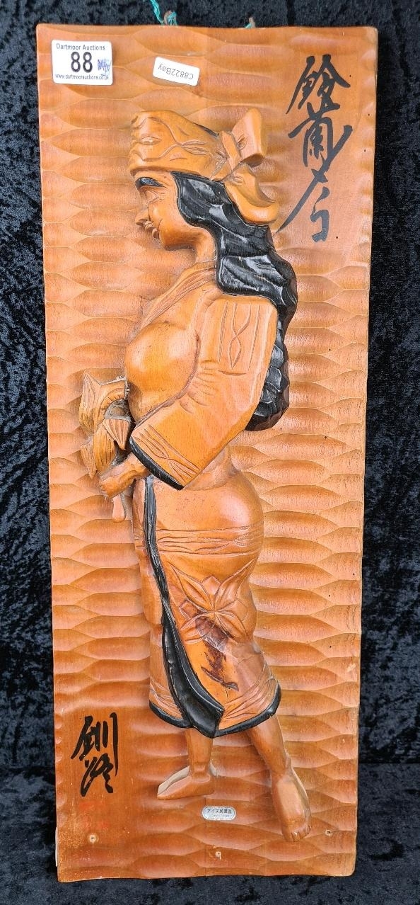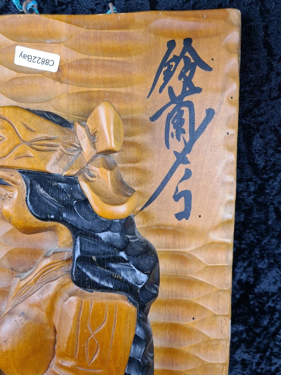 Vintage Japanese carved wooden plaque depicting a fisherman. Approx H61 x W23cm.