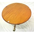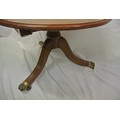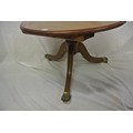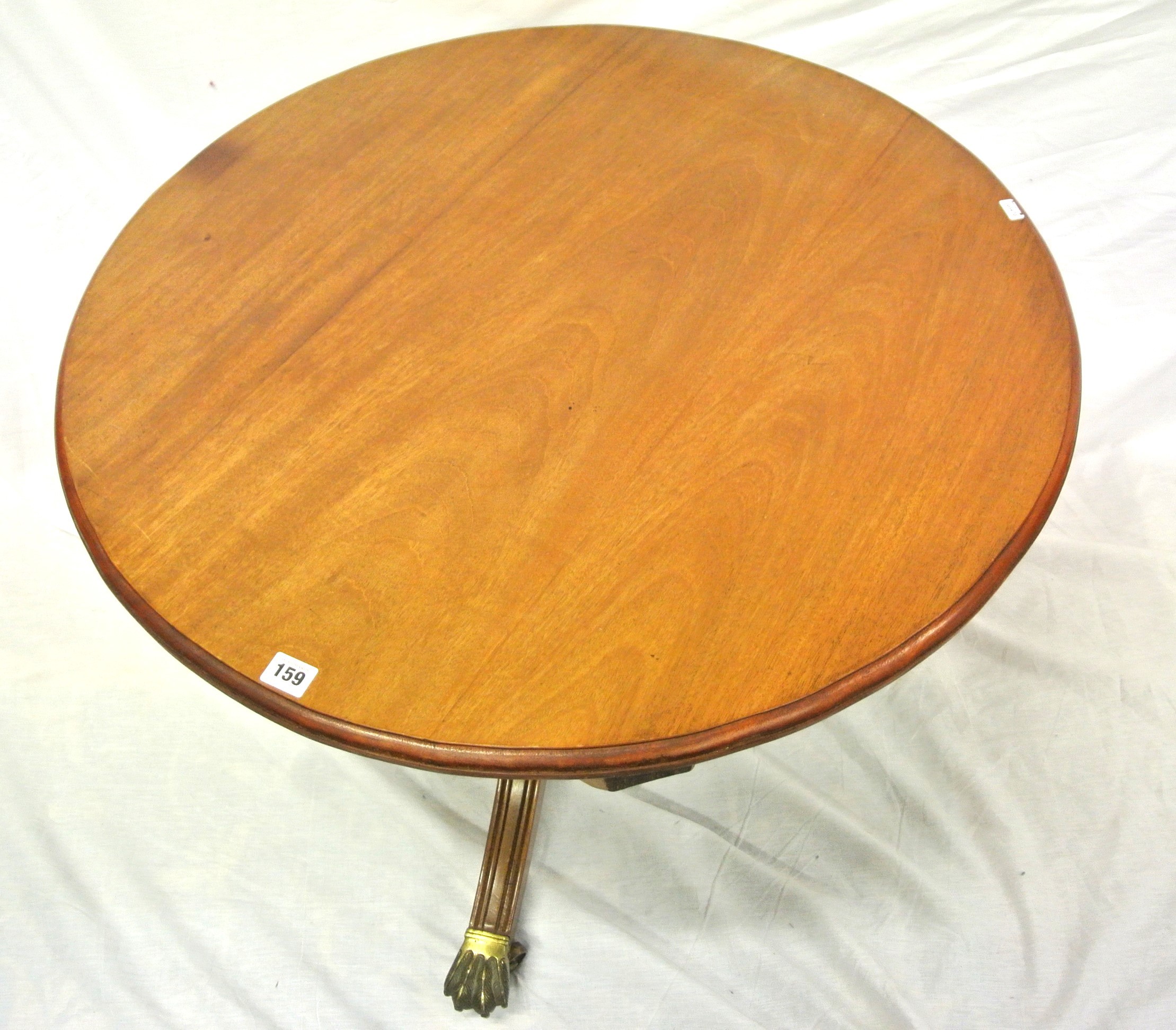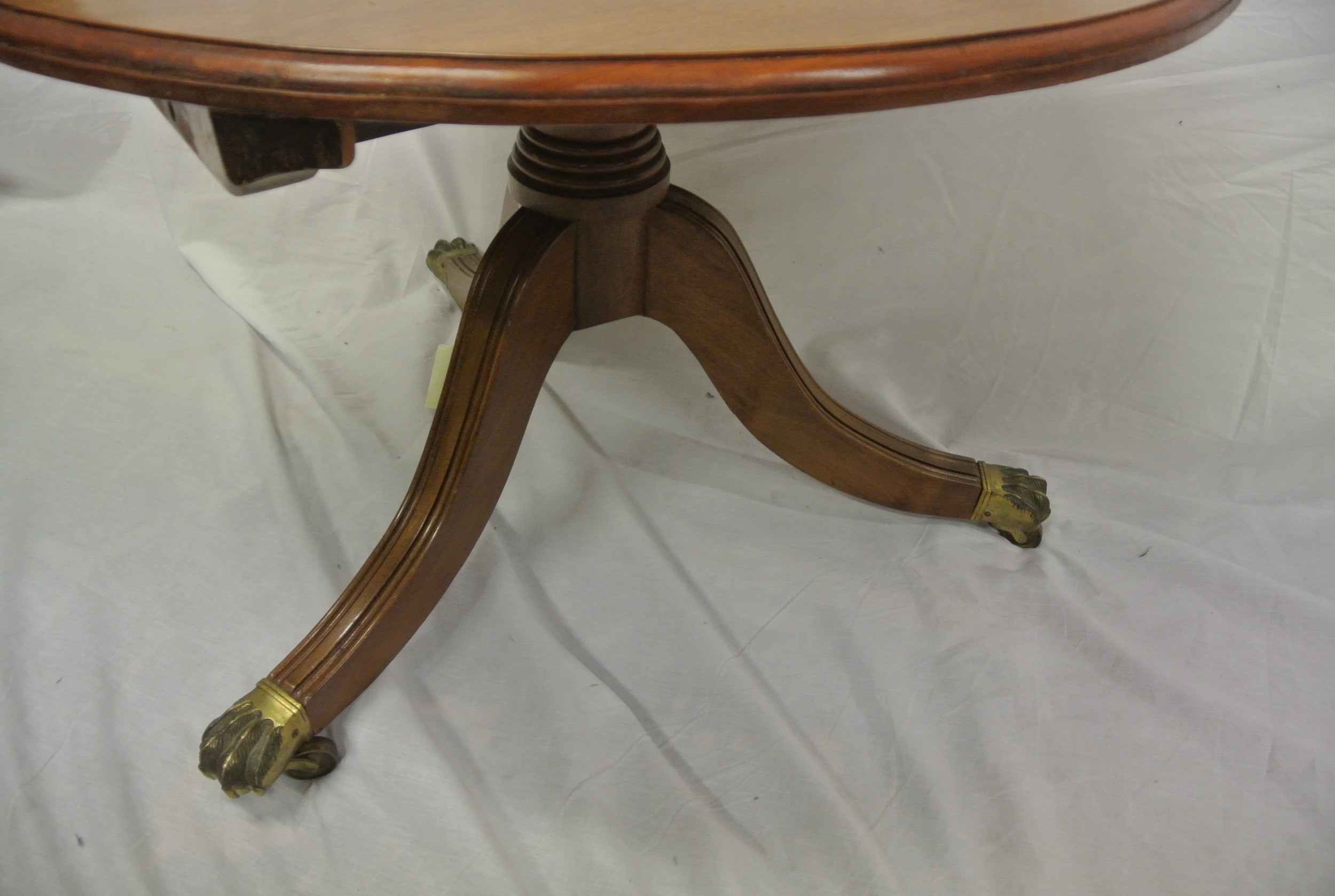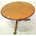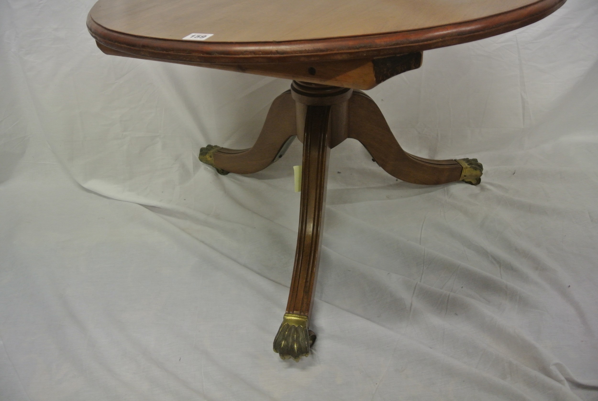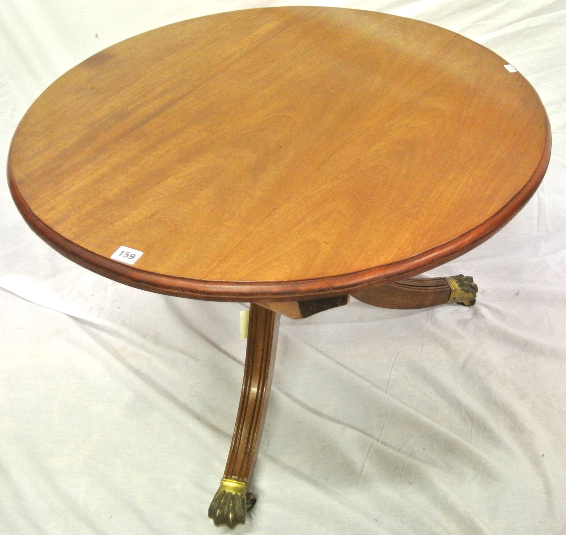 Victorian mahogany round coffee table with baluster column, on reeded splayed tripod with brass lion claw feet, on casters