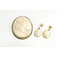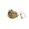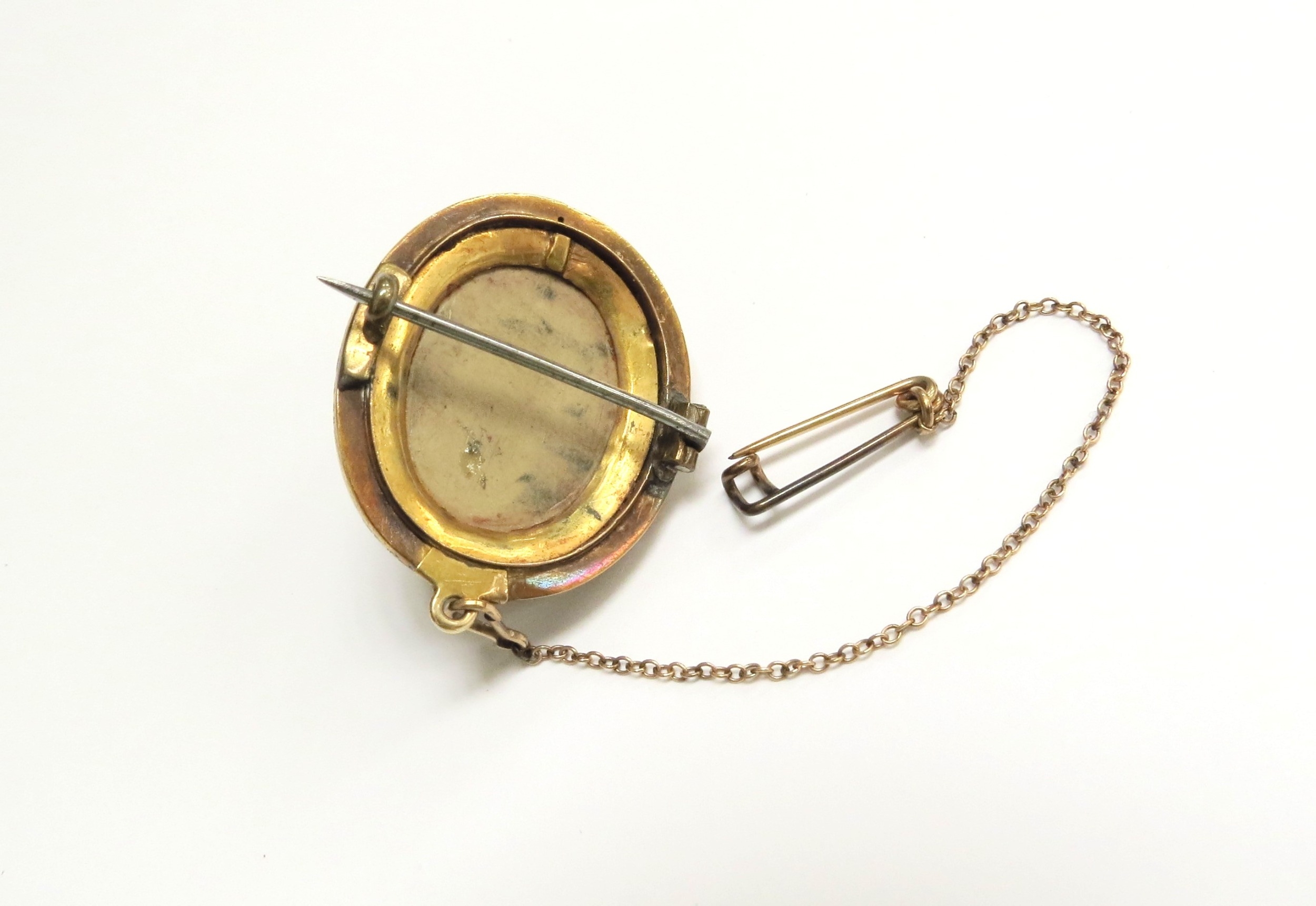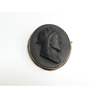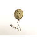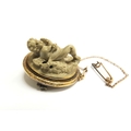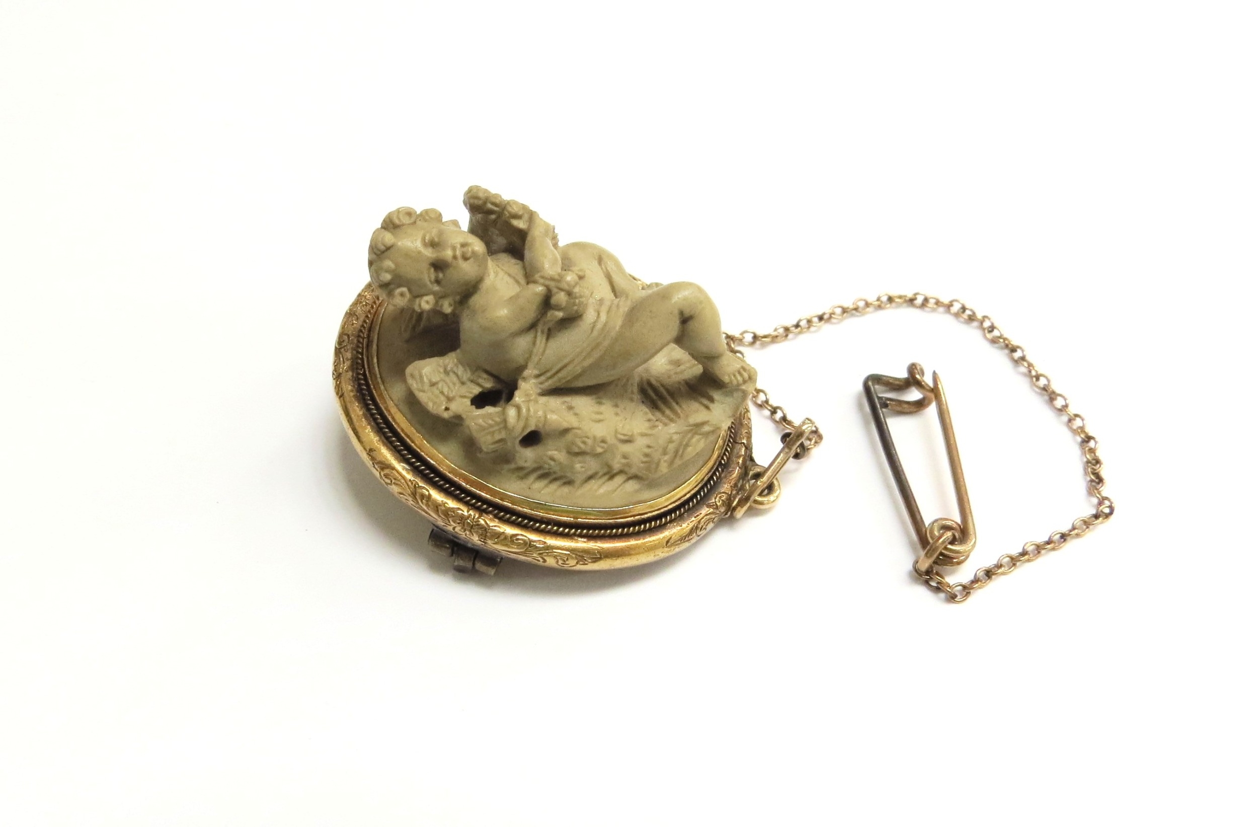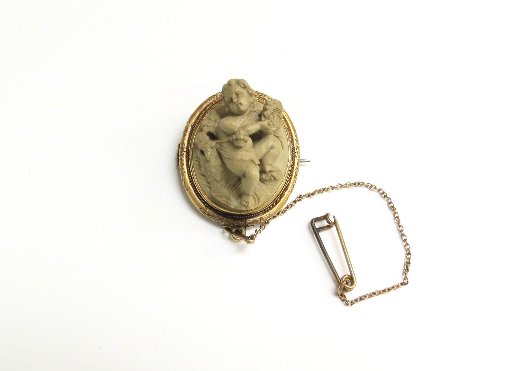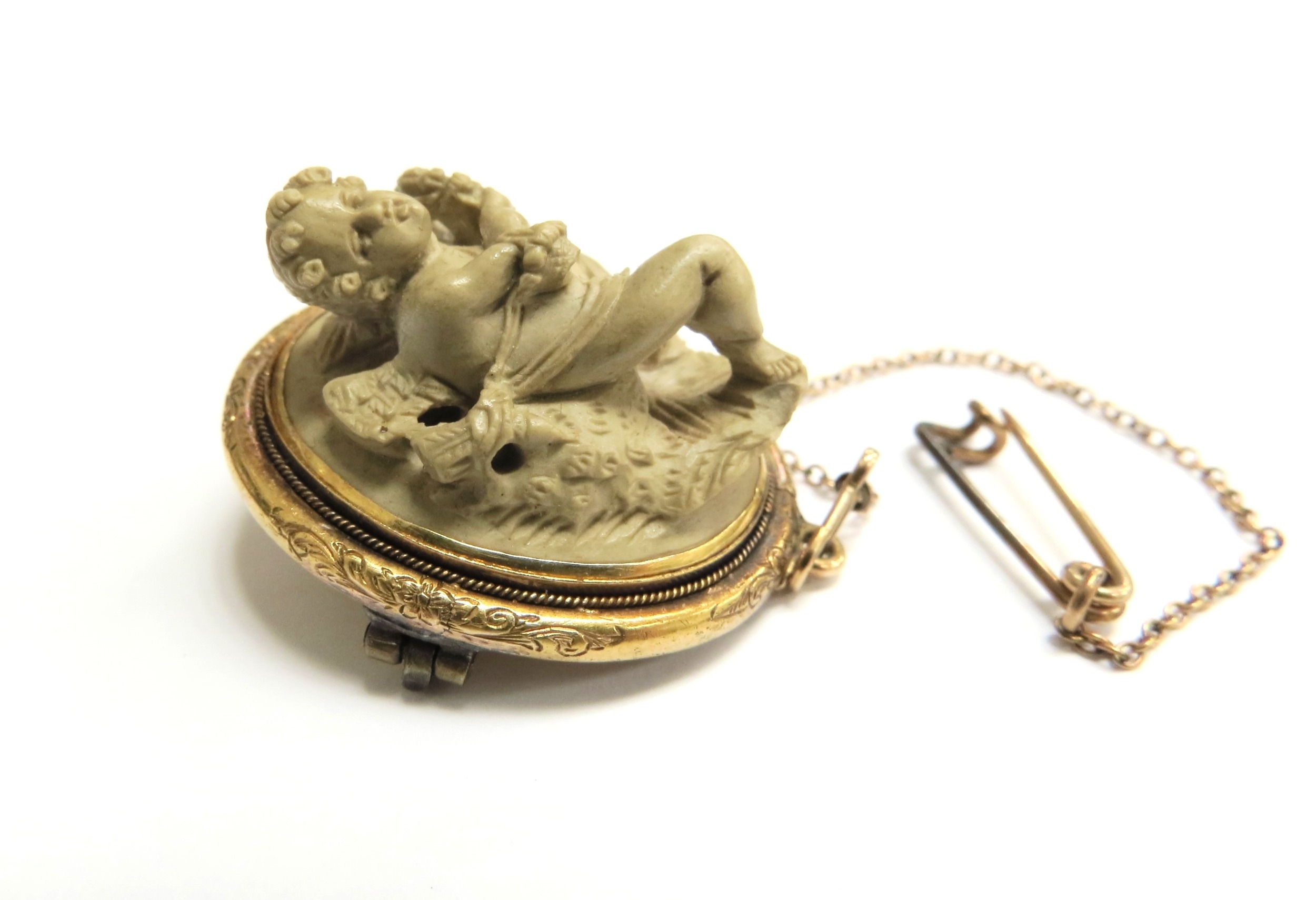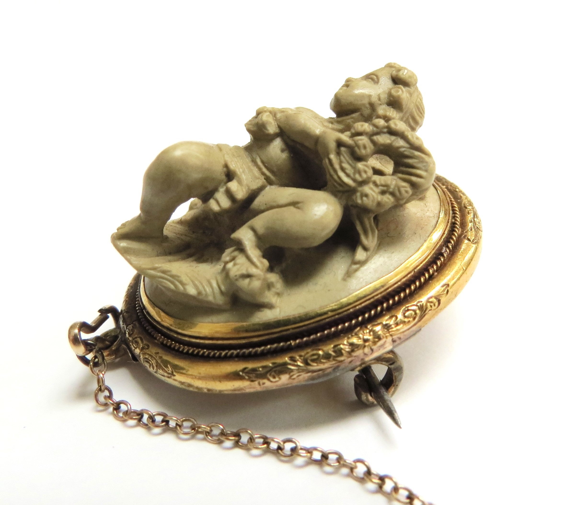 A carved lava cameo brooch in high relief of a Putto sticking out his tongue, unmarked frame, 3cm x 2.5cm