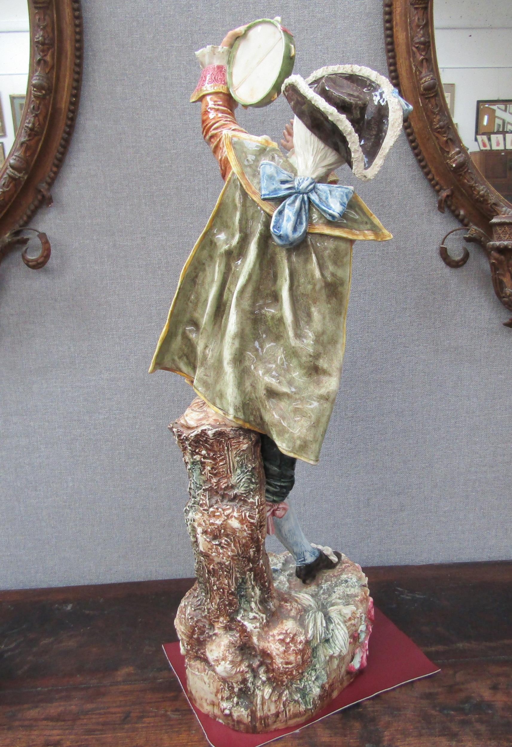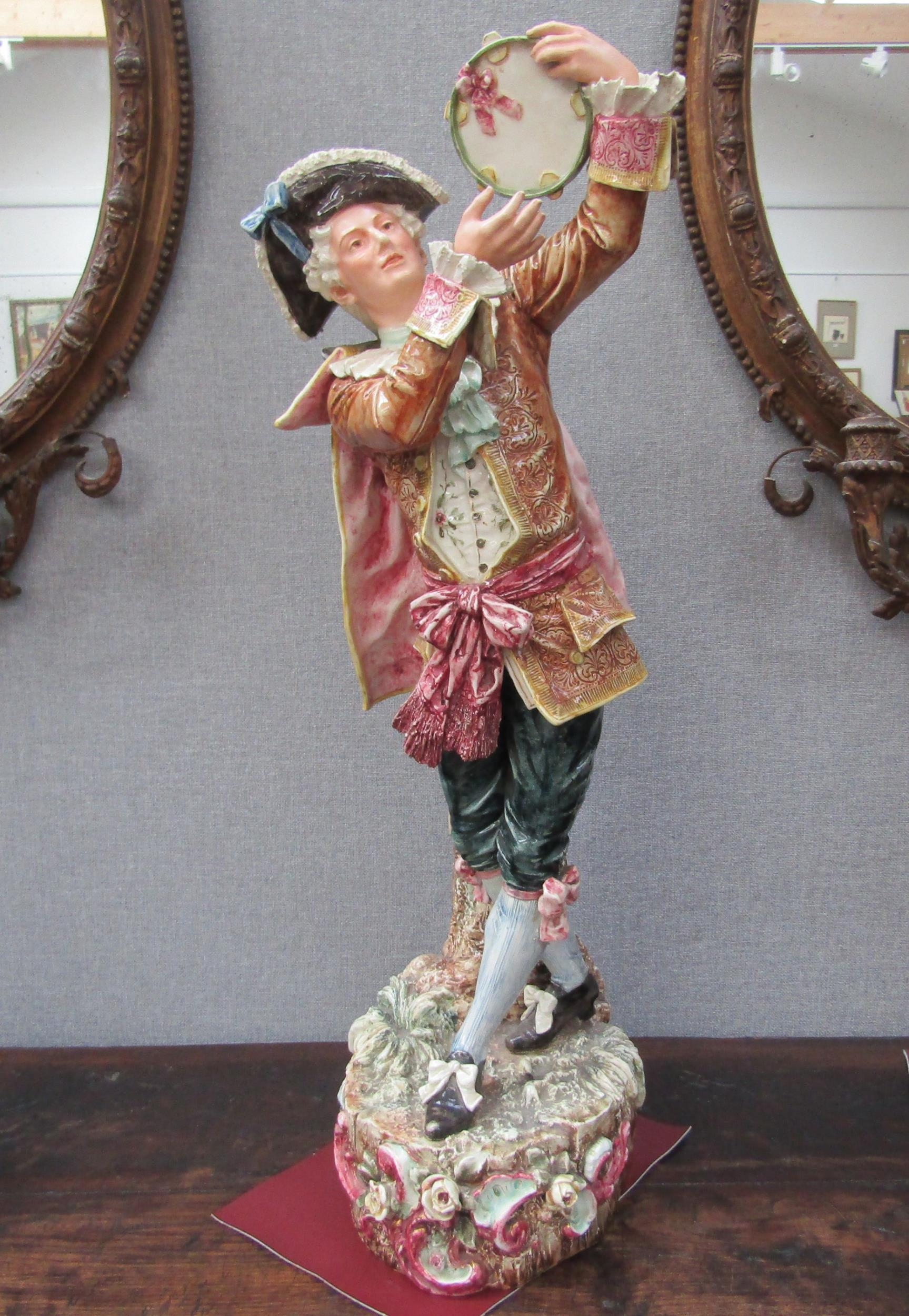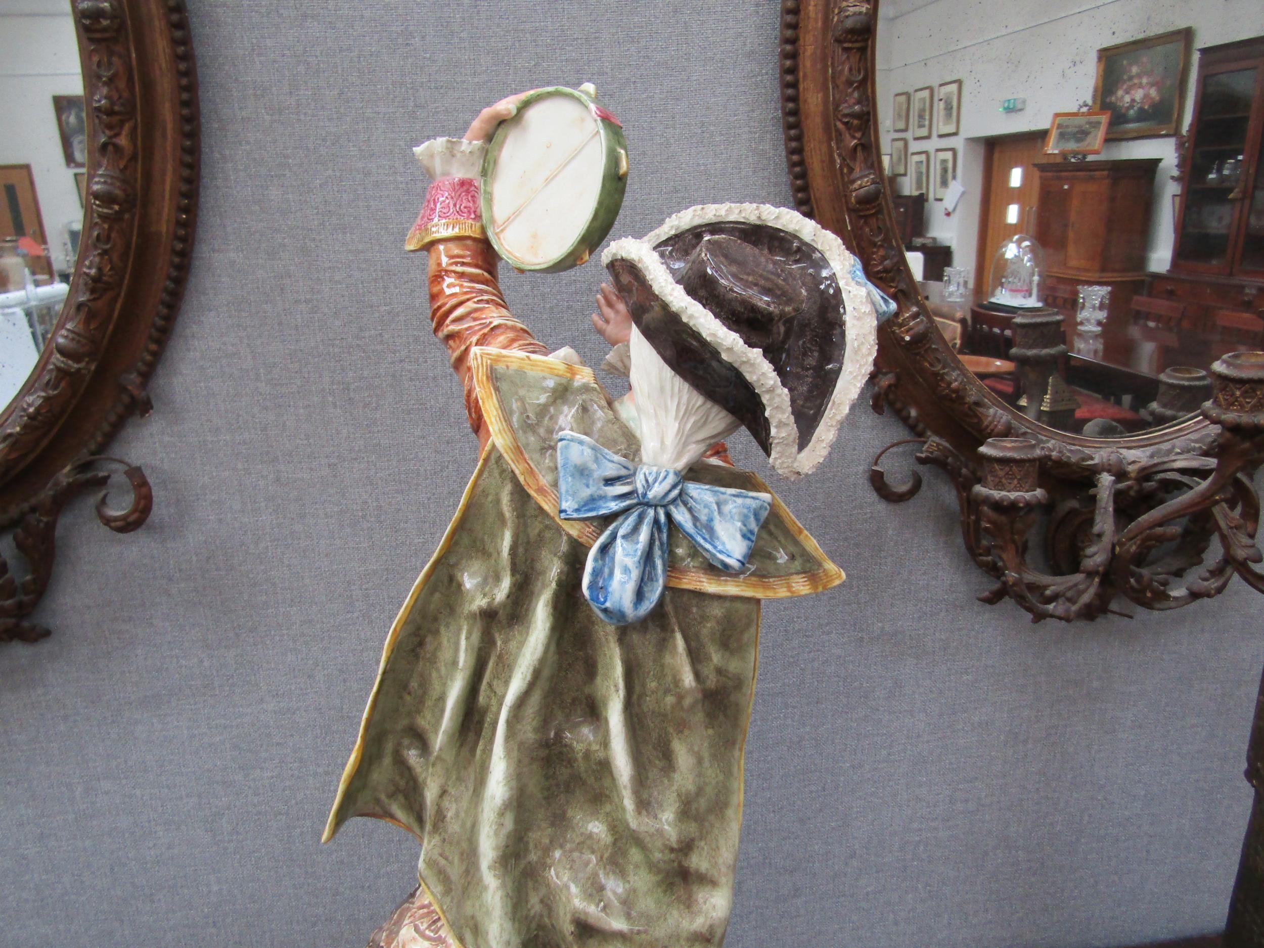 An early 20th Century ceramic figure of a gent with tambourine, 78cm height
