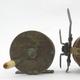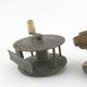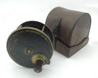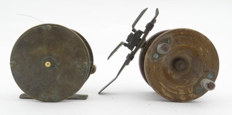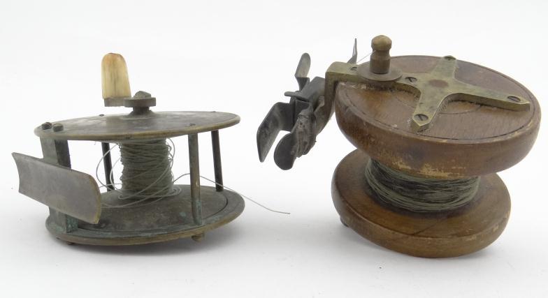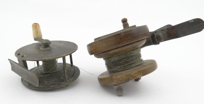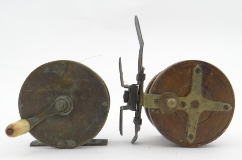Two antique fishing reels comprising a brass example with bone winder and a wooden example with brass spider back, the larger 7cm diameter
