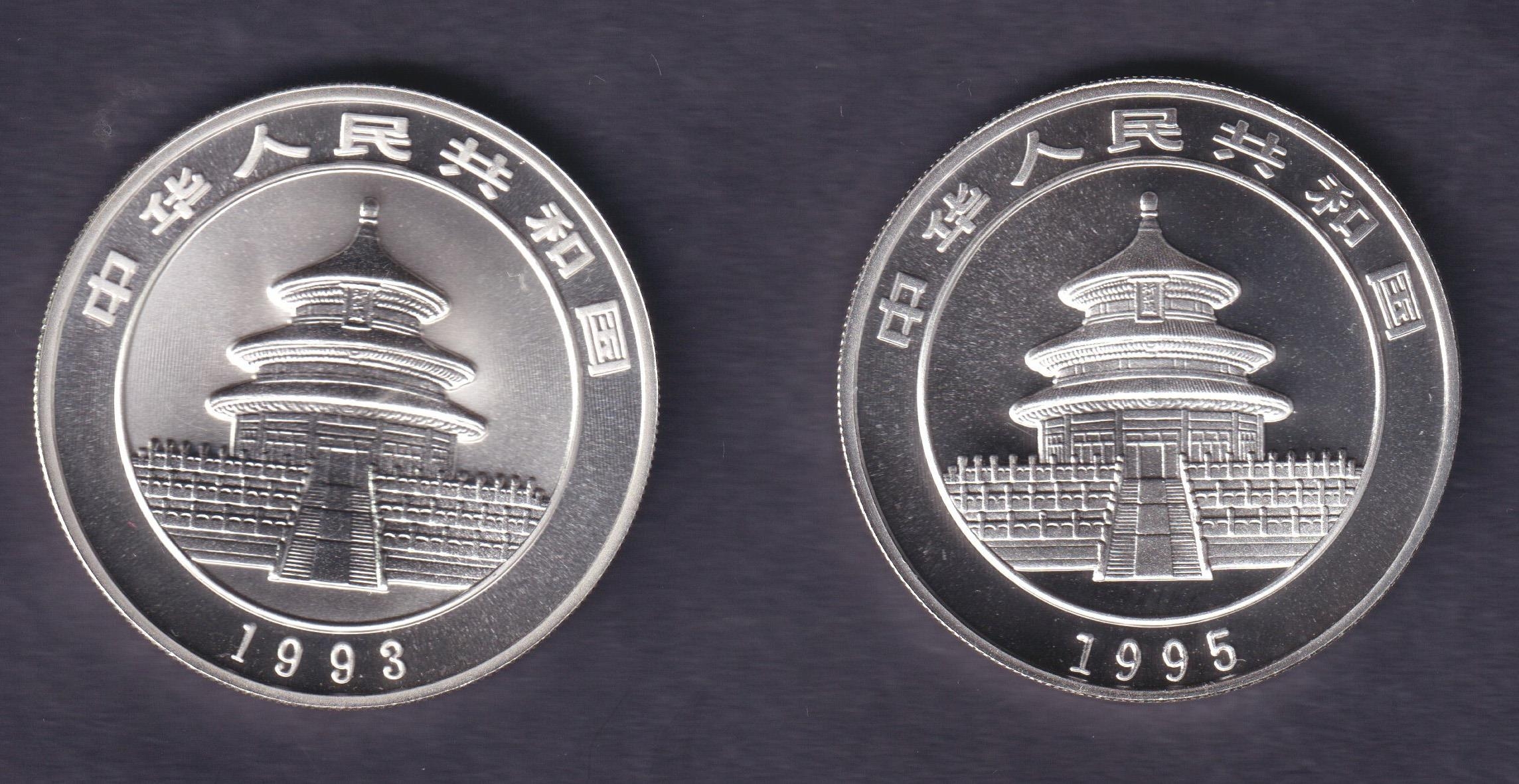 A pair of Chinese 10 Yuan 1oz coins from the Silver Panda Series, dated 1993 & 1995, each struck in .999 Silver., with CoAs