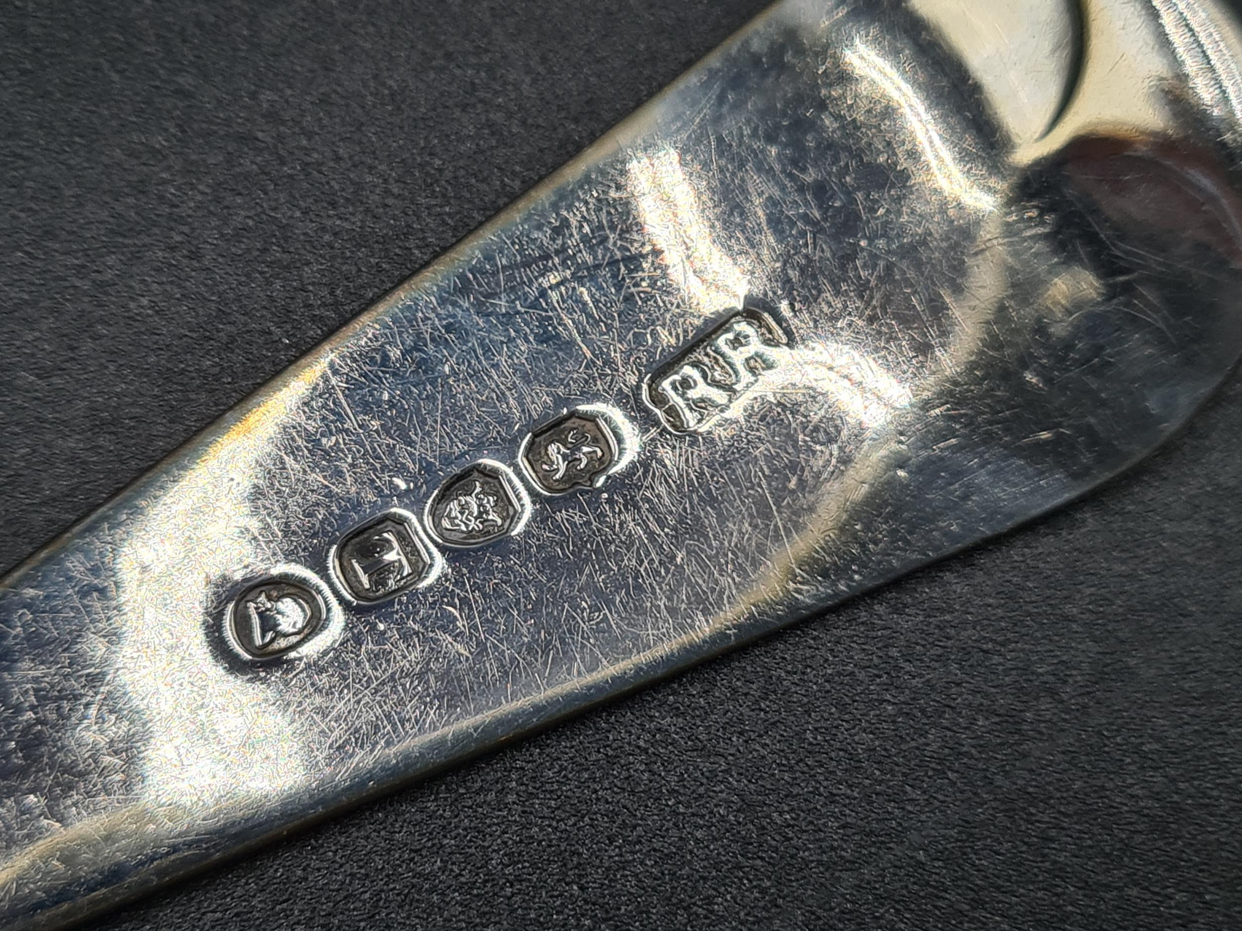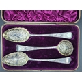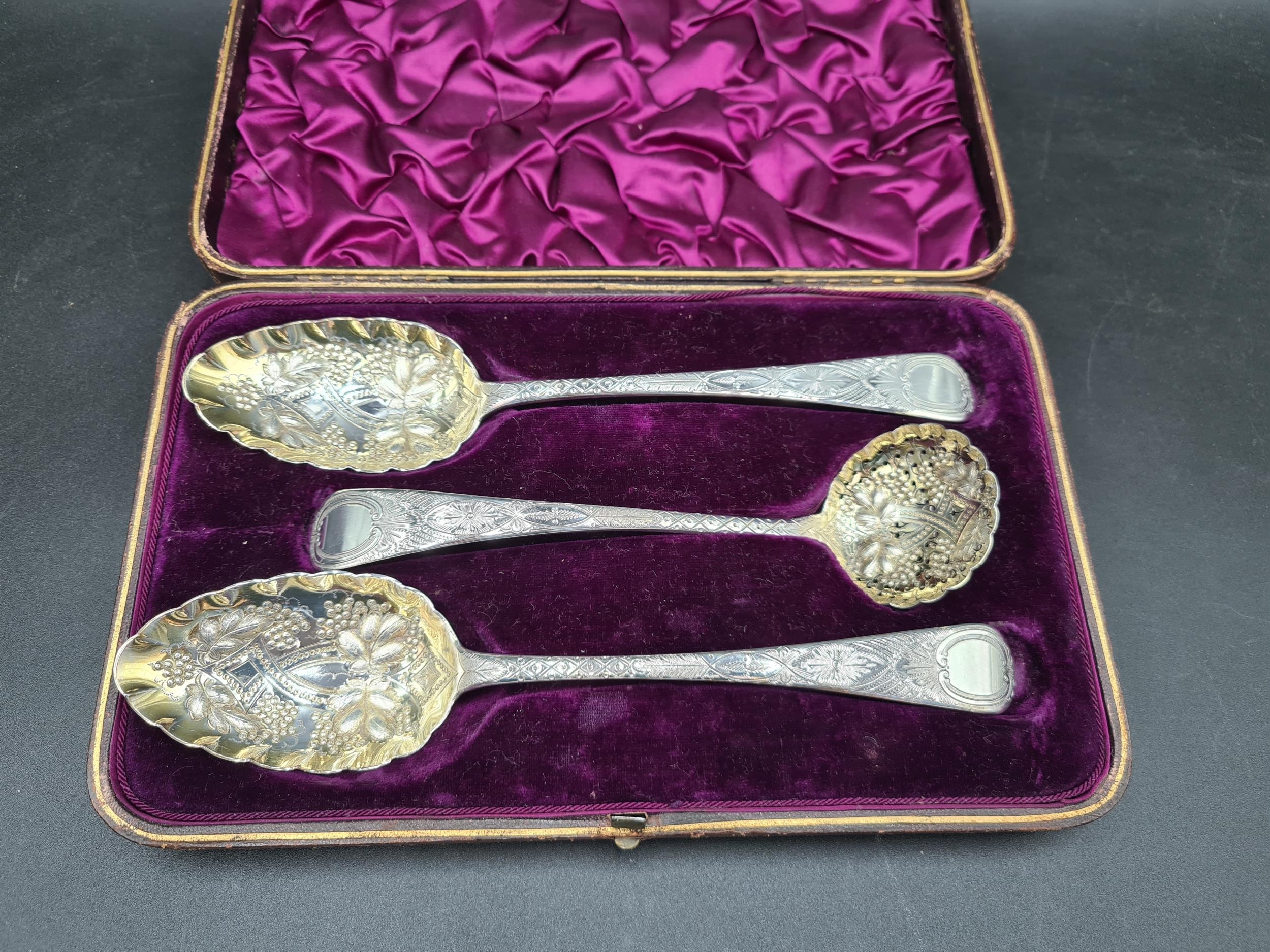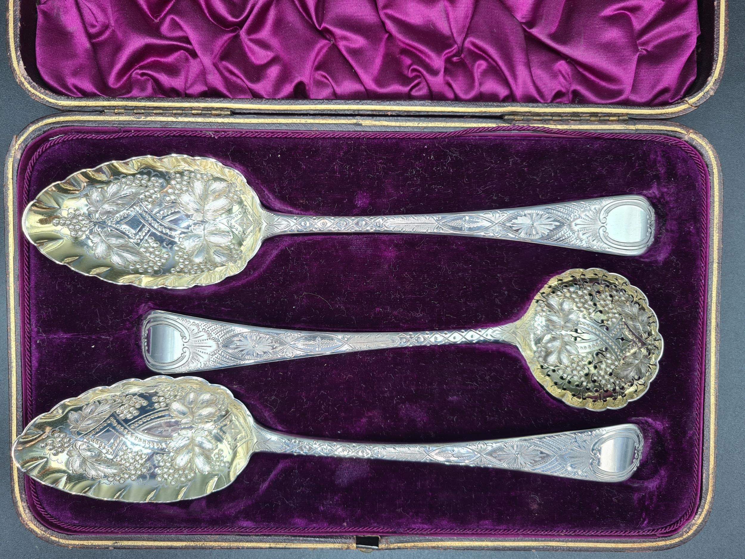 A pair of George III silver Berry Spoons and Sifting Ladle with embossed bowls and engraved stems, London 1814, maker: R.R, in case, 160gms