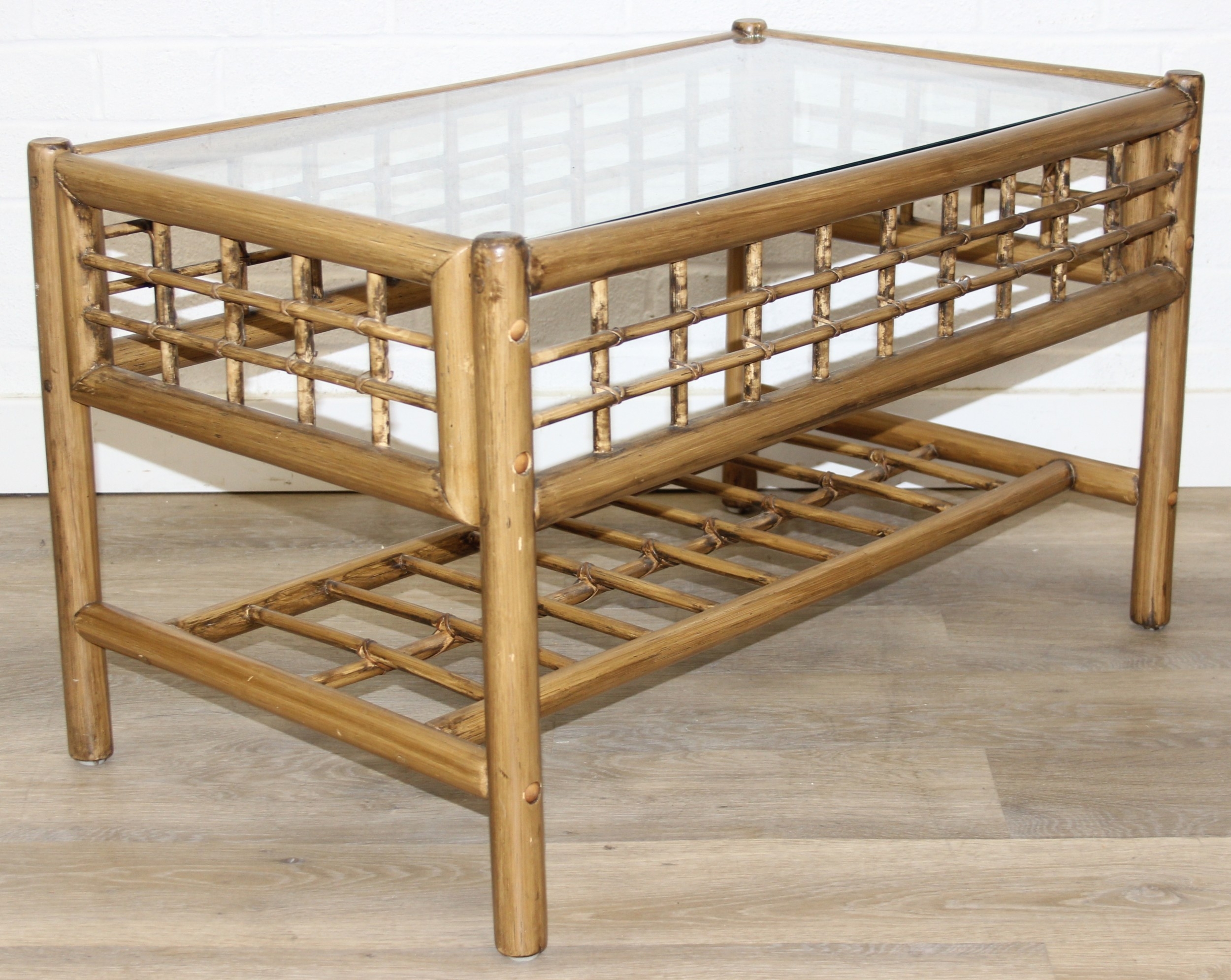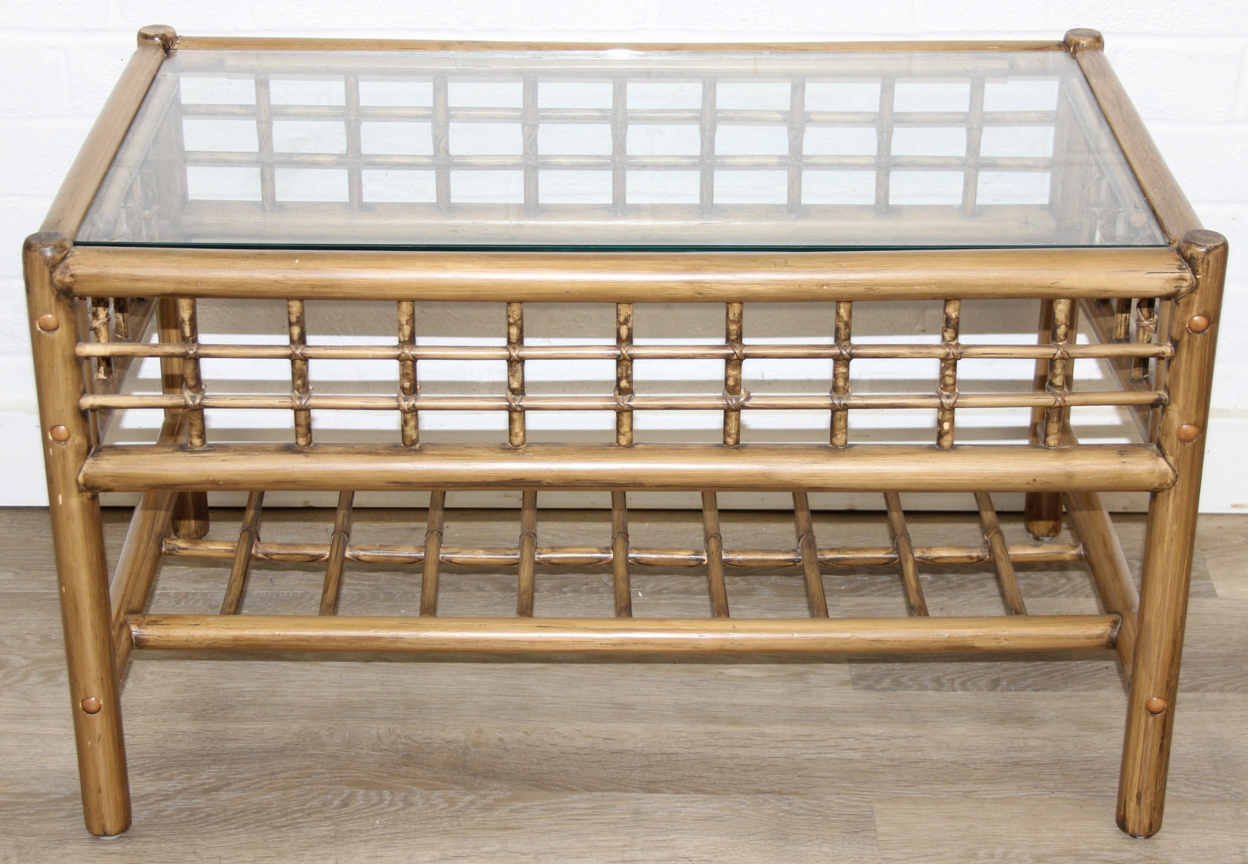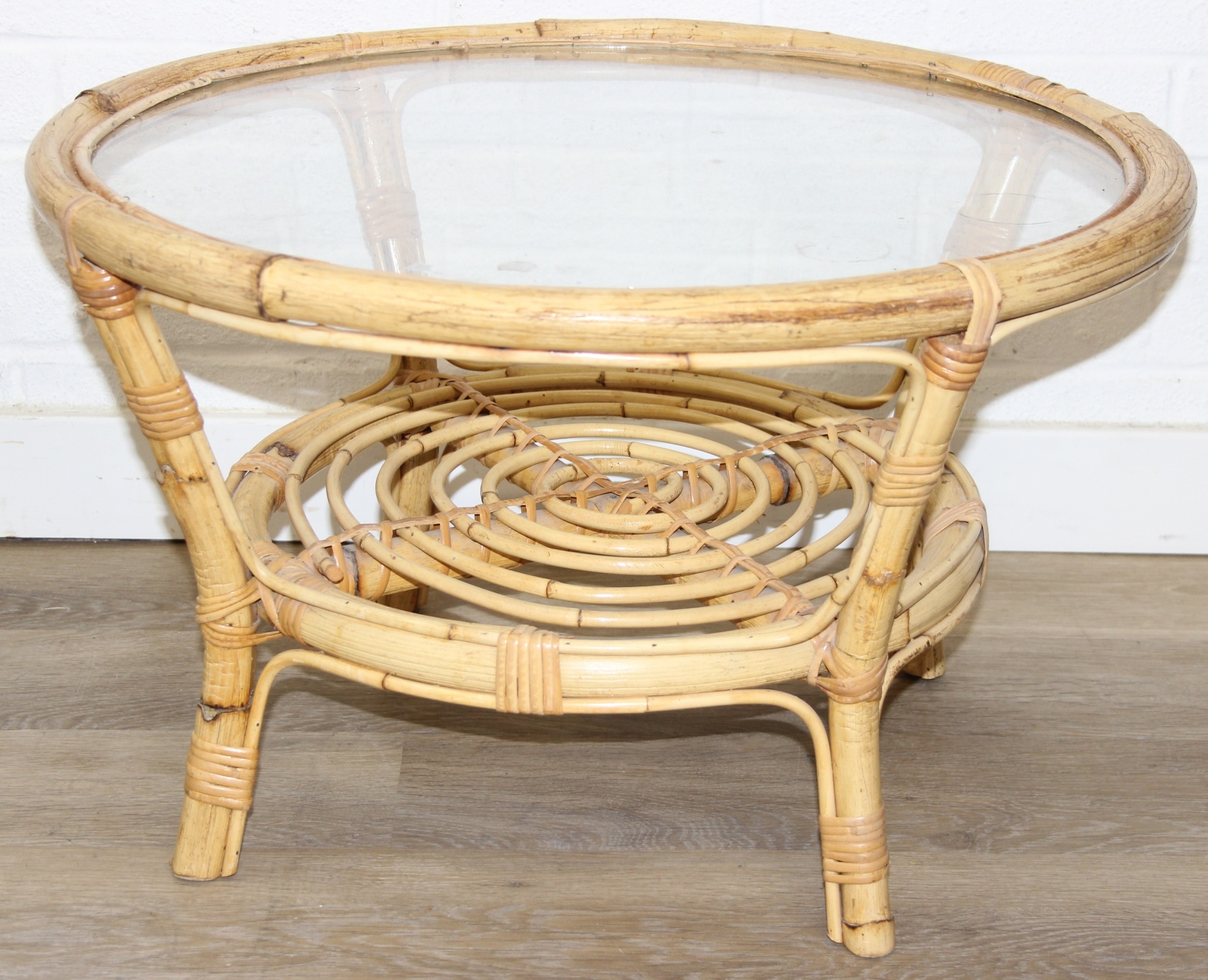 Two retro bamboo and glass coffee tables, one round the other rectangular, the largest 81cm x 49cm x 48cm [2]