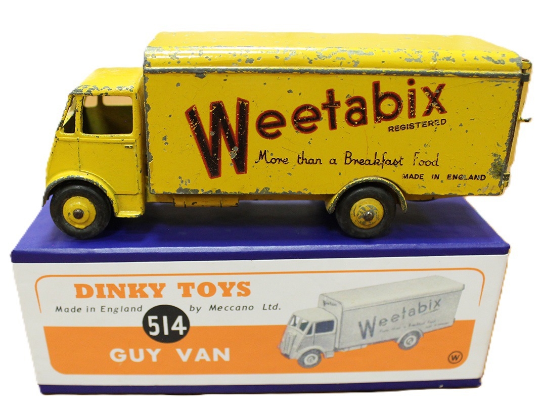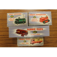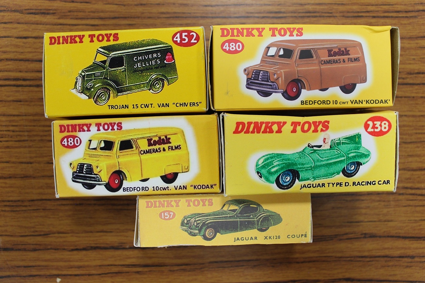 Dinky. Collection including Jaguar Coupe No 157, Jaguar No 238, Bedford "Kodak" No 480 (2), Trojan Van "Chivers" No 452, Guy Van No 514 and Blaw Knox Bulldozer No 514, generally good plus in excellent reproduction boxes. Qty 7 (T)