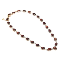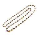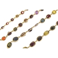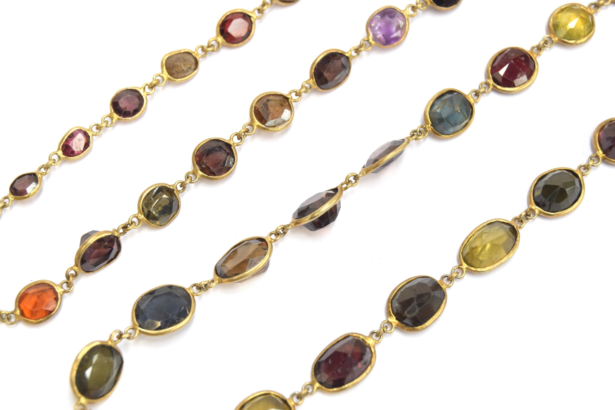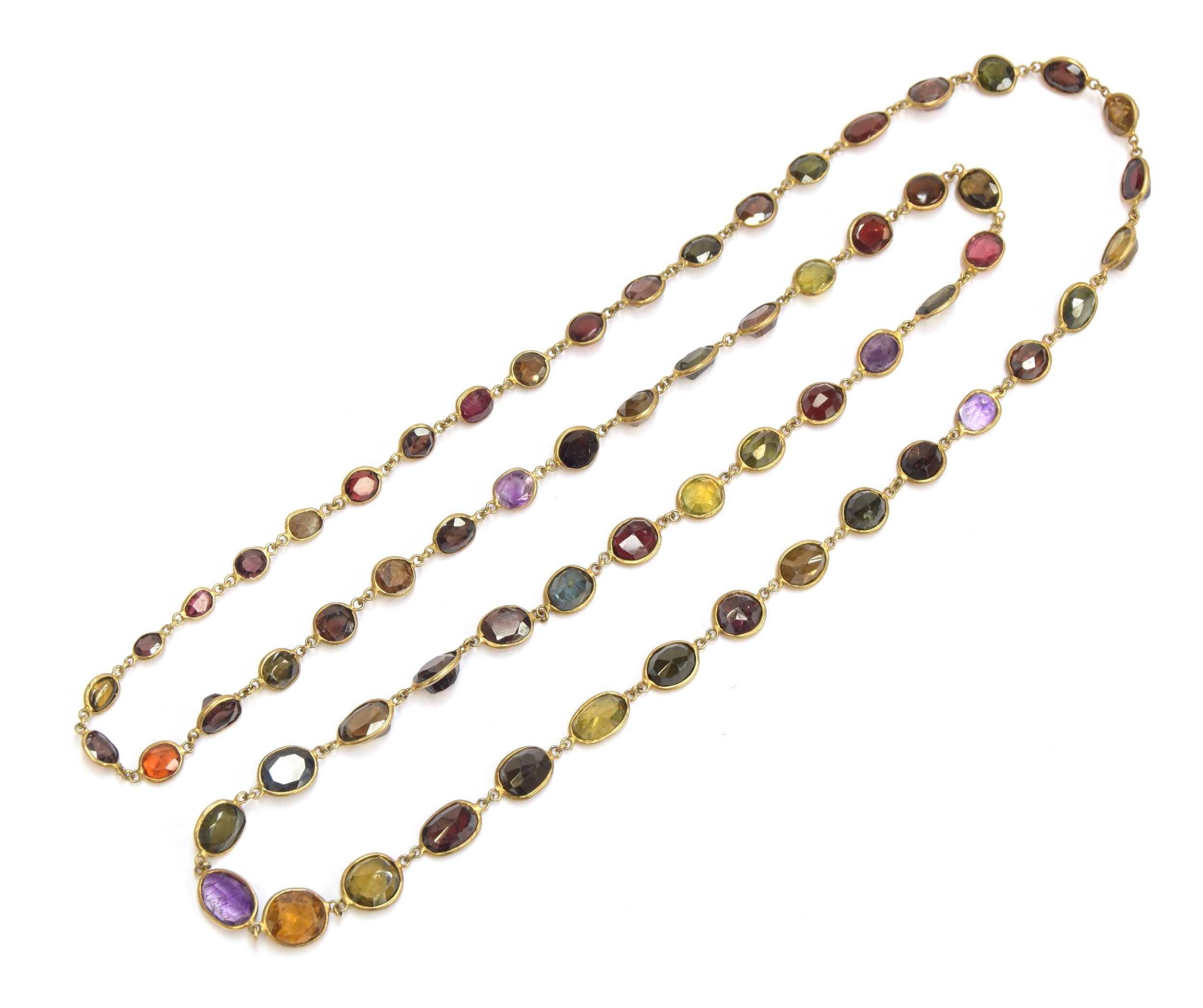 An early 20th century gold mounted multi gem set riviere necklace, the stones in bezel settings, to include amethysts, citrine, garnets and zircons, 39cm long, 27g