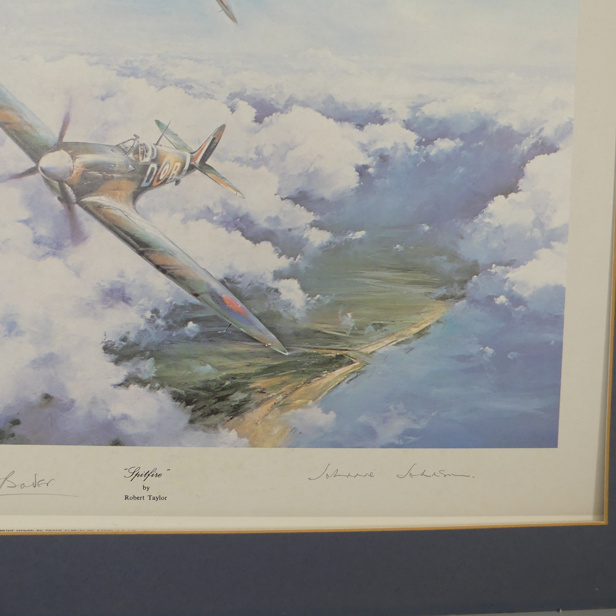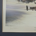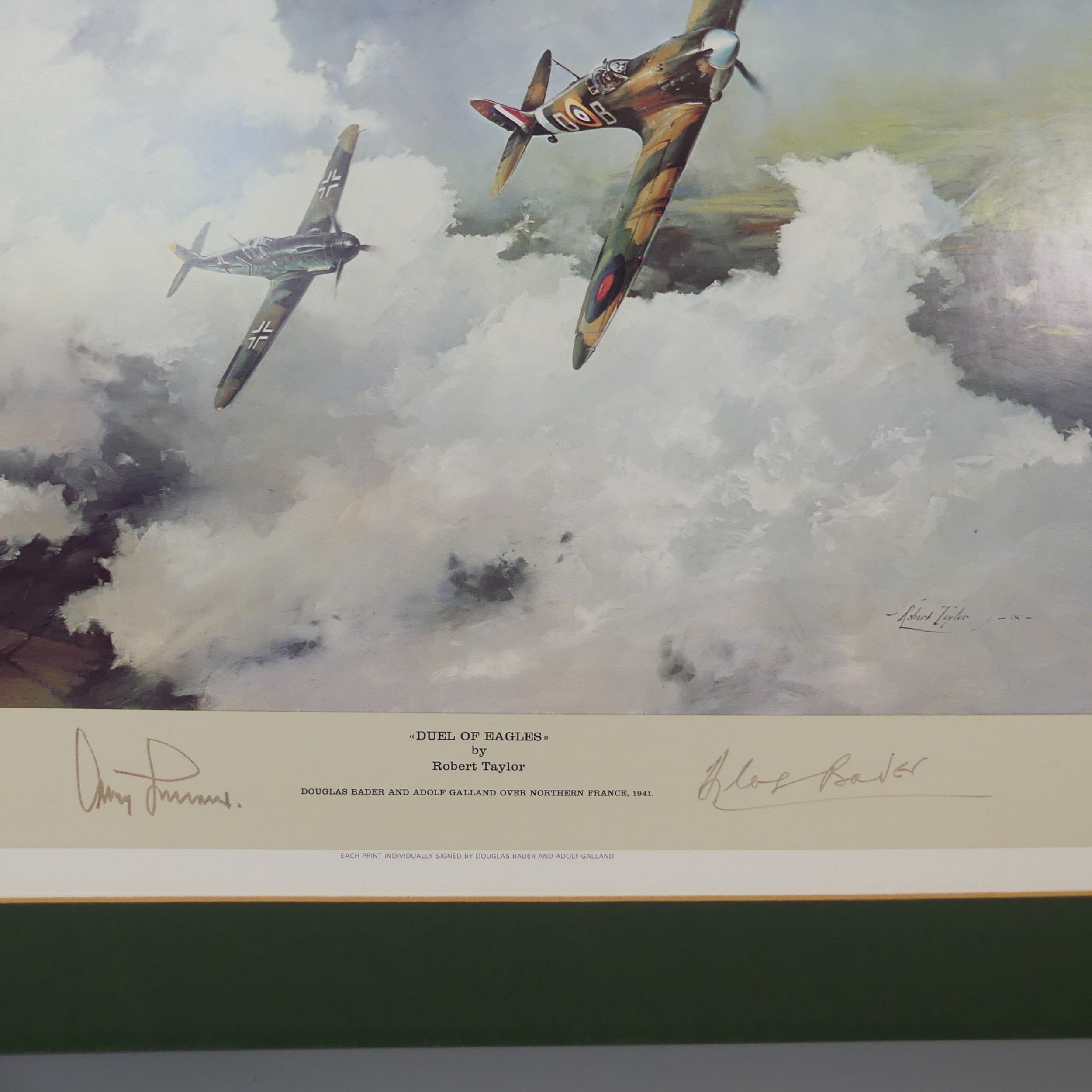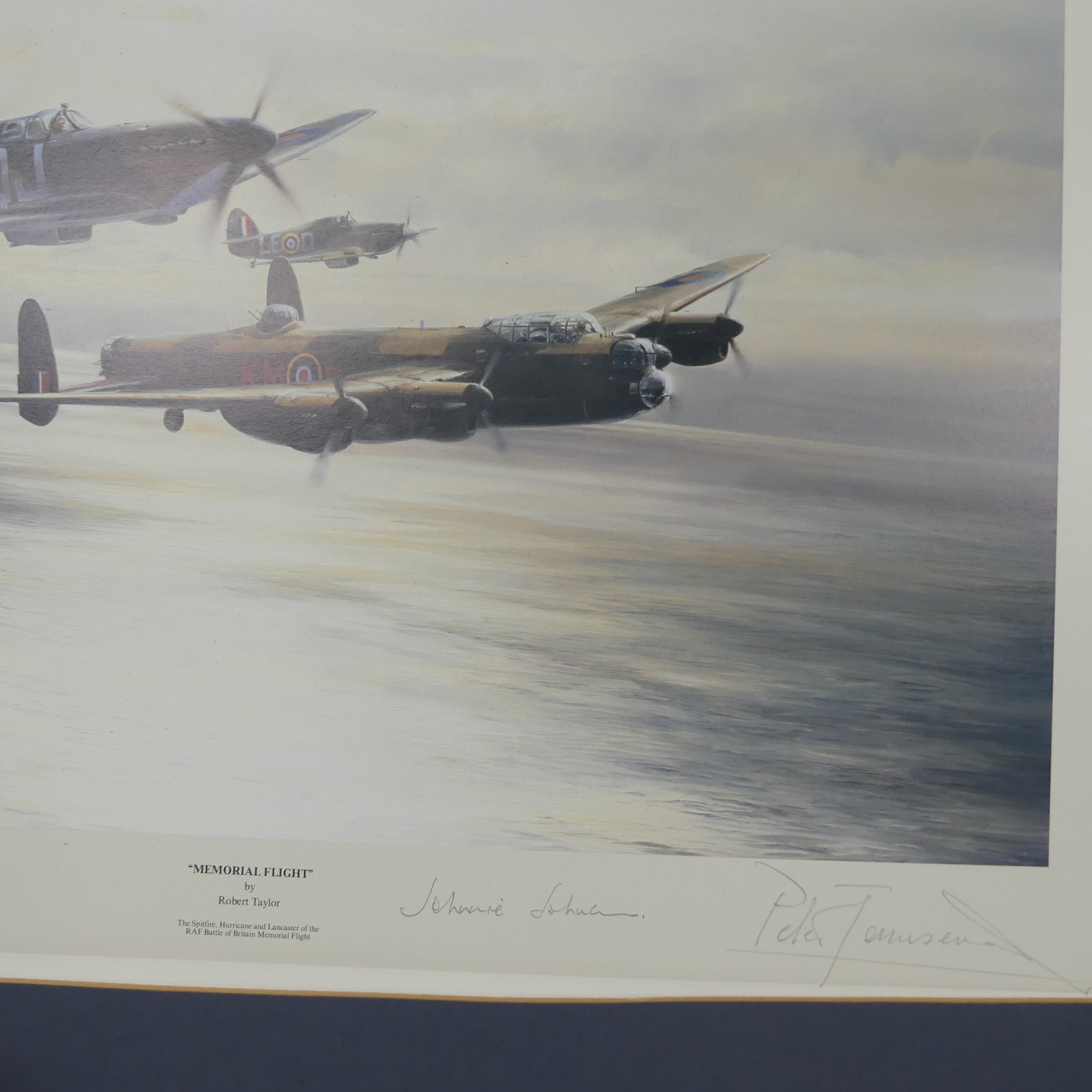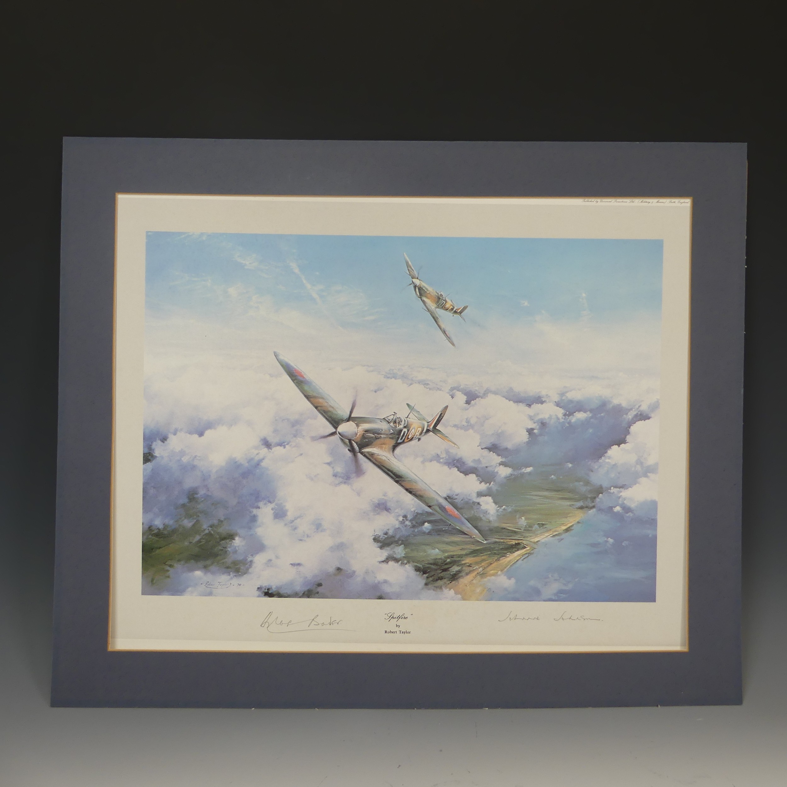 Robert Taylor, A WWII coloured Print titled 'Spitfire', signed by Douglas Bader and Johnnie Johnson, together with four other Robert Taylor coloured Prints, including ; 'Duel of Eagles', 'Memorial Flight' and 'Memphis Belle', all signed by pilots(5)