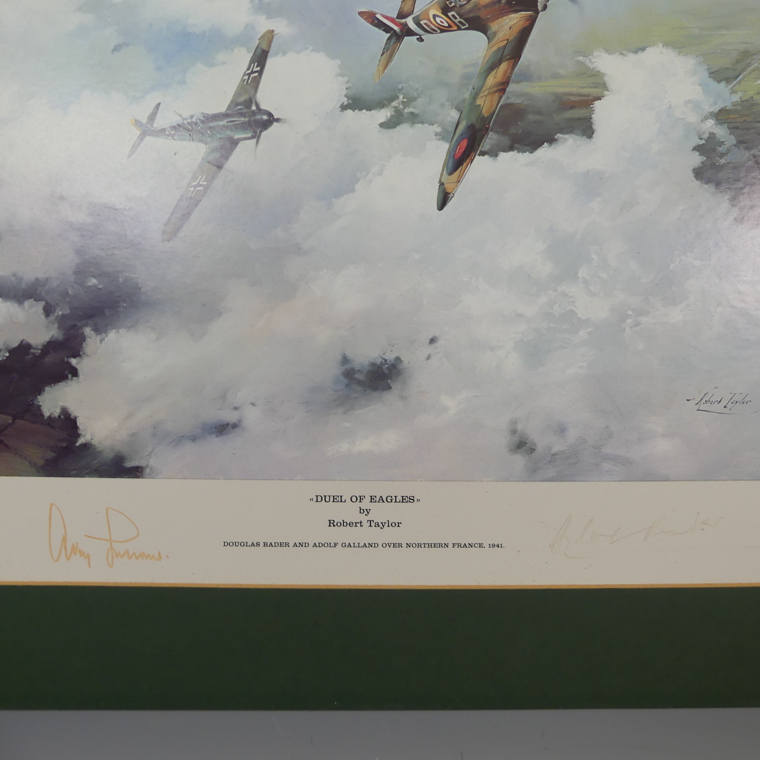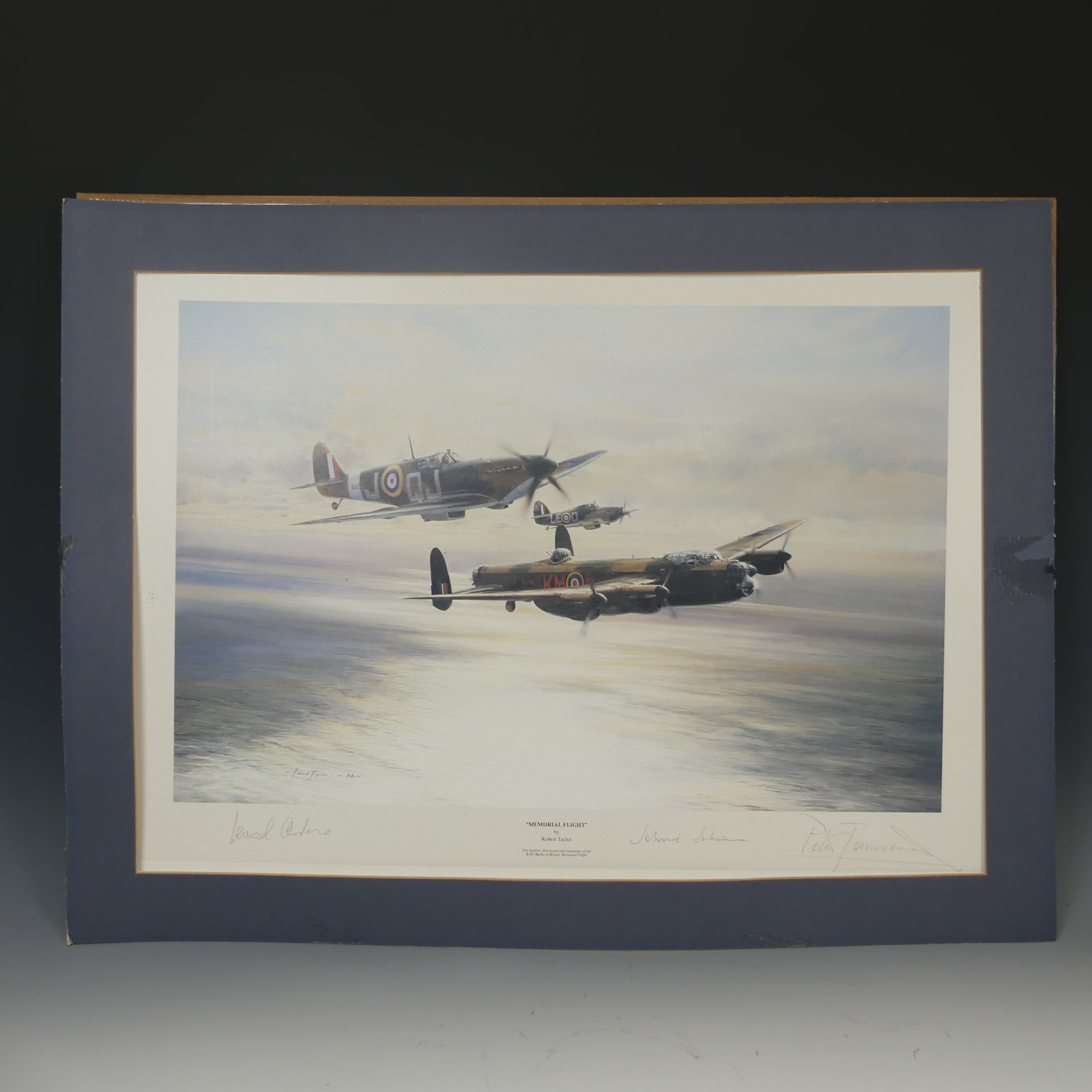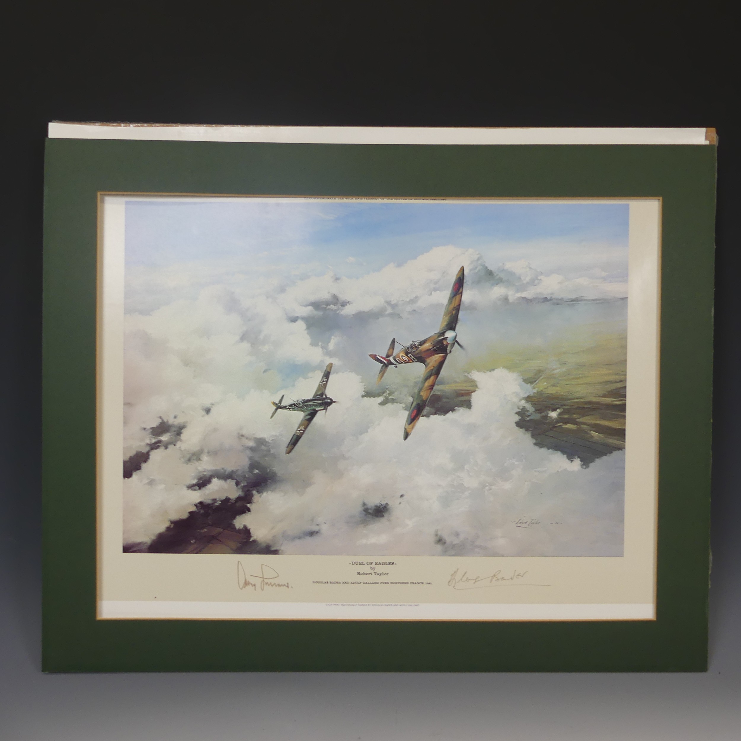 Robert Taylor, A WWII coloured Print titled 'Spitfire', signed by Douglas Bader and Johnnie Johnson, together with four other Robert Taylor coloured Prints, including ; 'Duel of Eagles', 'Memorial Flight' and 'Memphis Belle', all signed by pilots(5)