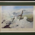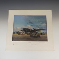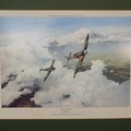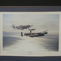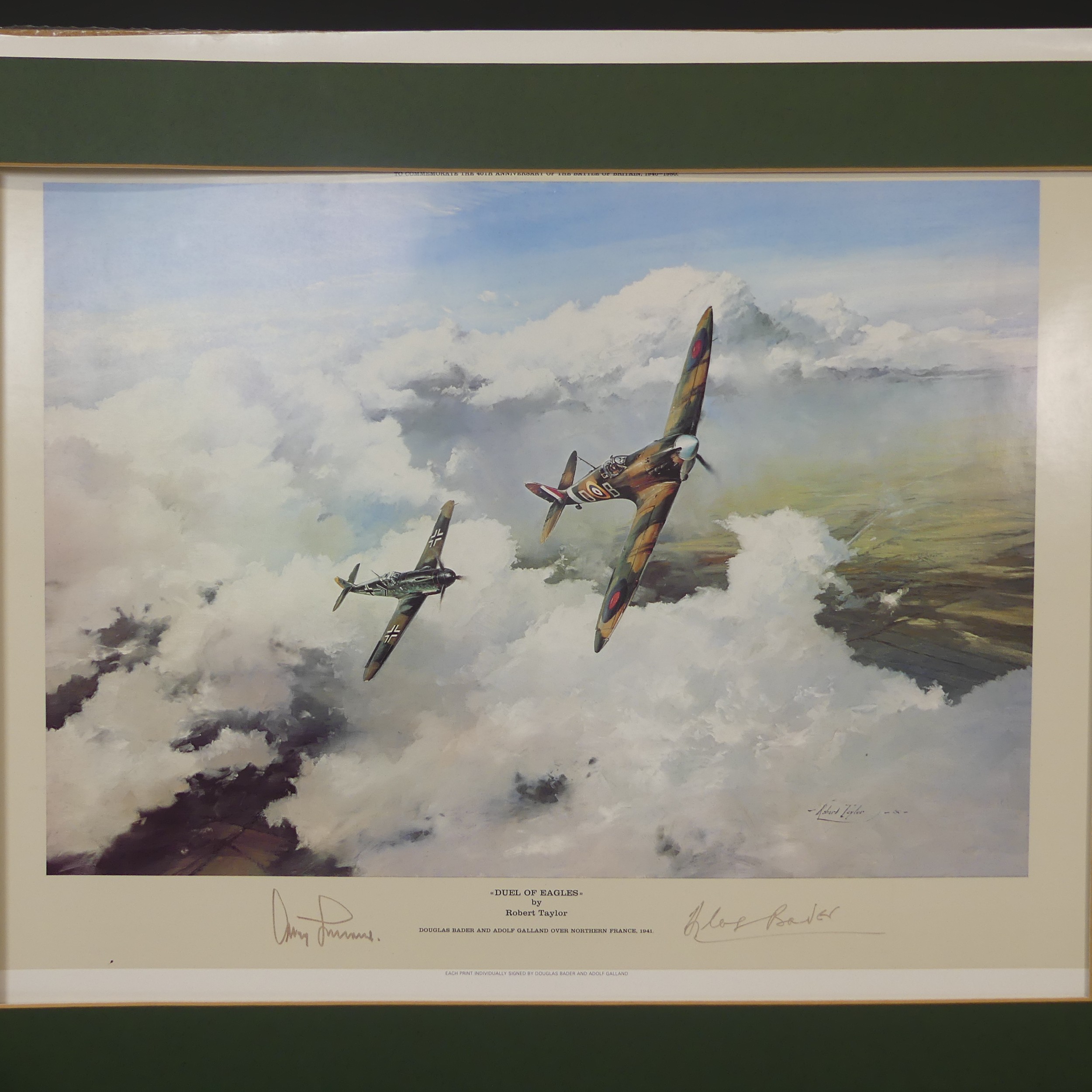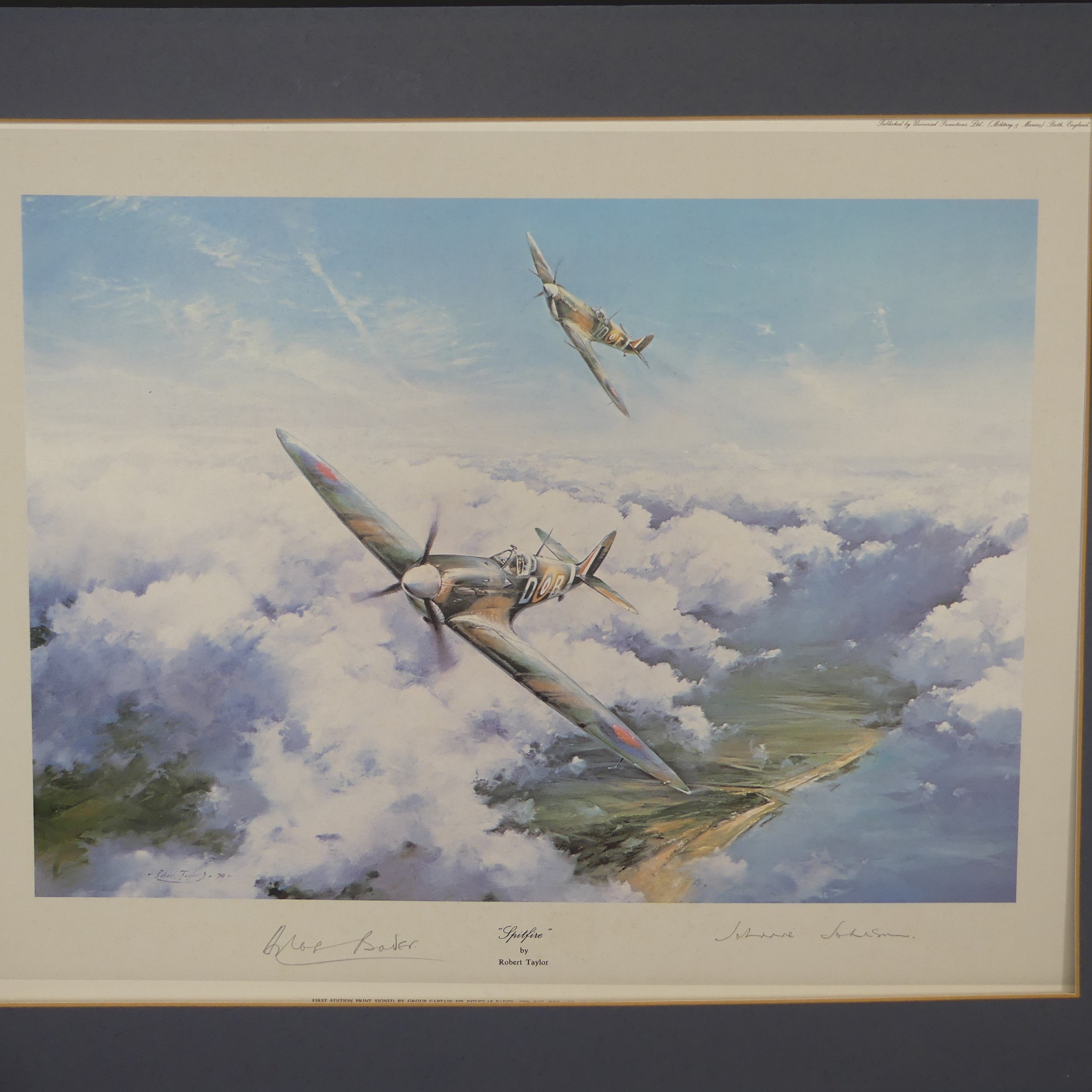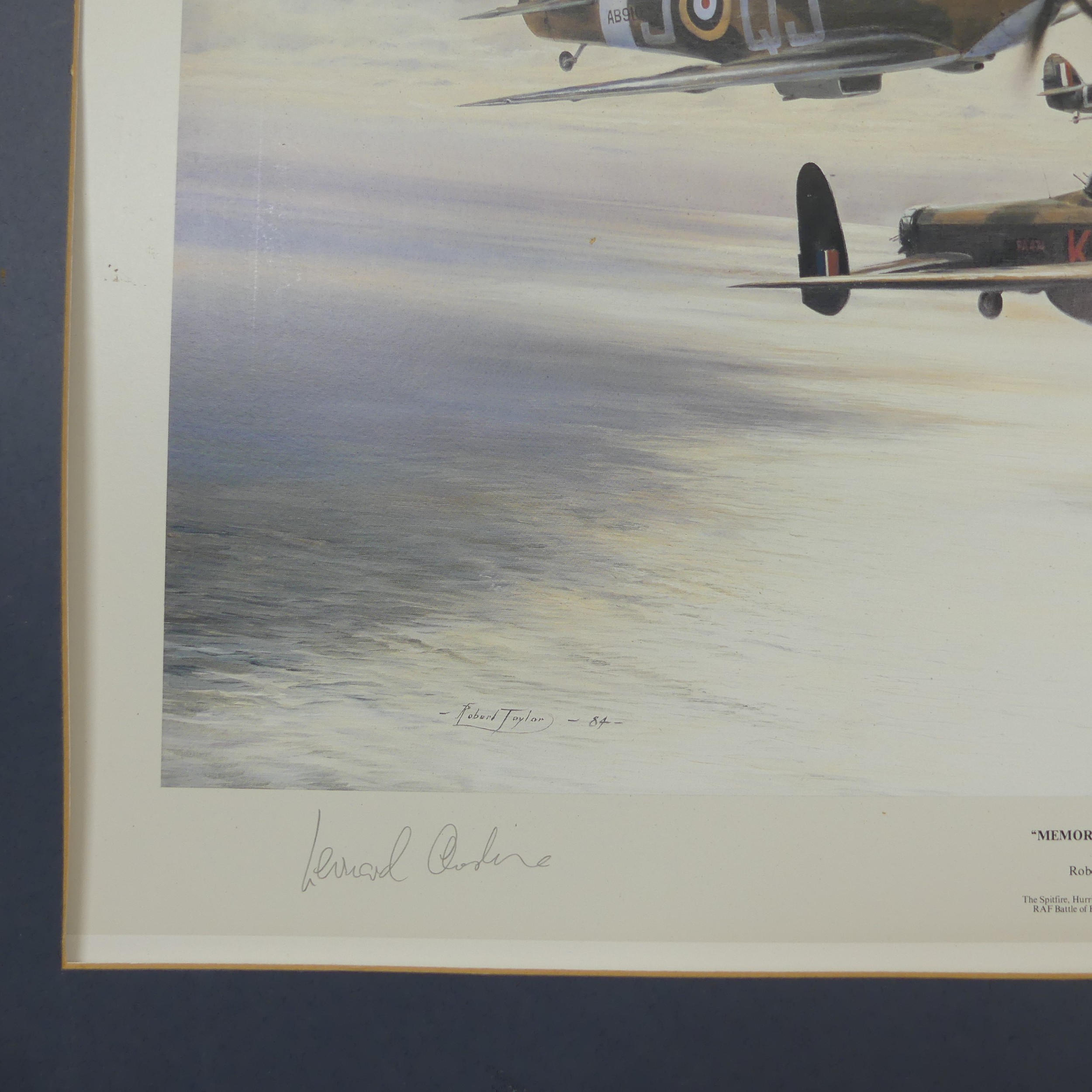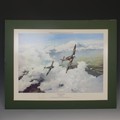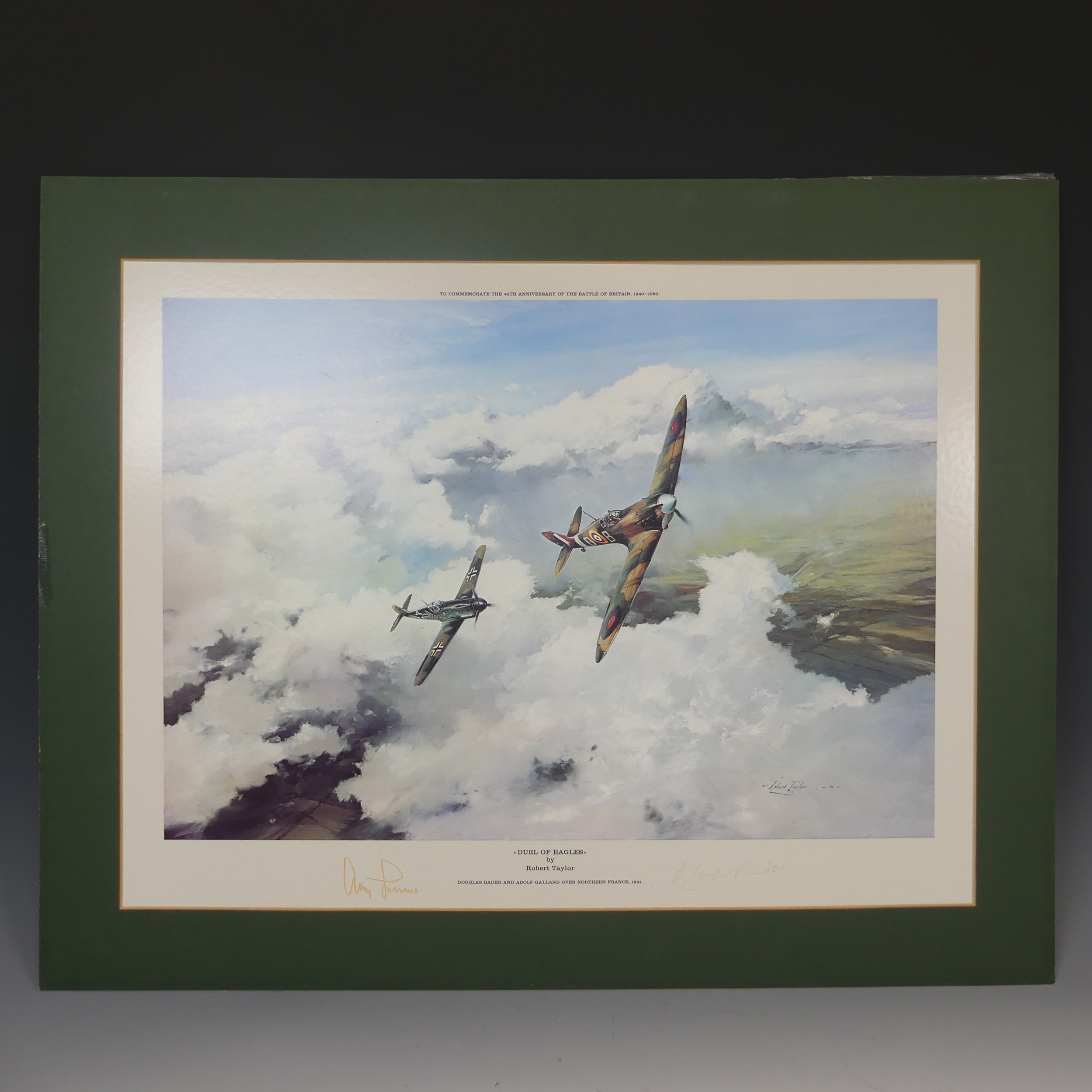 Robert Taylor, A WWII coloured Print titled 'Spitfire', signed by Douglas Bader and Johnnie Johnson, together with four other Robert Taylor coloured Prints, including ; 'Duel of Eagles', 'Memorial Flight' and 'Memphis Belle', all signed by pilots(5)