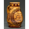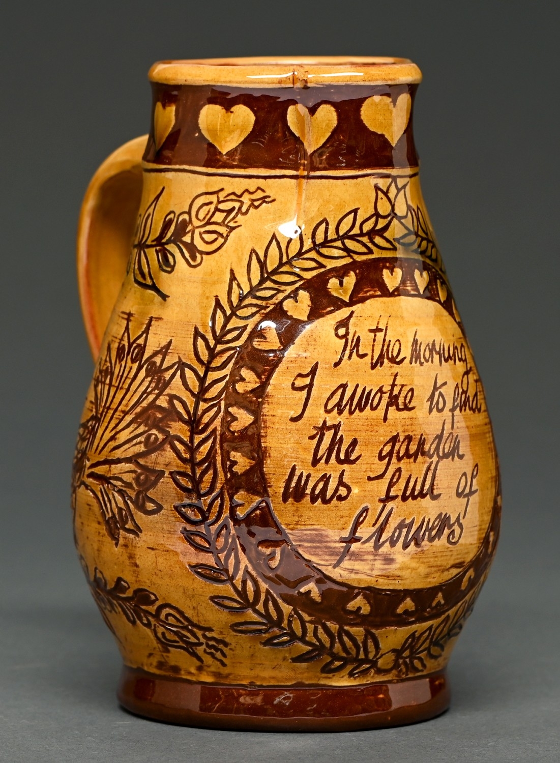 Studio Pottery. Mary Wondrausch (1923 -2016) - Jug, slipware with sgraffito decoration of birds and foliage, incised 'In the morning I awoke to find the garden was full of flowers', 19.5cm h, base of handle incised MW and dated 1975