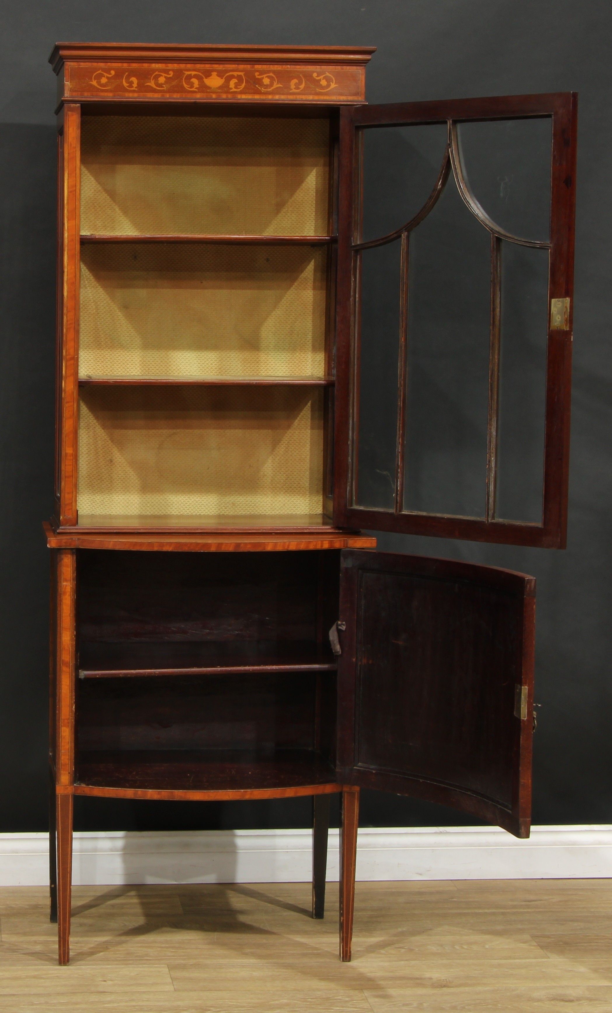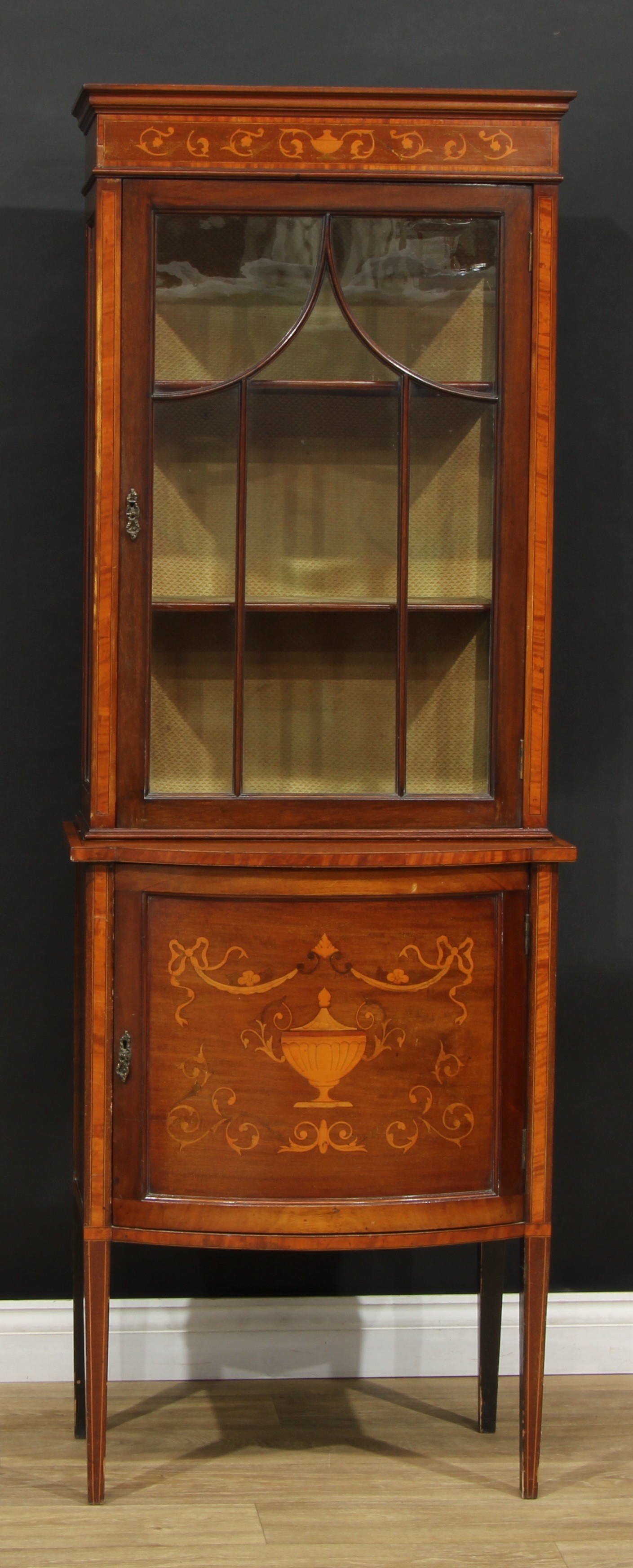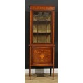 An Edwardian satinwood banded mahogany and marquetry display cabinet, rectangular top above a glazed door enclosing two shelves, the projecting base with a panel door inlaid with a fluted urn, ribbon-tied swags and scrolling leaves, outlined throughout with boxwood and ebony stringing, tapered square legs, 184cm high, 65.5cm wide, 42.5cm deep