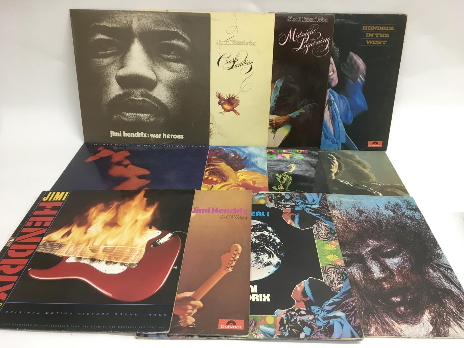 Twelve Jimi Hendrix LPs including 'In The West', 'Cry Of Love', 'Nine To The Universe', 'Crash Landing' and others.