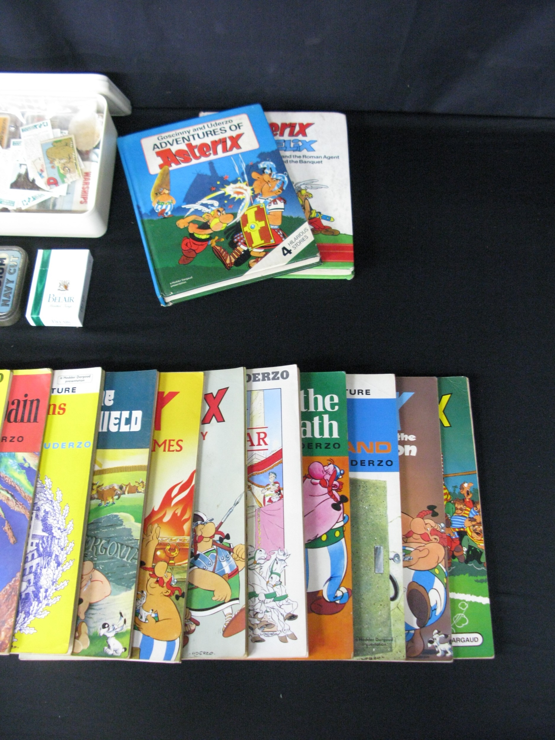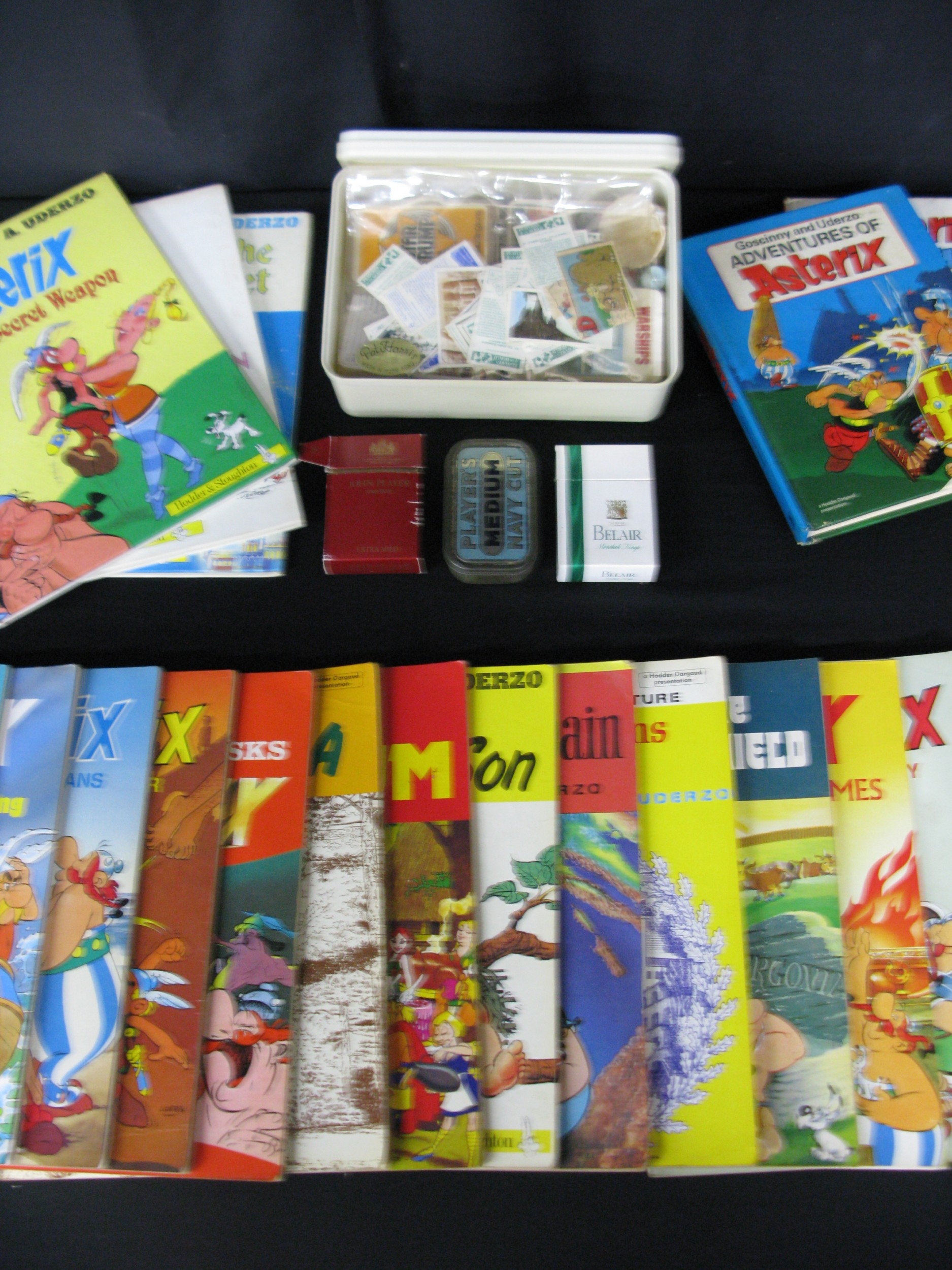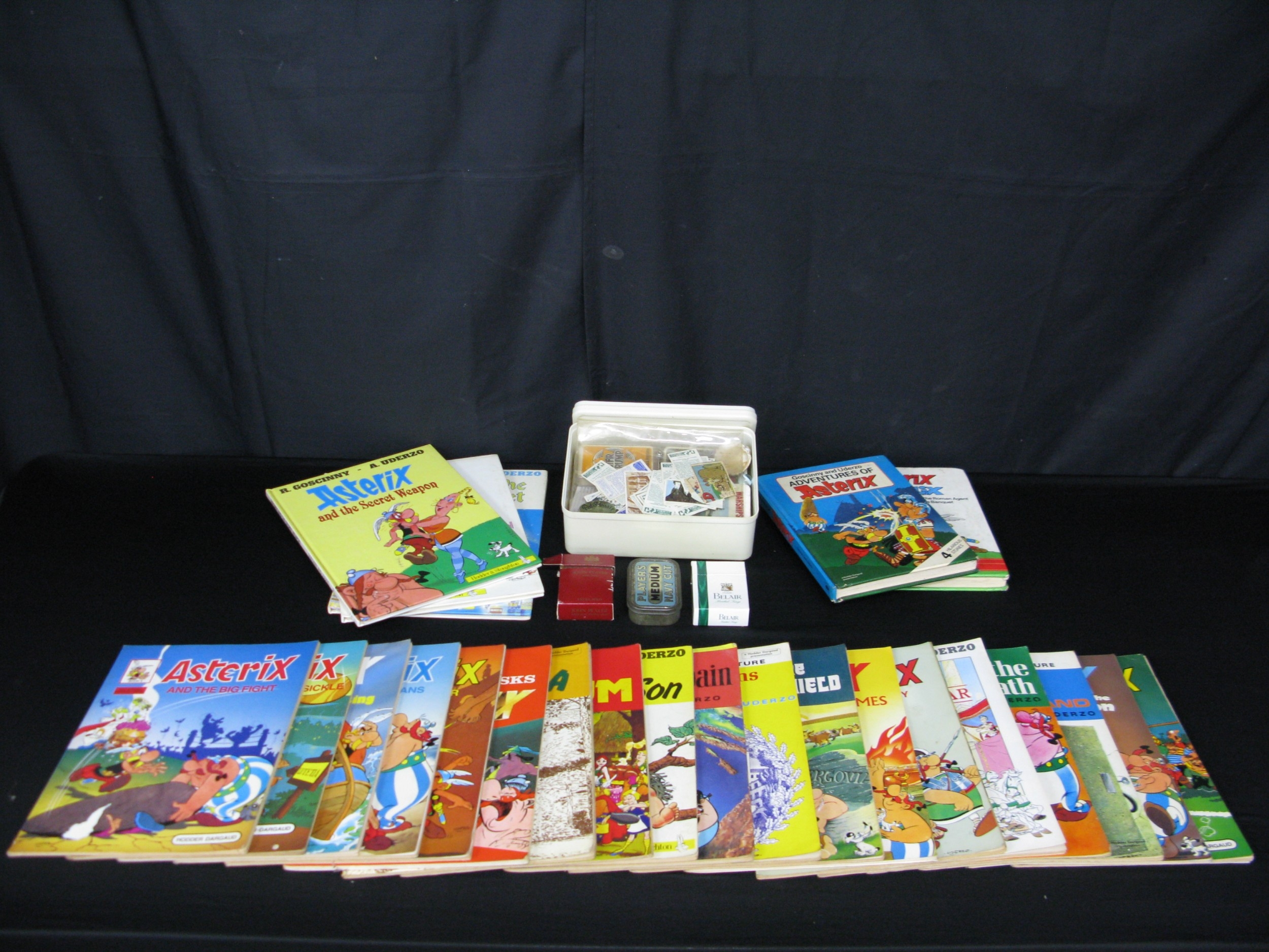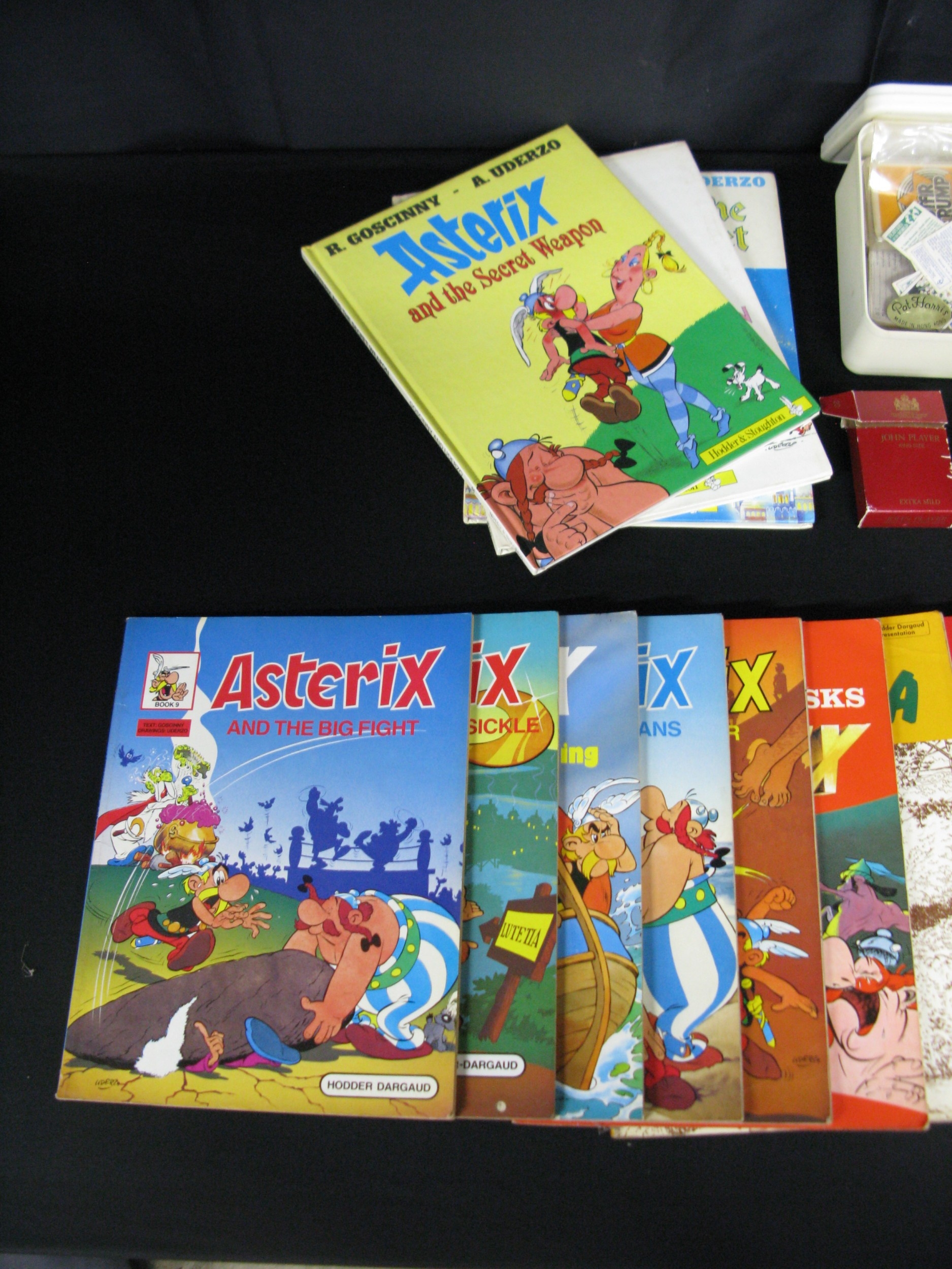 Twenty four Asterix comic books to include: five hardback published by Hodder & Stoughton together with a collection of cigarette cards and trump cards etc