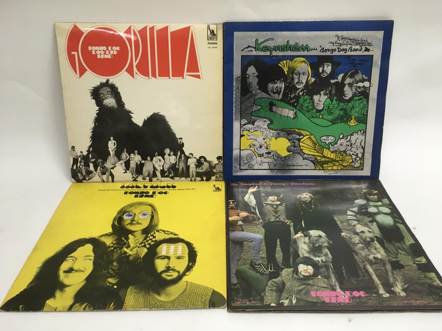 Four early UK pressings of Bonzo Dog Doo Dah Band LPs comprising 'Gorilla', 'Keynsham', 'The Doughnut In Granny's Greenhouse' and 'Tadpoles'. All vinyl in VG+/NM condition.