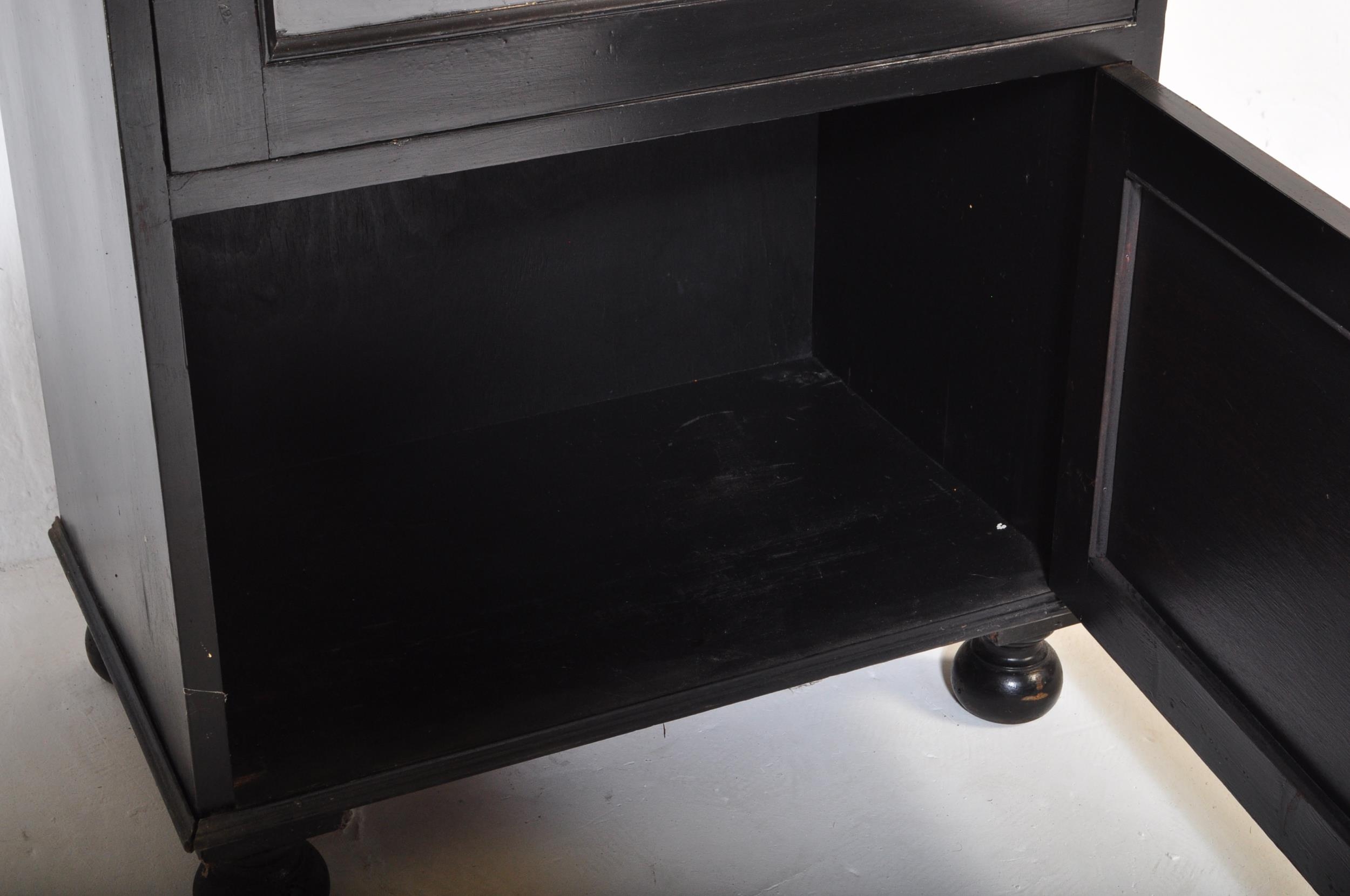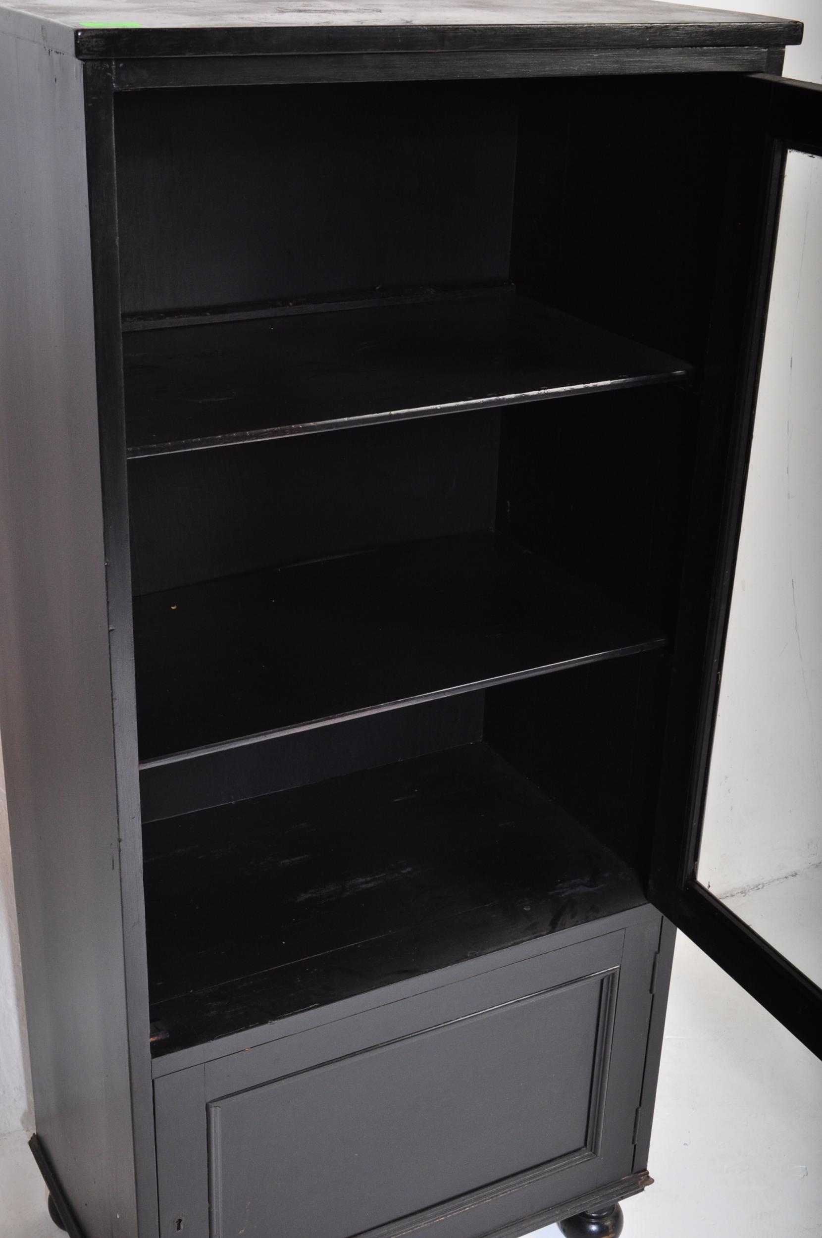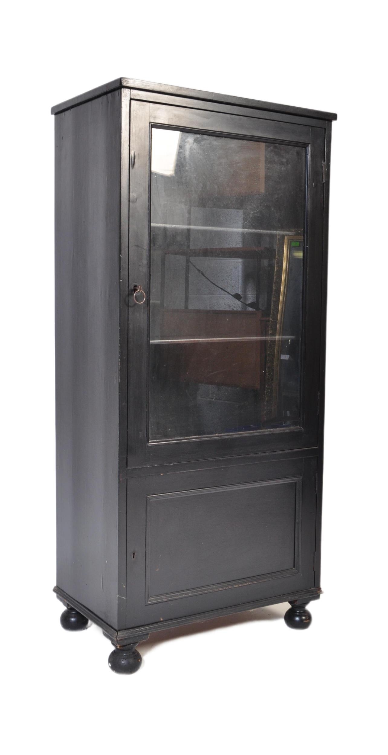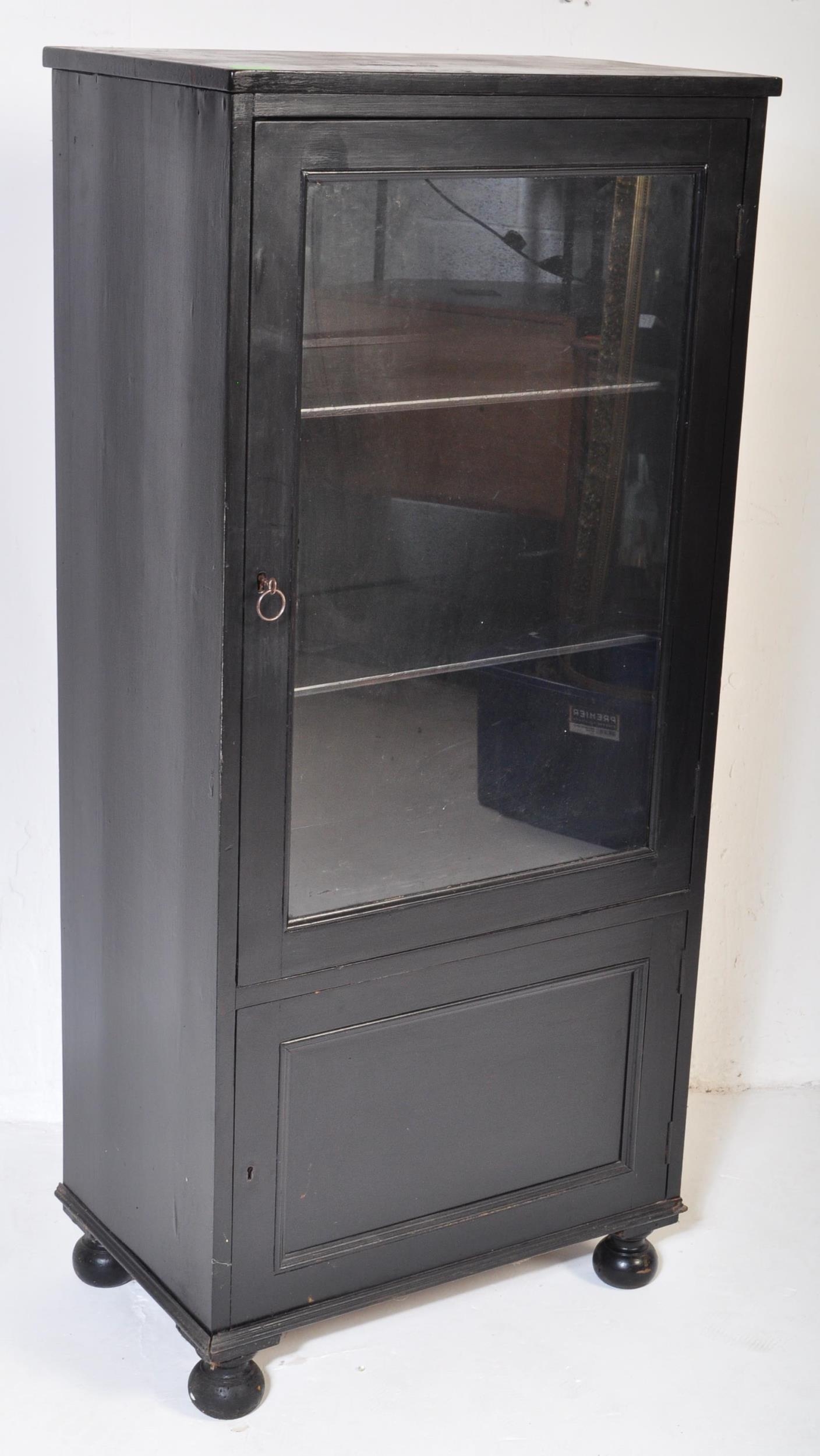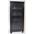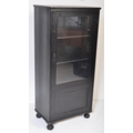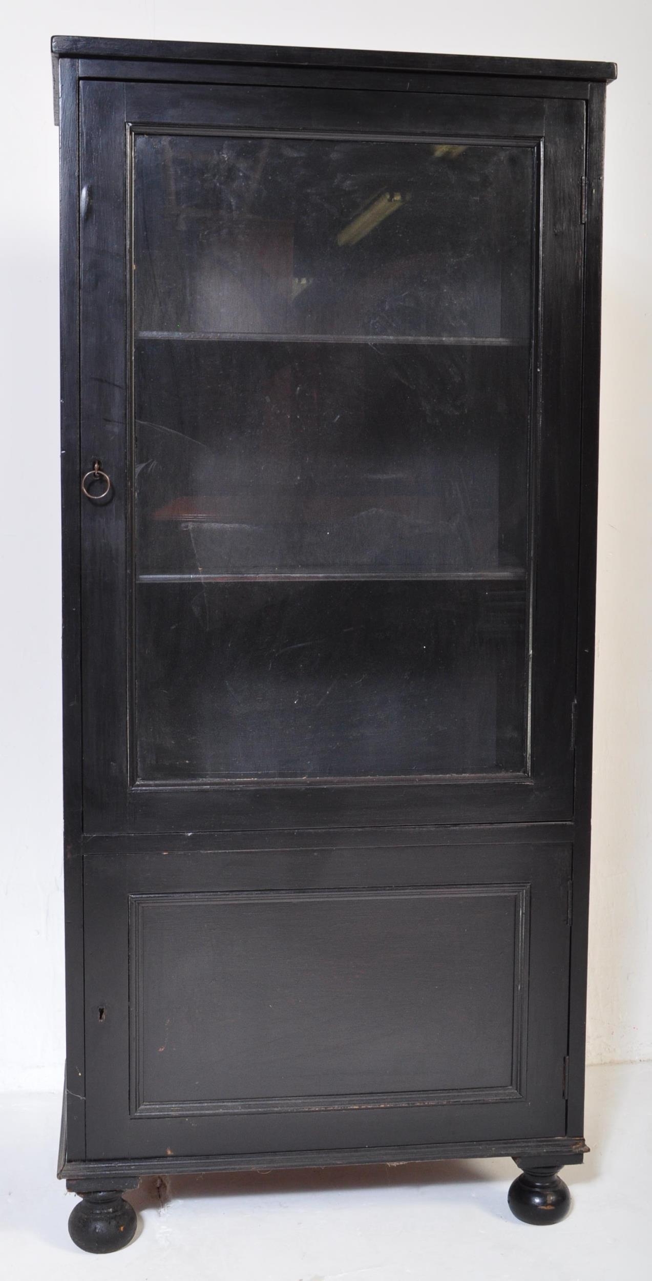 Early 20th Century kitchen dresser cabinet bonnetiere ( hat cupboard ). Of rectangular form with flared top, single glazed doors with shelving behind atop a single cupboard door. Raised on bun feet. Measures approx. 133cm x 61cm x 37cm.