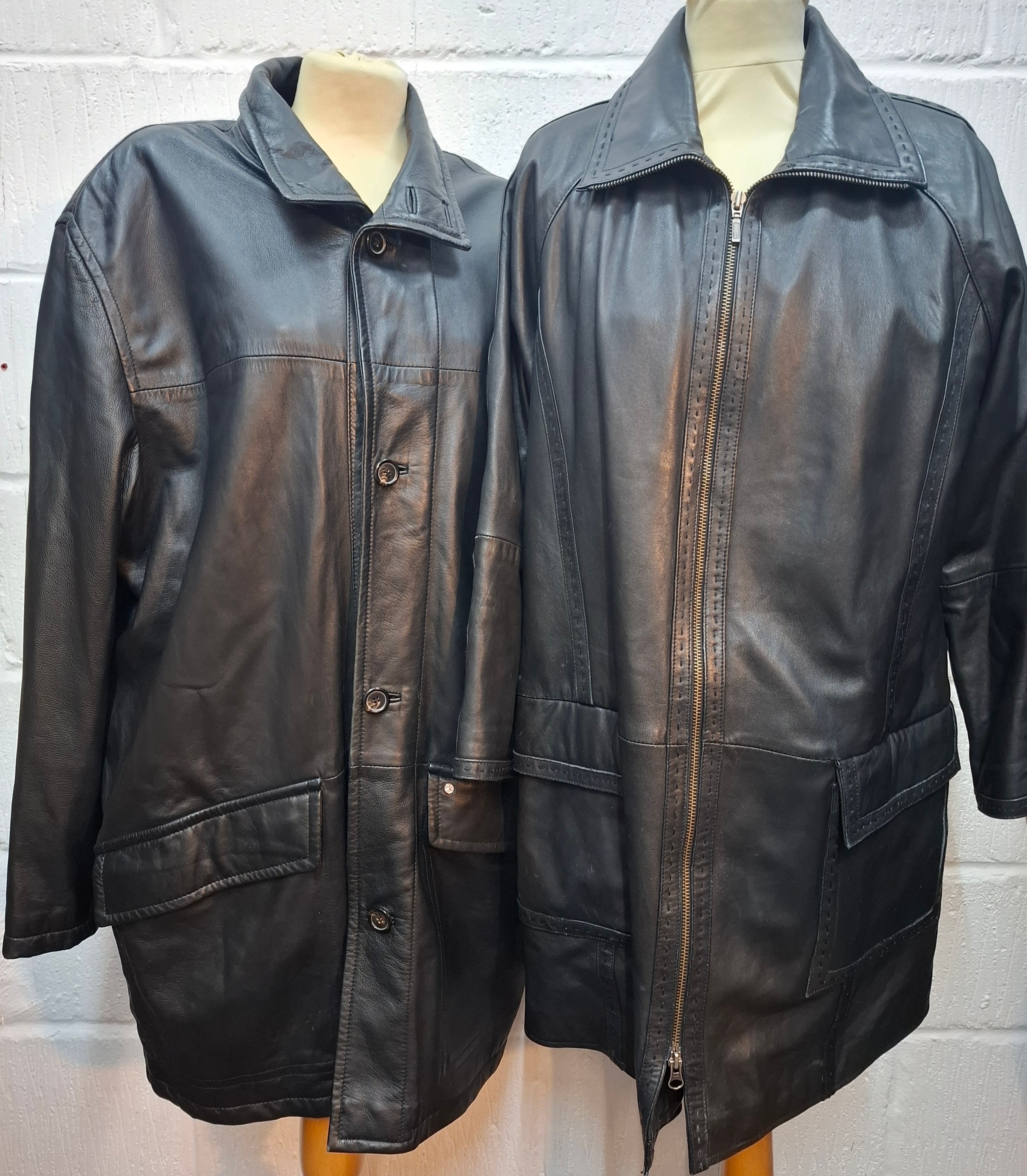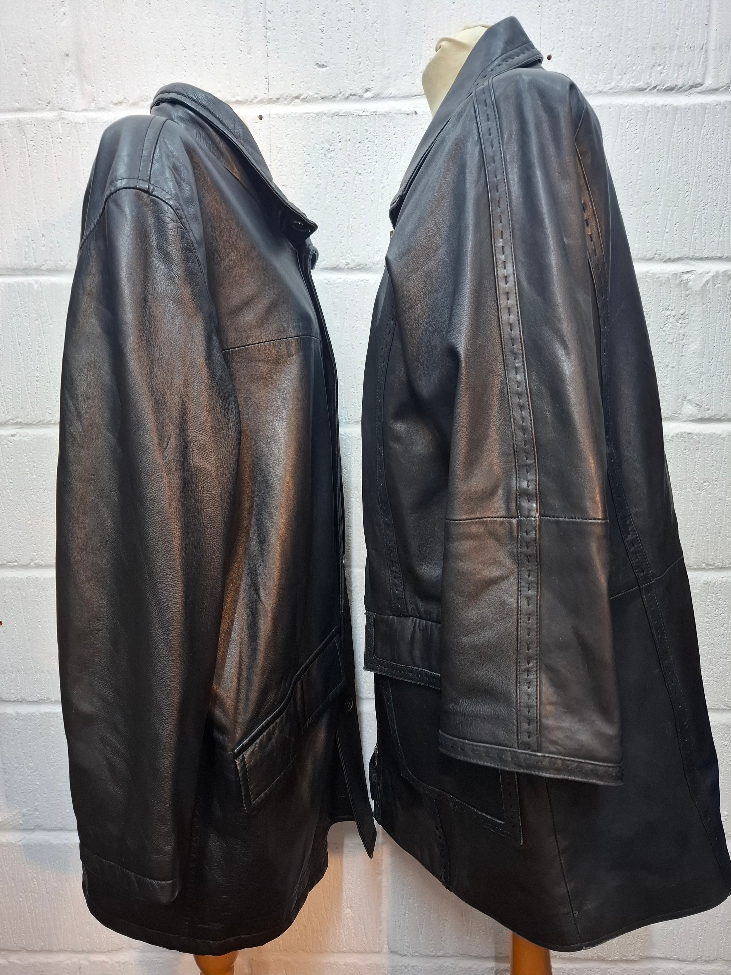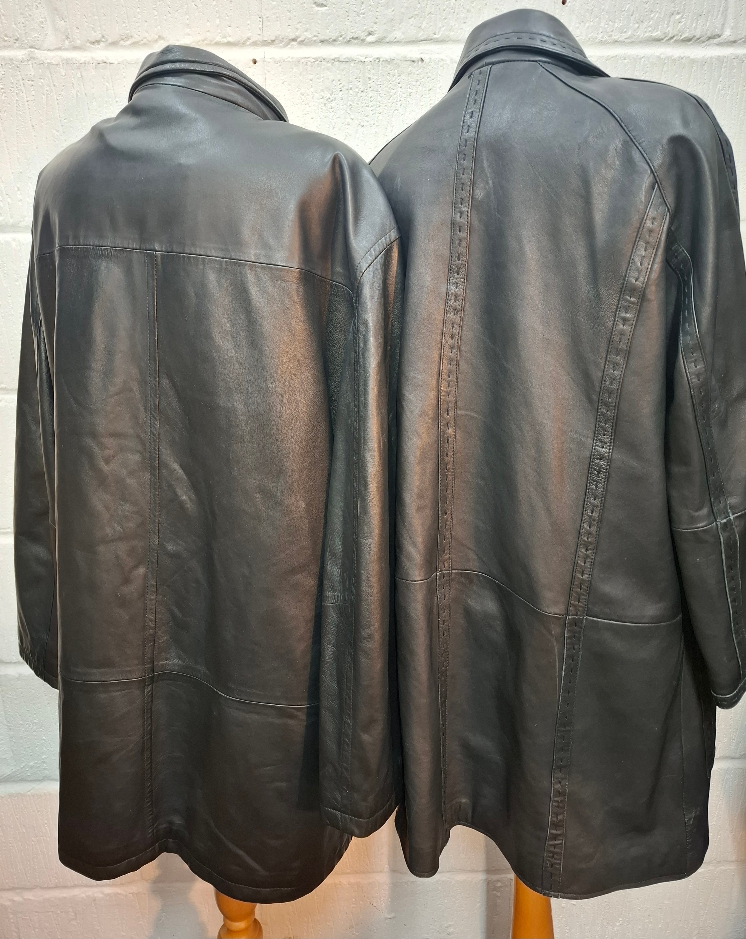 Mercedes Benz-A late 20th Century gents black soft leather coat size XL (approx 44" chest x 35" long) together with a Julia S.Roma black leather coat, European size 38