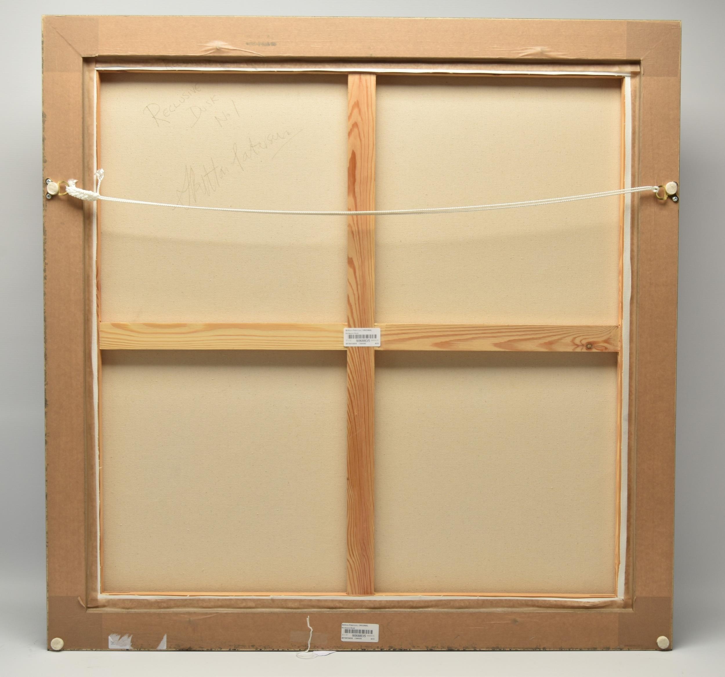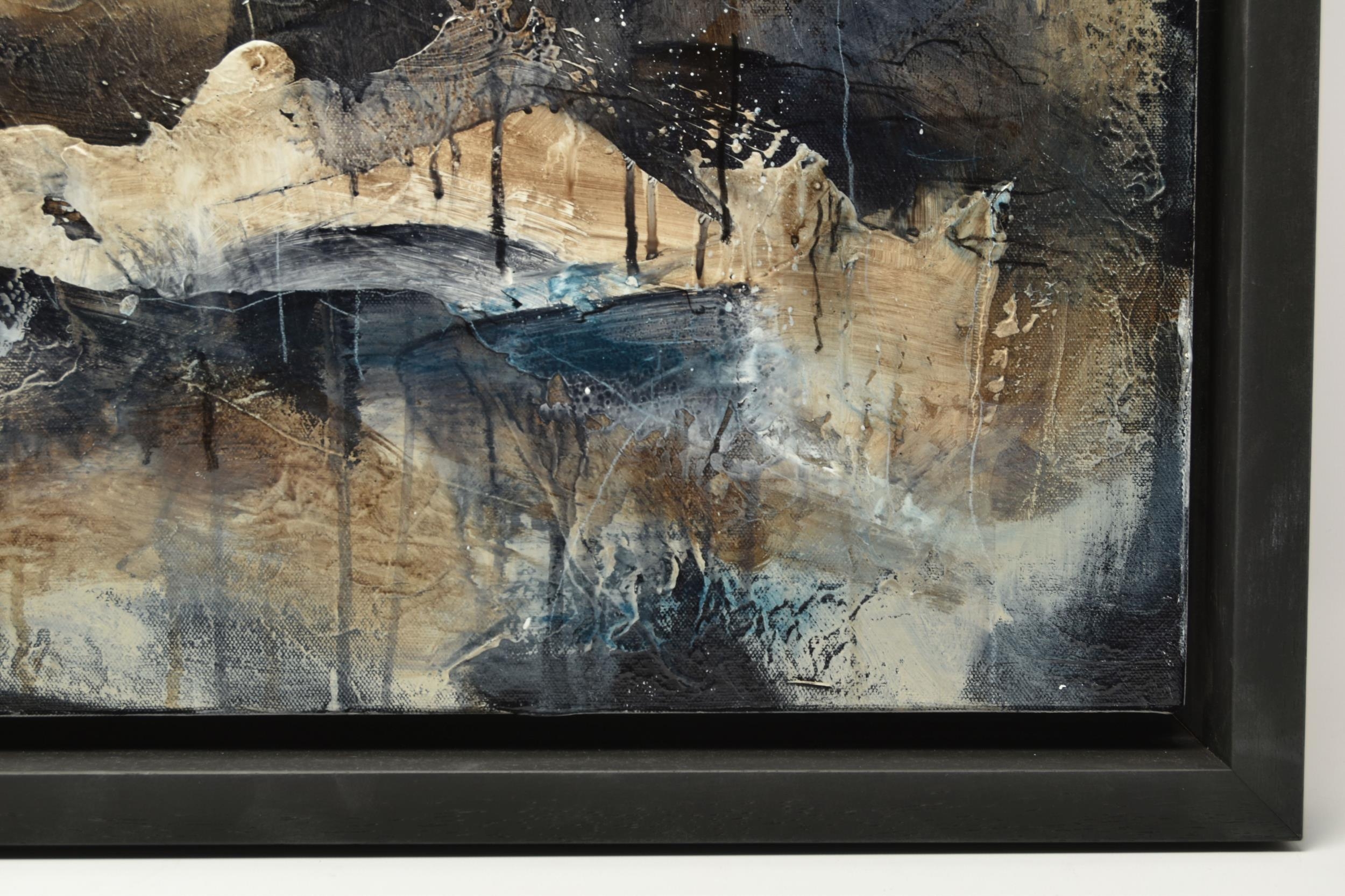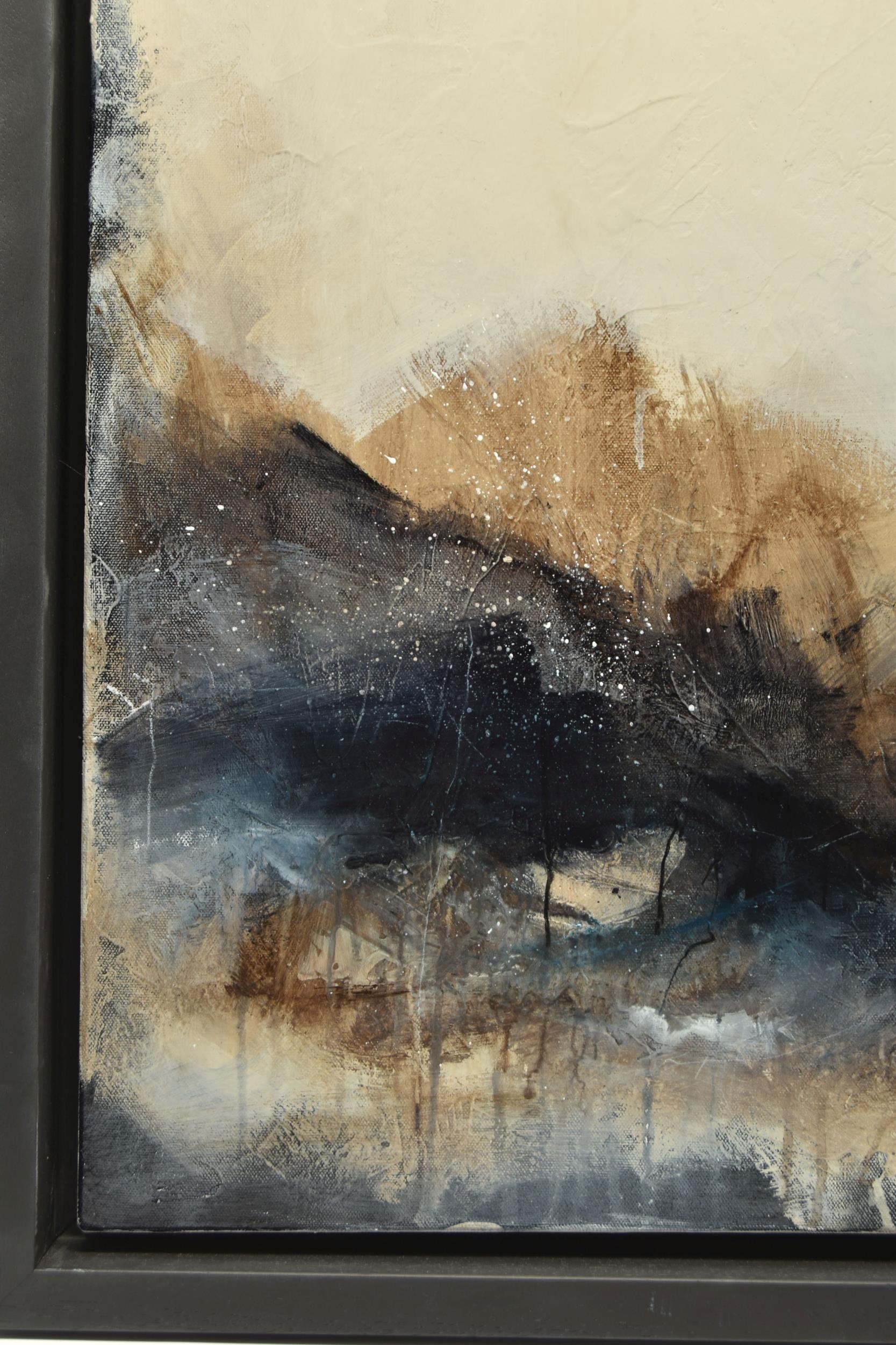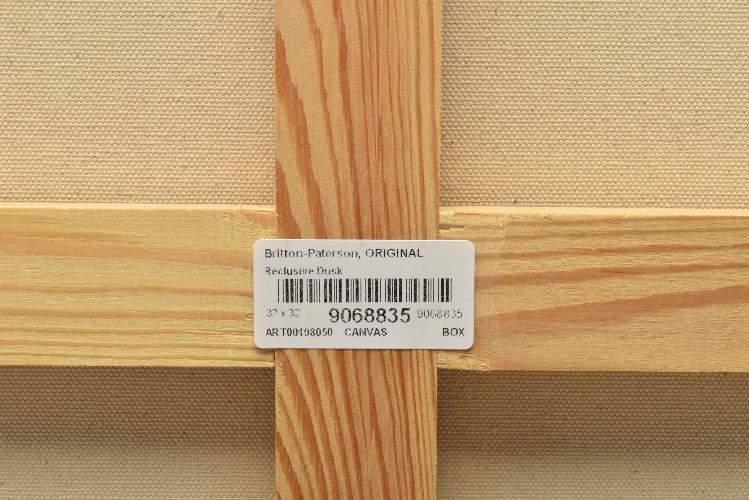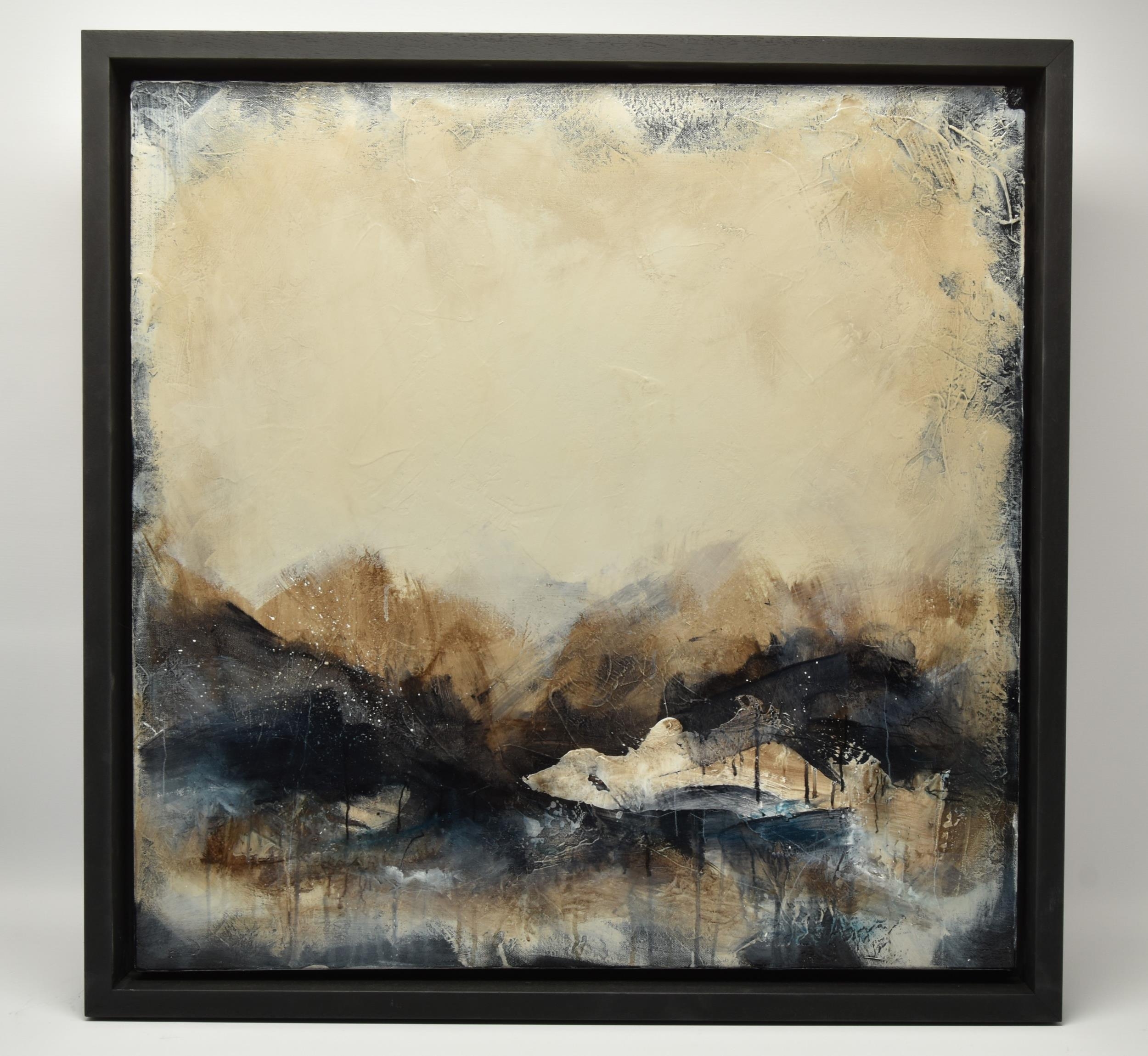 ALISON BRITTON-PATERSON (BRITISH 1974) 'RECLUSIVE DUSK', an abstract moody landscape signed and titled verso, oil on canvas, approximate size 80cm x 80cm, frame size 87cm x 87cm, Condition Report: bumps and rubs to corner edges of the frame