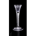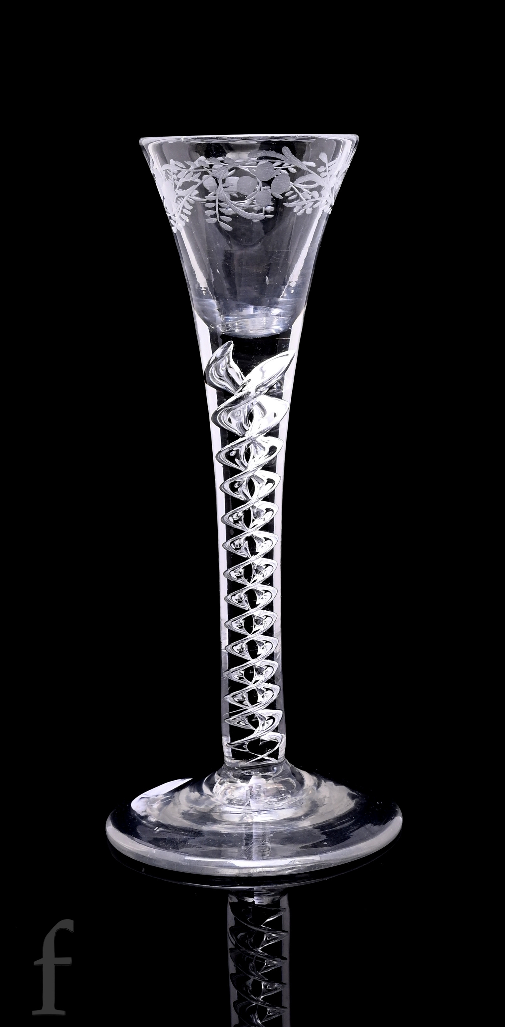 An 18th Century cordial drinking glass circa 1750, drawn funnel bowl engraved to the rim with flowers and foliage above a double spiral mercury air twist stem, raised to a conical foot, height 16.5cm.