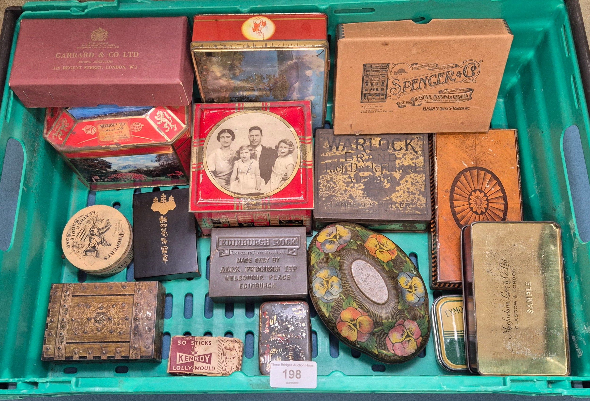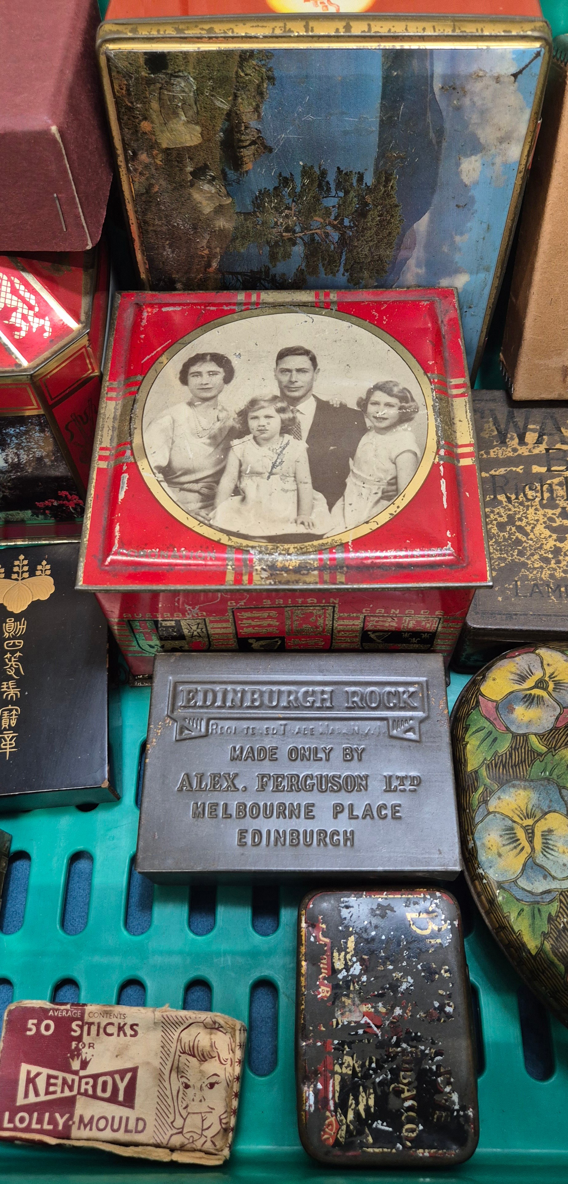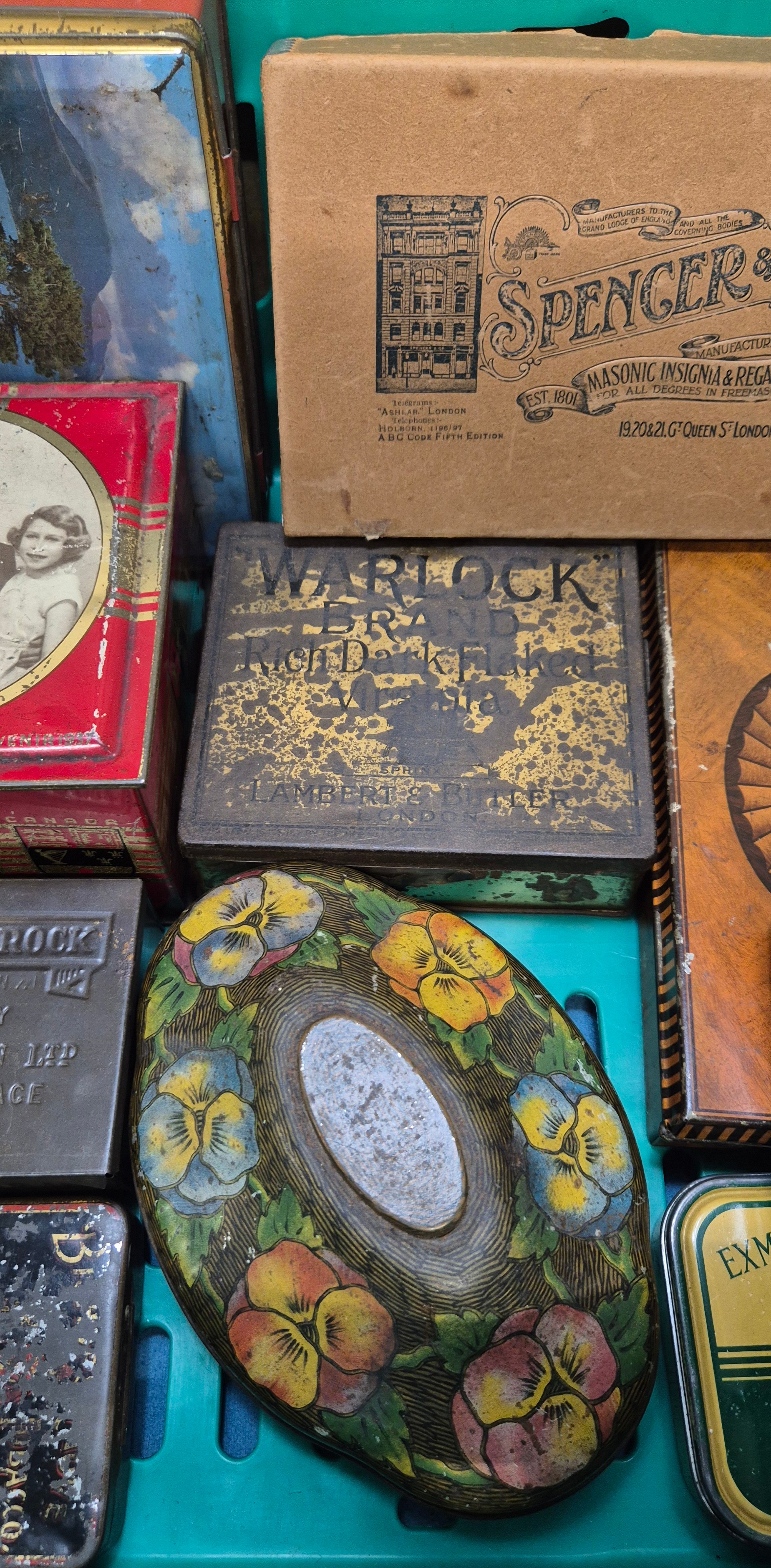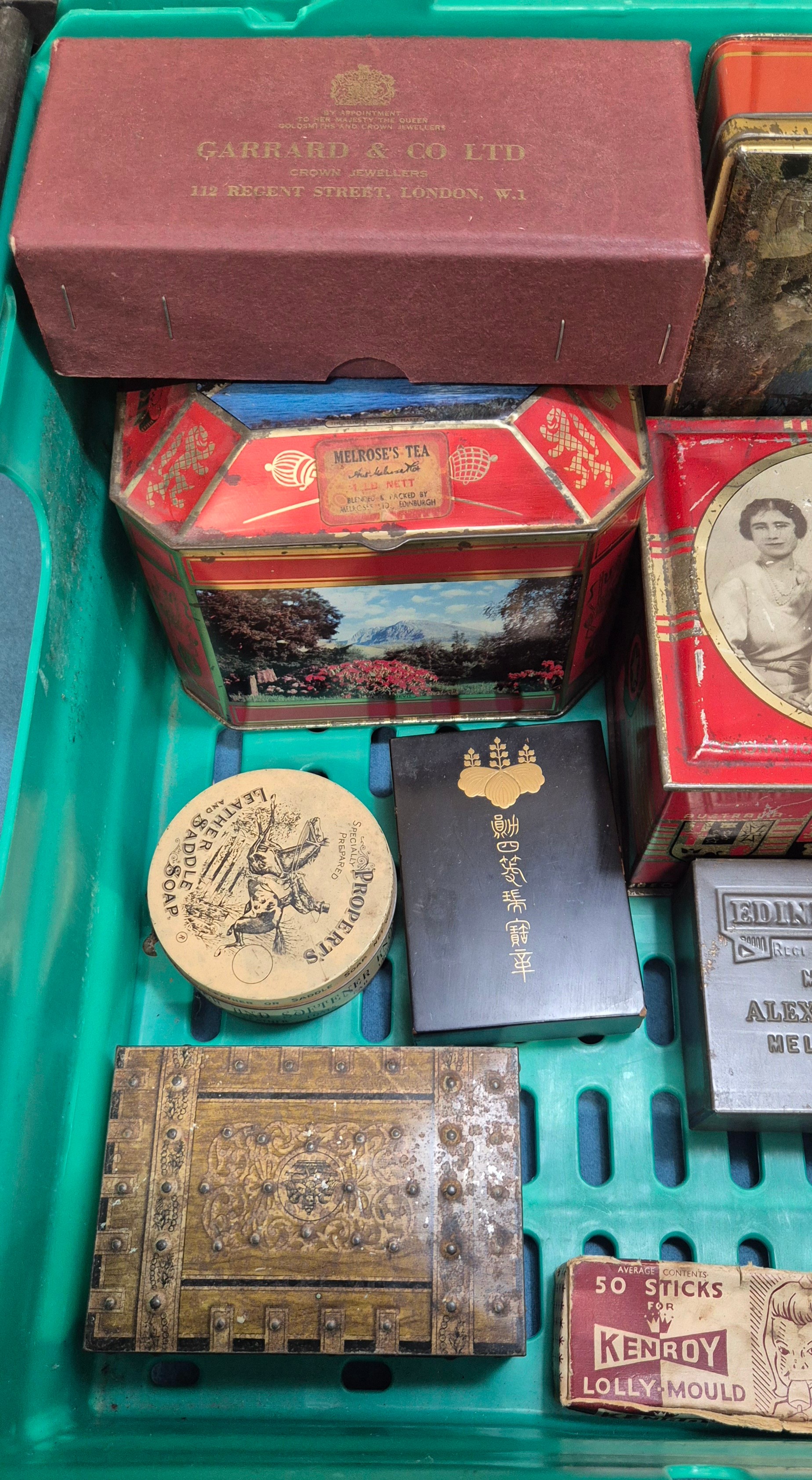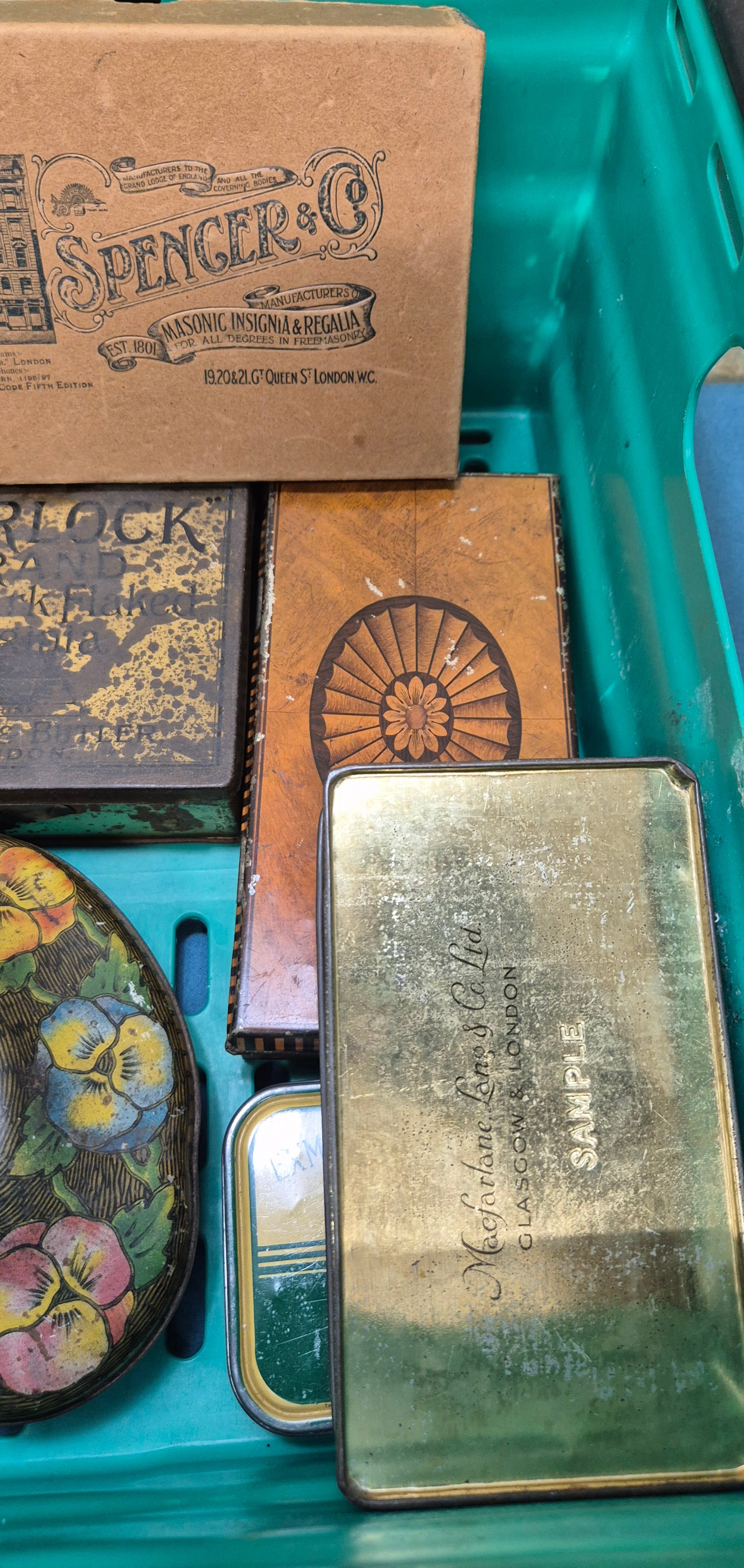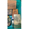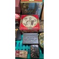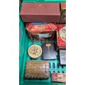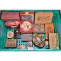 A Crate of vintage advertising tins- Rown Tree, Huntley Palmers, Cadbury and others.