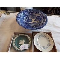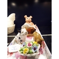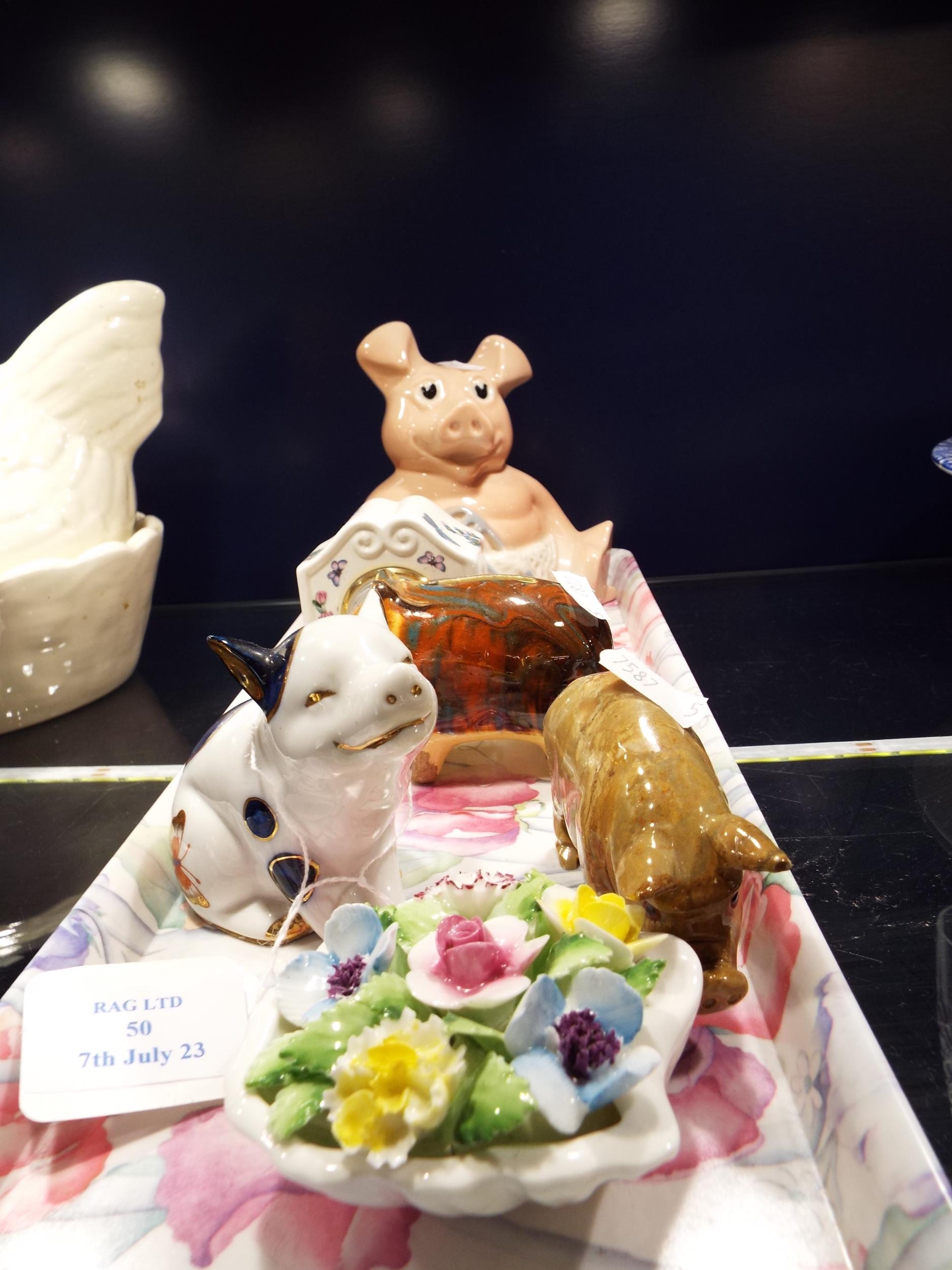 A NatWest pig, three other china pigs and a Portmeirion clock