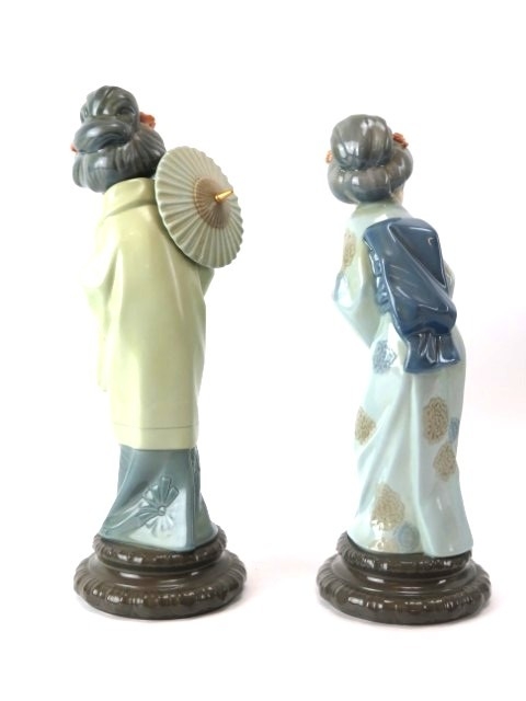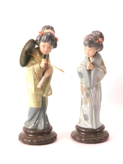 Two vintage Lladro Japanese female figures. Entitled ‘Oriental Spring’ and ‘Sayonara’. Sayonara with original box included. (2 items) 28.5 cm height, 27 cm height.