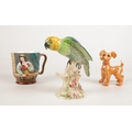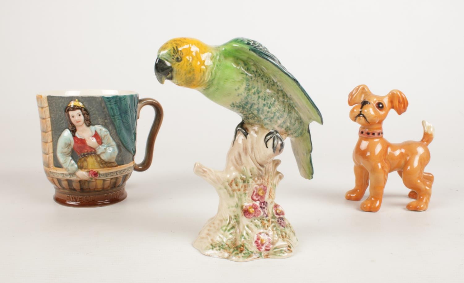 A group of Beswick ceramic's. A Parakeet No. 930, Romeo & Juliet themed mug No 1215 & a dog.