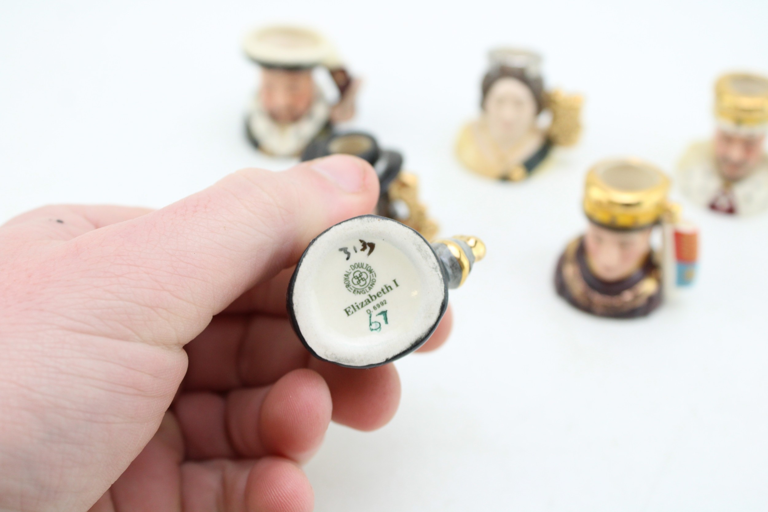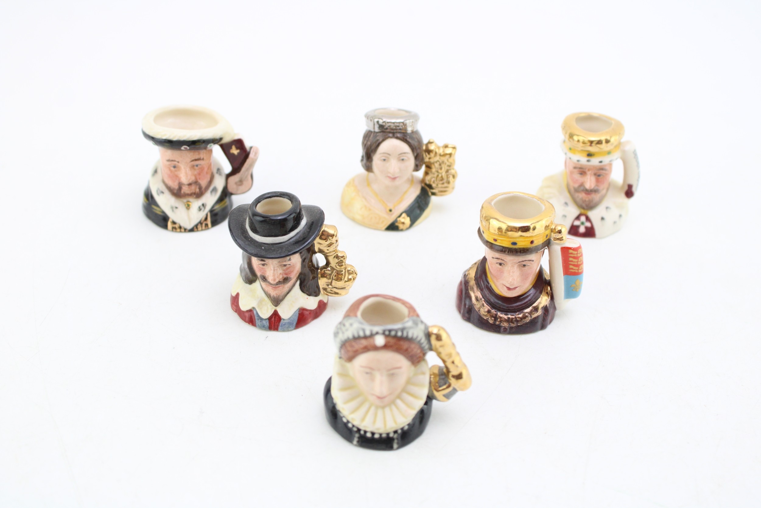 The Set of Six Royal Doulton Tiny Character Jugs 'Kings and Queens of the Realm', 1994, including Henry V, Henry VIII, Elizabeth I, Edward VII, Victoria and Charles I (6), matching set.