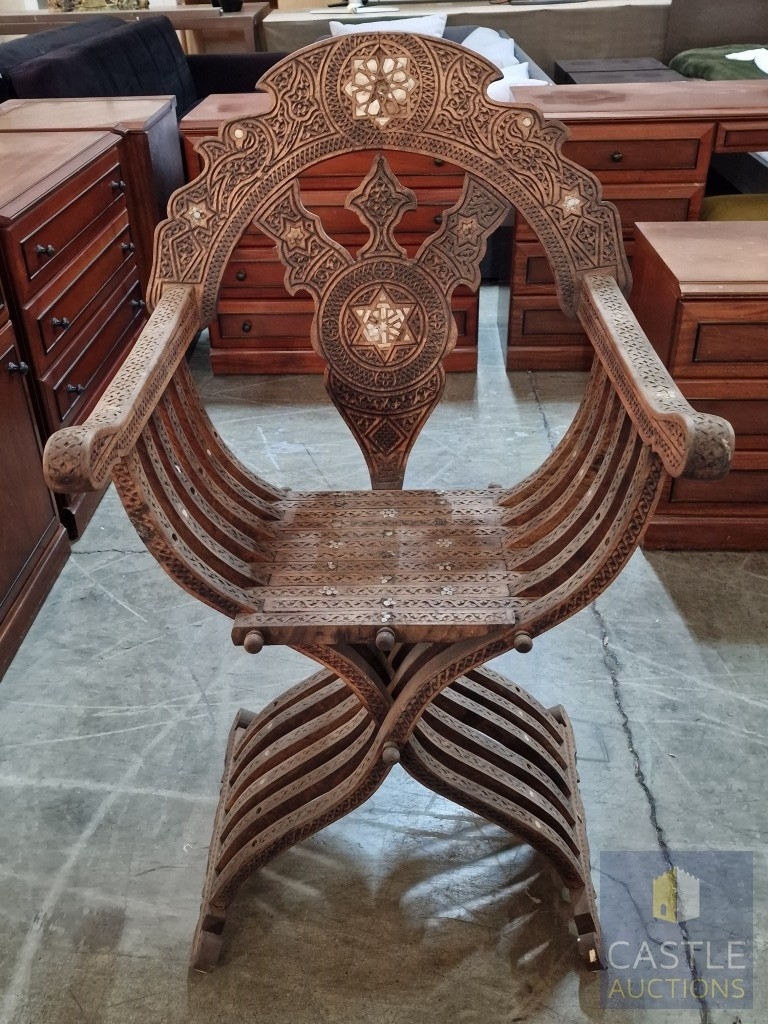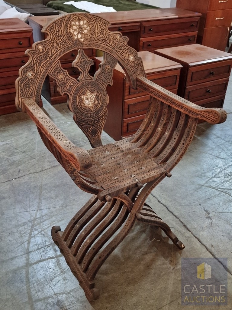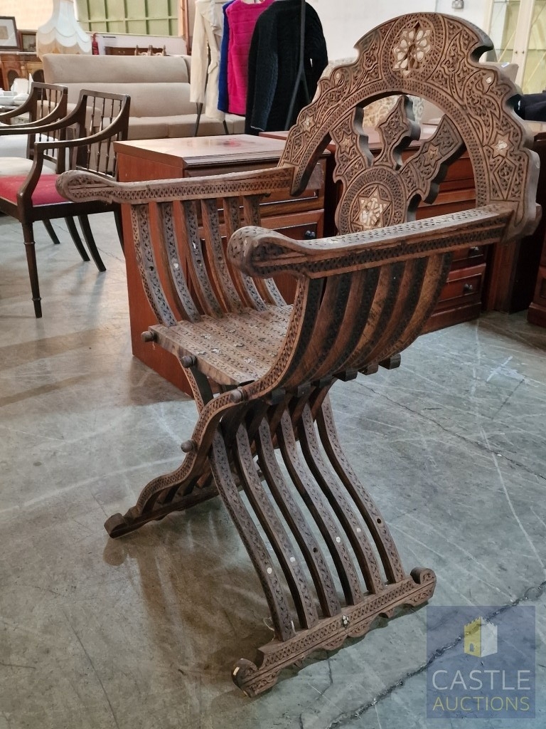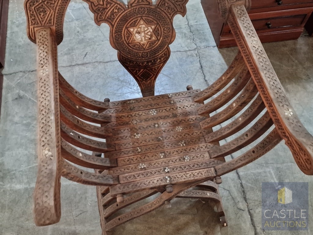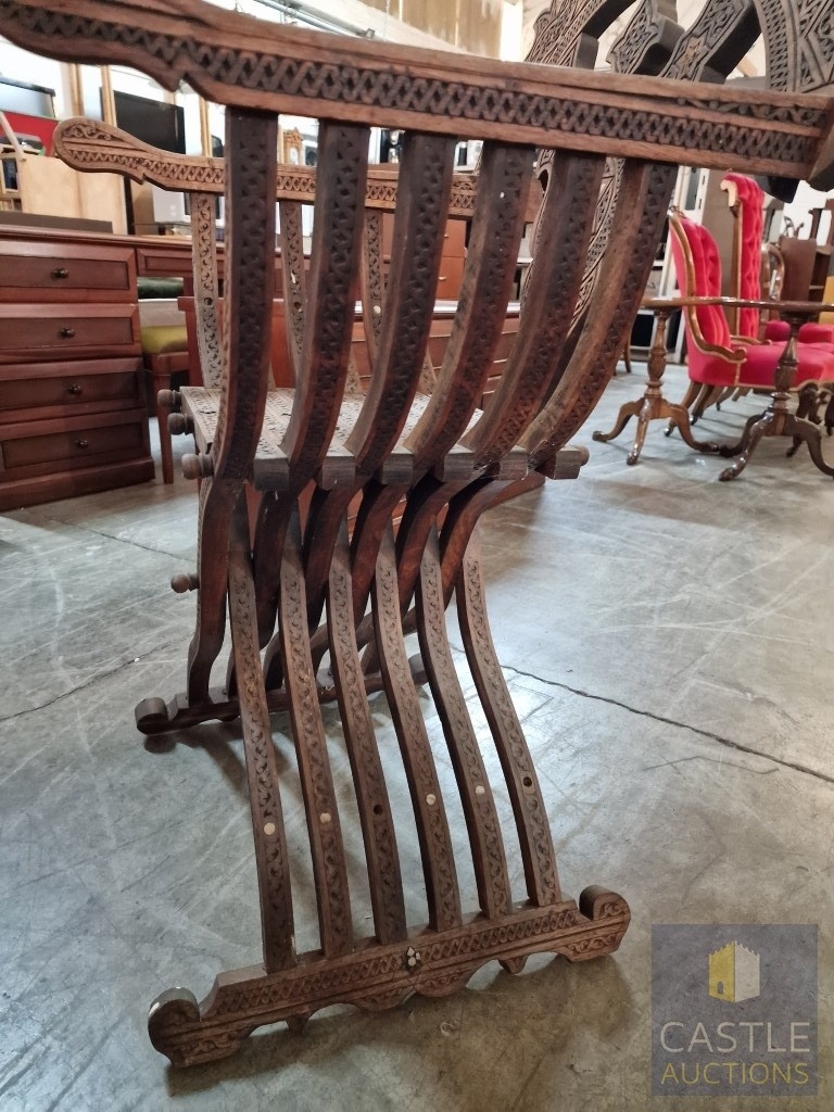 Highly Decorative Folding Moorish / Islamic Wooden Chair, with Curved Slatted Form and 'X' Frame Base, Heavily Carved with Geometric & Foliage Patterns and Mother-of-Pearl Inlay, Likely Late 20th Century, Either North Africa or Middle East Origin, (Approx. H: 104cm W: 65cm Overall)