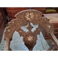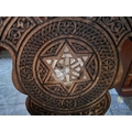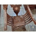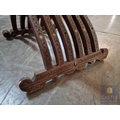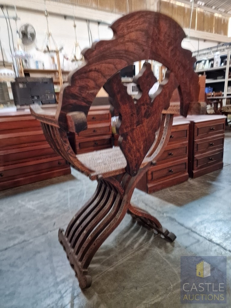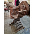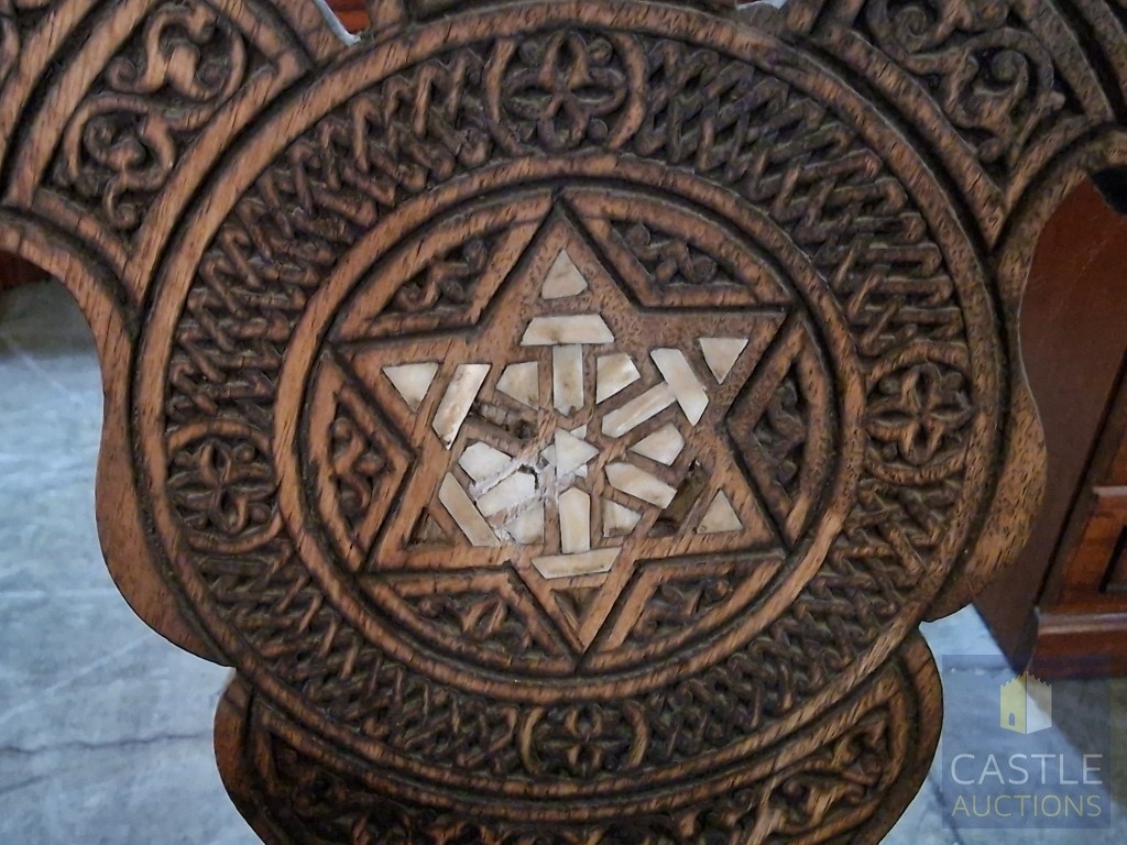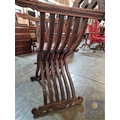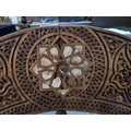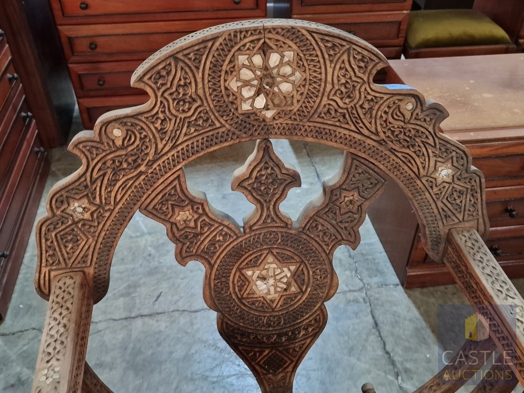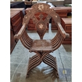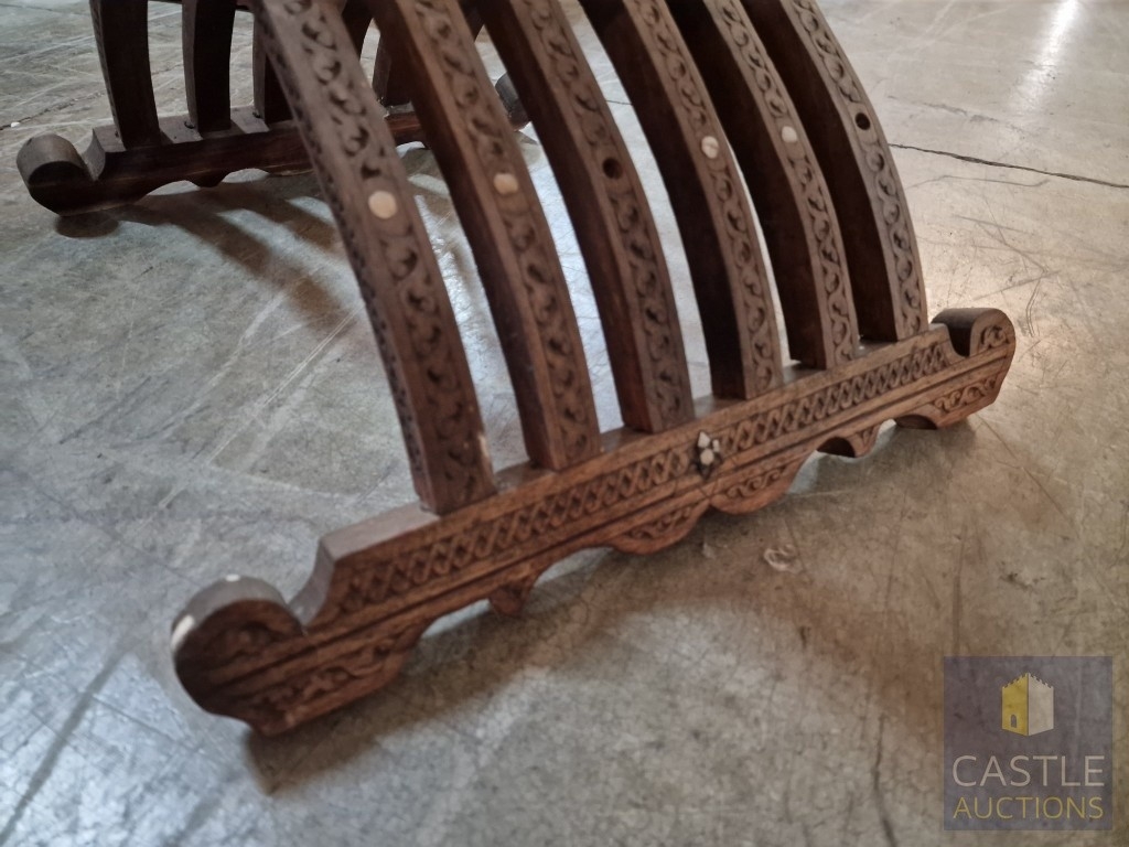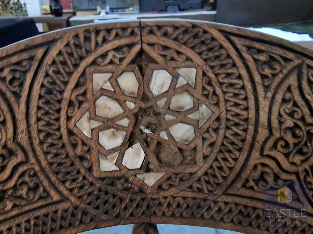 Highly Decorative Folding Moorish / Islamic Wooden Chair, with Curved Slatted Form and 'X' Frame Base, Heavily Carved with Geometric & Foliage Patterns and Mother-of-Pearl Inlay, Likely Late 20th Century, Either North Africa or Middle East Origin, (Approx. H: 104cm W: 65cm Overall)
