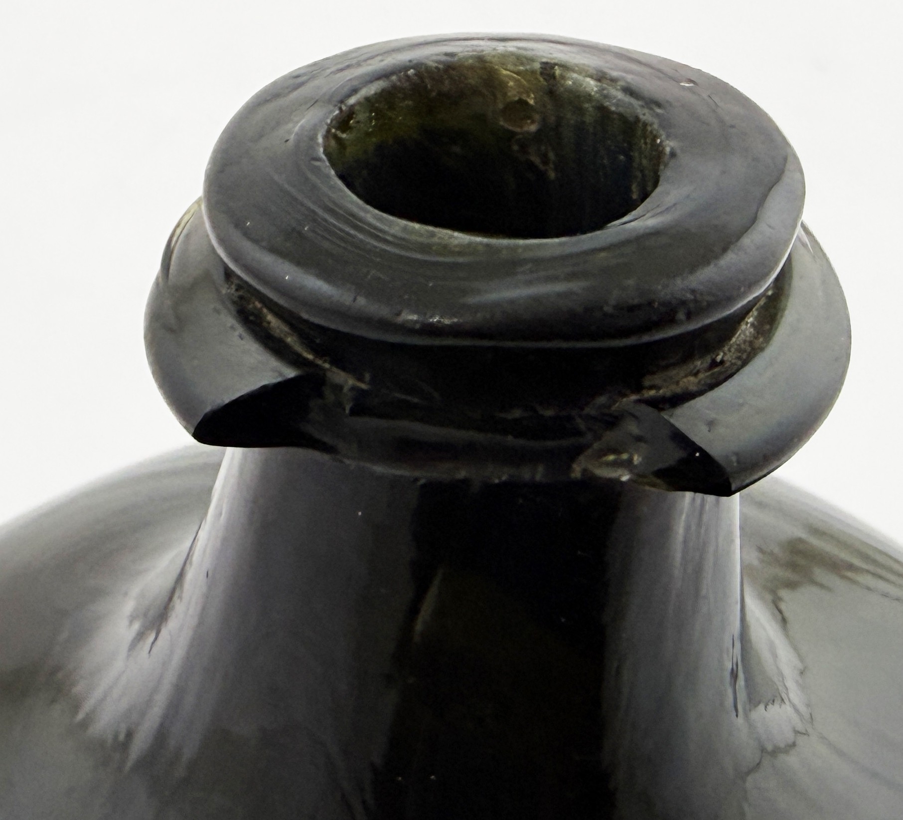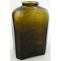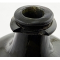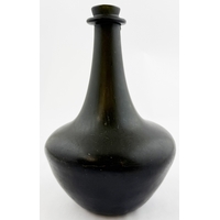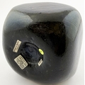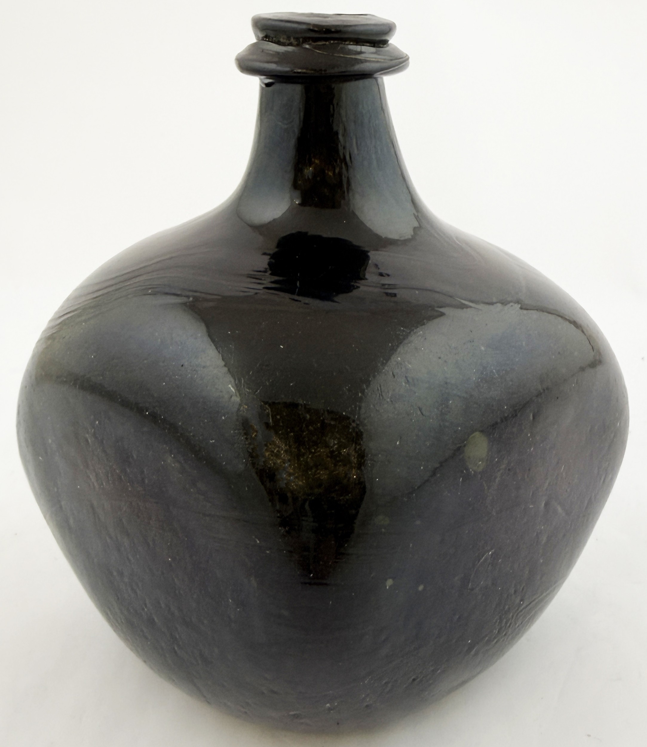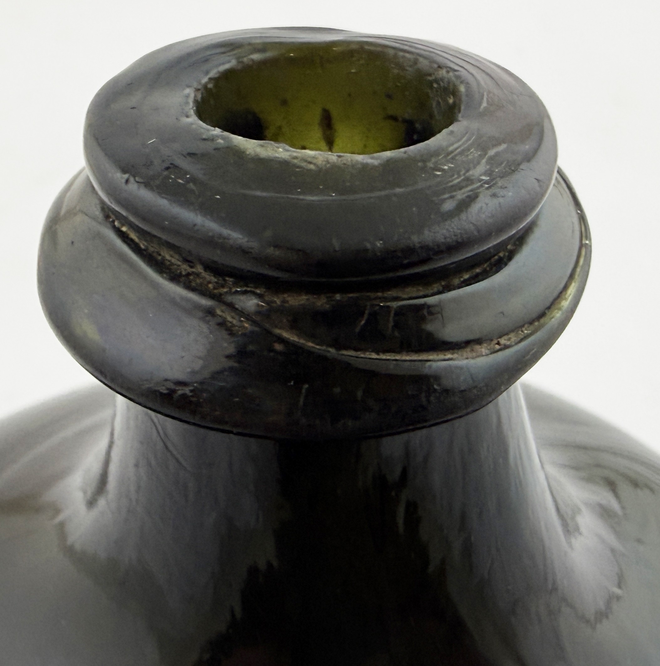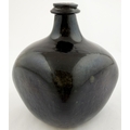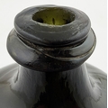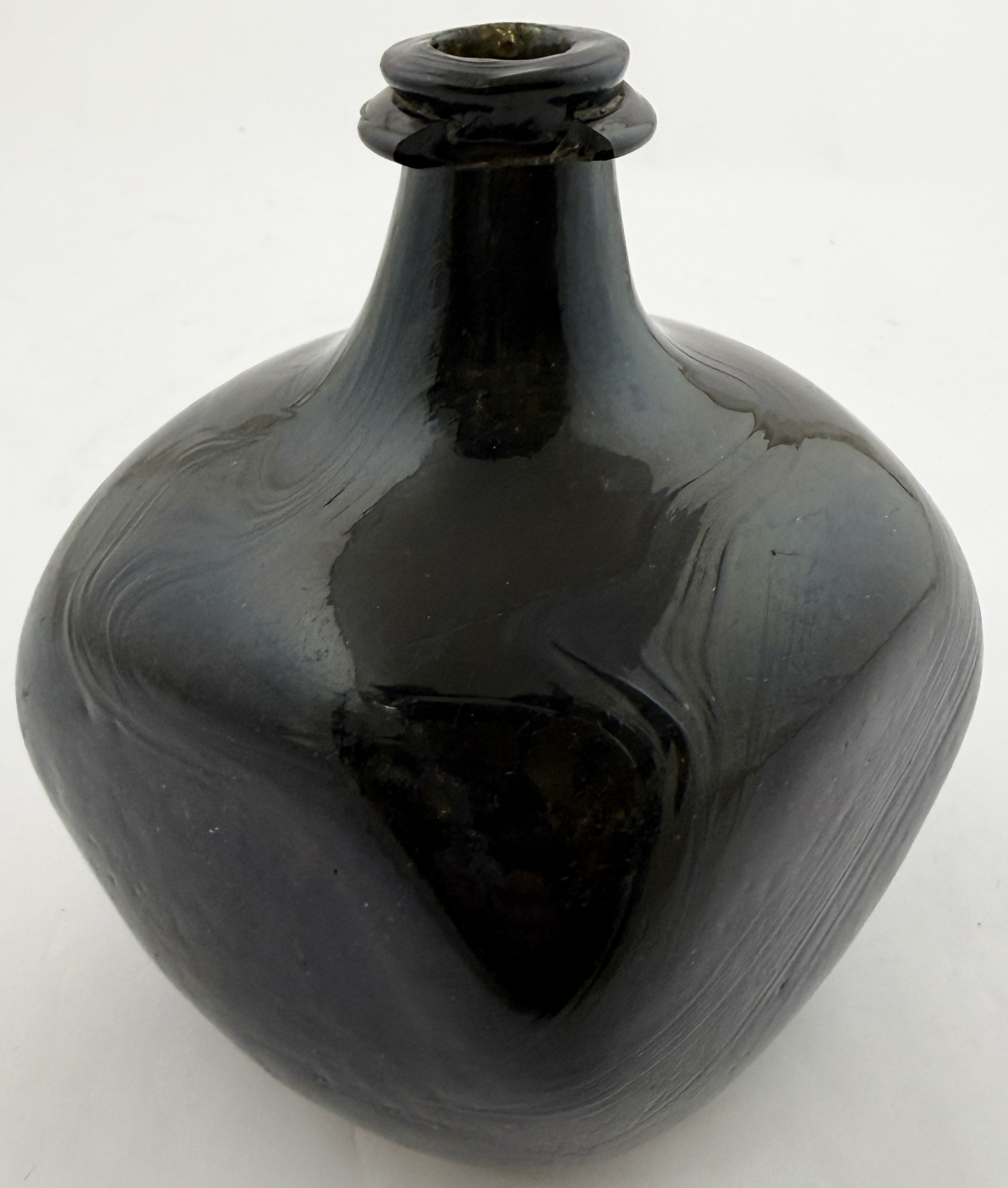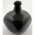 SQUARE BODIED ENGLISH ONION BOTTLE. 5.75ins tall. Square bodied black glass onion, a very rare form c. 1700-1720. Kick up, sand pontil, centre exhibiting a blue bloom. David Walker Barker collection. Approx. 20 of the string rim chipped but otherwise great condition - find another!