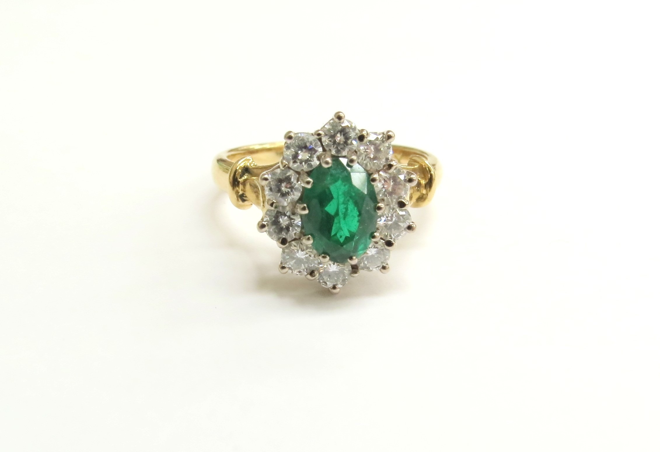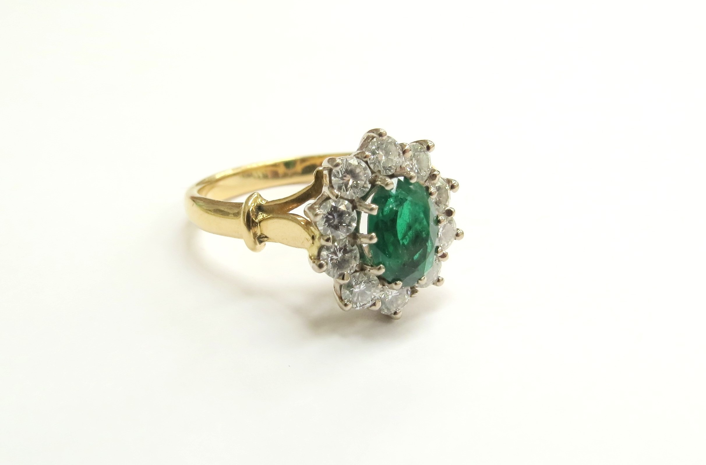 An 18ct gold emerald and diamond cluster ring, the central oval emerald 7mm x 5mm framed by ten brilliant cut diamonds. Size N/O, 4.7g