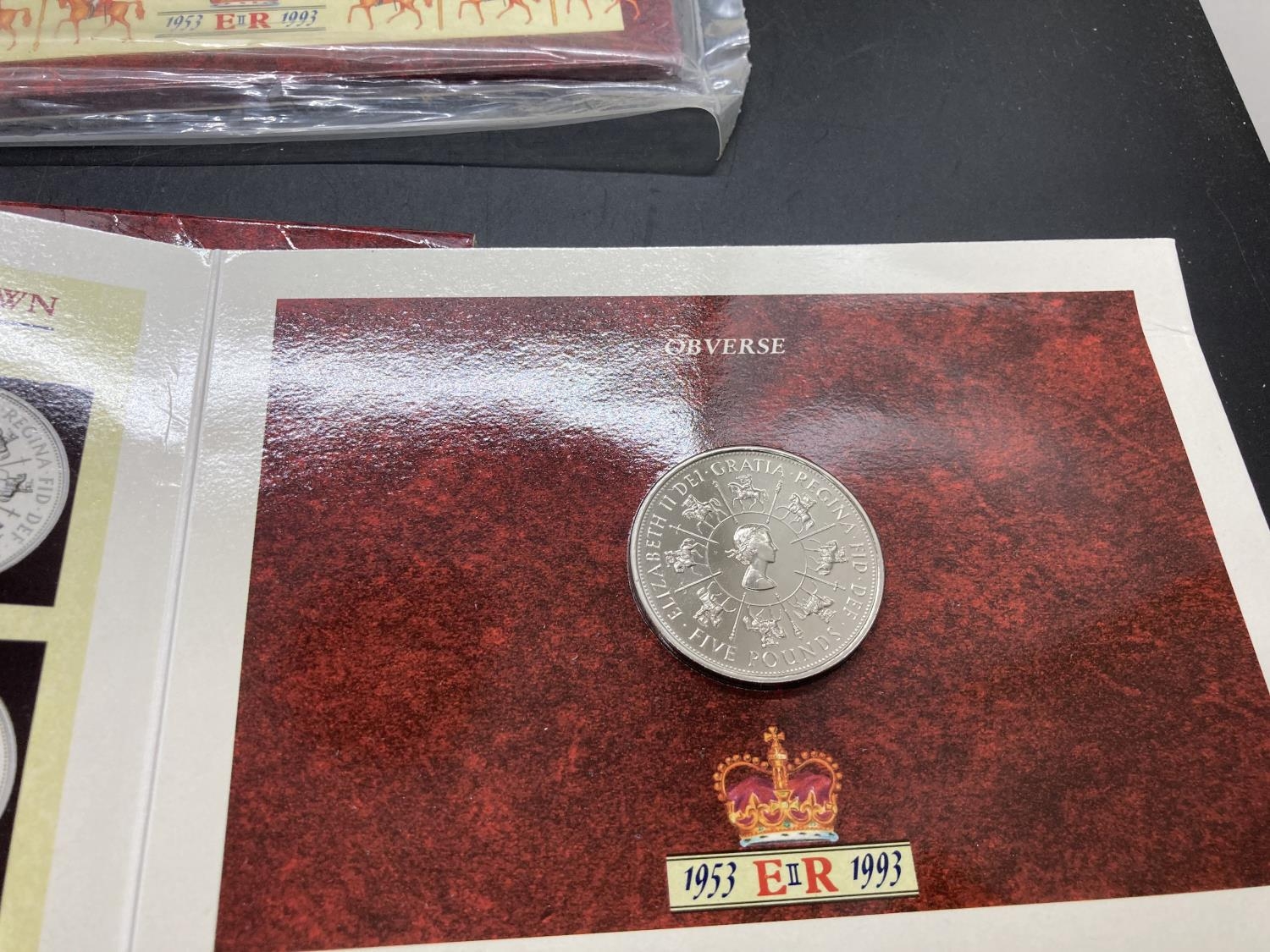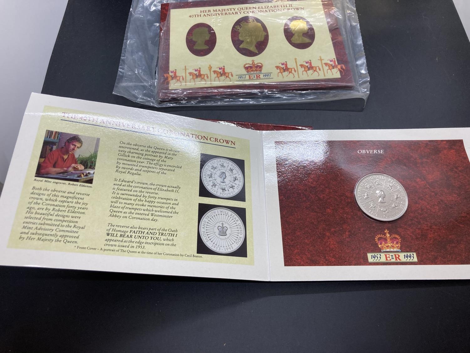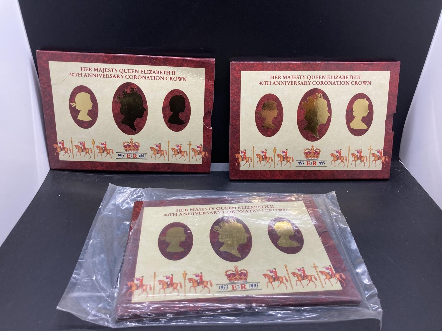 Three Royal Mint issue envelopes containing Elizabeth II 40th Anniversary Coronation crown coins