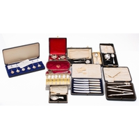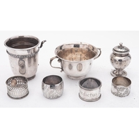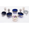 A mixed group of silver and silver plate including; a pair of George V pepperettes by Stokes & Ireland Ltd, Chester 1919, a pair of vase shaped London pepperettes with blue glass liners, a silver and enamel circular dressing table box with violet decoration, a George III oval salt with blue glass liner, 320gms., (10.4ozs.) and three silver plated salts also with glass liners, (10)