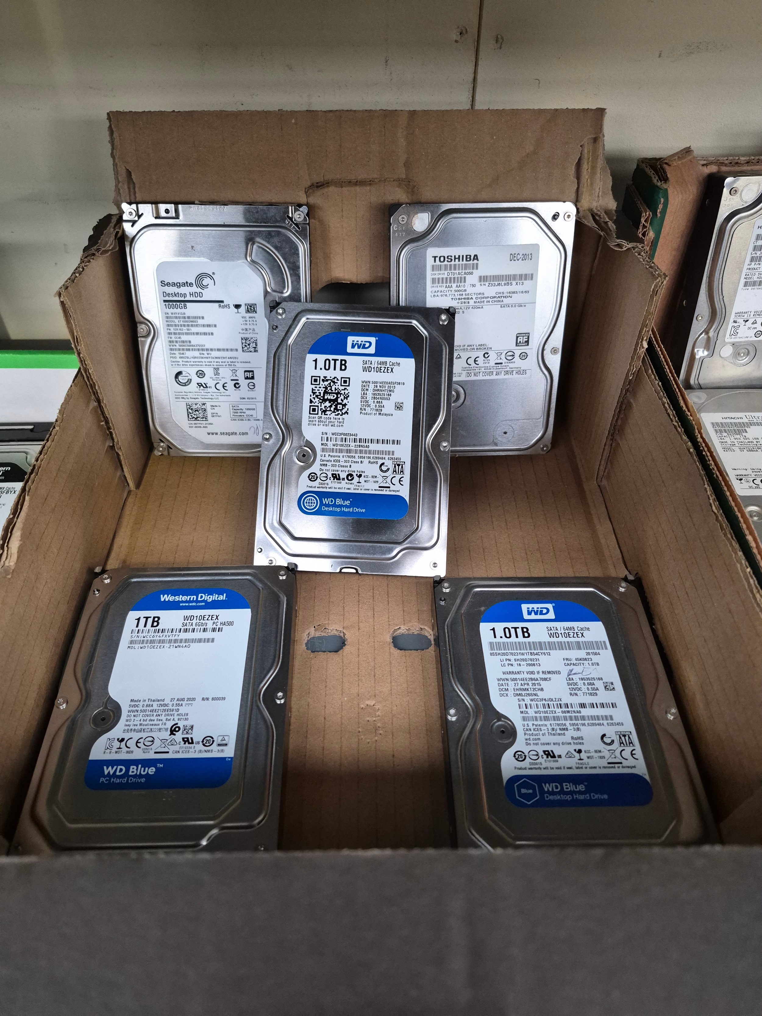 Box containing assorted hard drives including 3 Western Digital 1TB