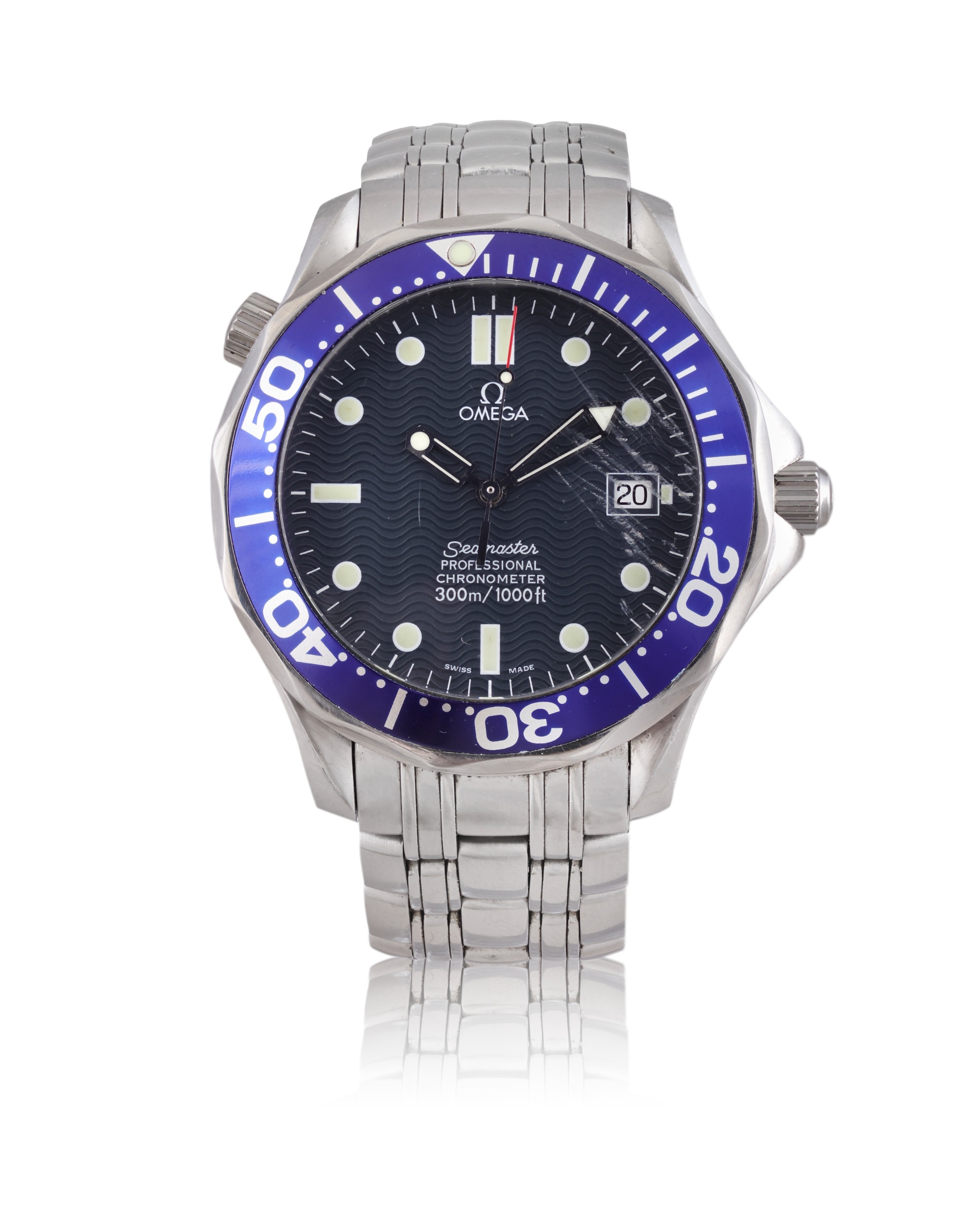 Omega SEAMASTER PROFESSIONAL 300M, REF. 2531.80.00 A stainless steel automatic wristwatch with date and bracelet. Year: Circa 2000 Dial: Blue wave-pattern dial with luminous hour markers, luminous skeleton hands with centre seconds, date aperture at 3 o'clock Movement: Automatic movement, Omega calibre 1120 (chronometer certified) Case: Stainless steel case, numbered 80587106, blue unidirectional rotating bezel Diameter: 41 mm Gross Weight: 159 g approx. Bracelet/Strap: Stainless steel Omega bracelet, approx. 180 mm