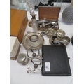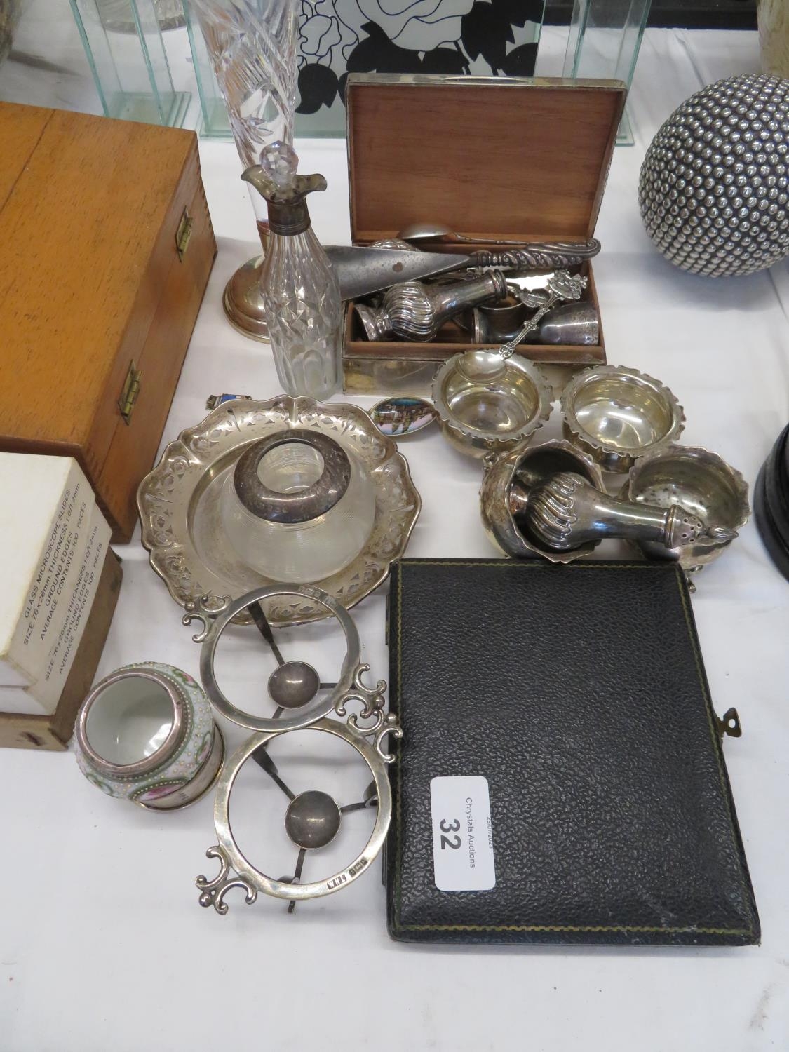 A collection of small items of silver - salts, peppers, cigarette box, spoons etc