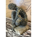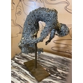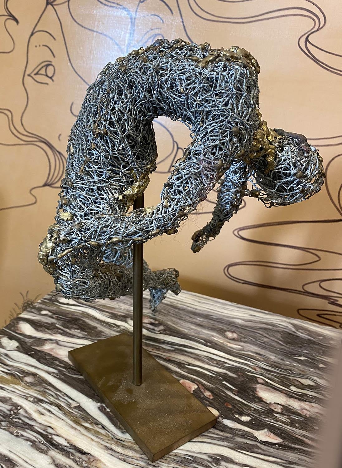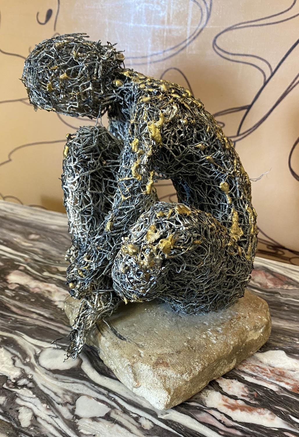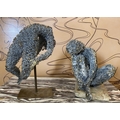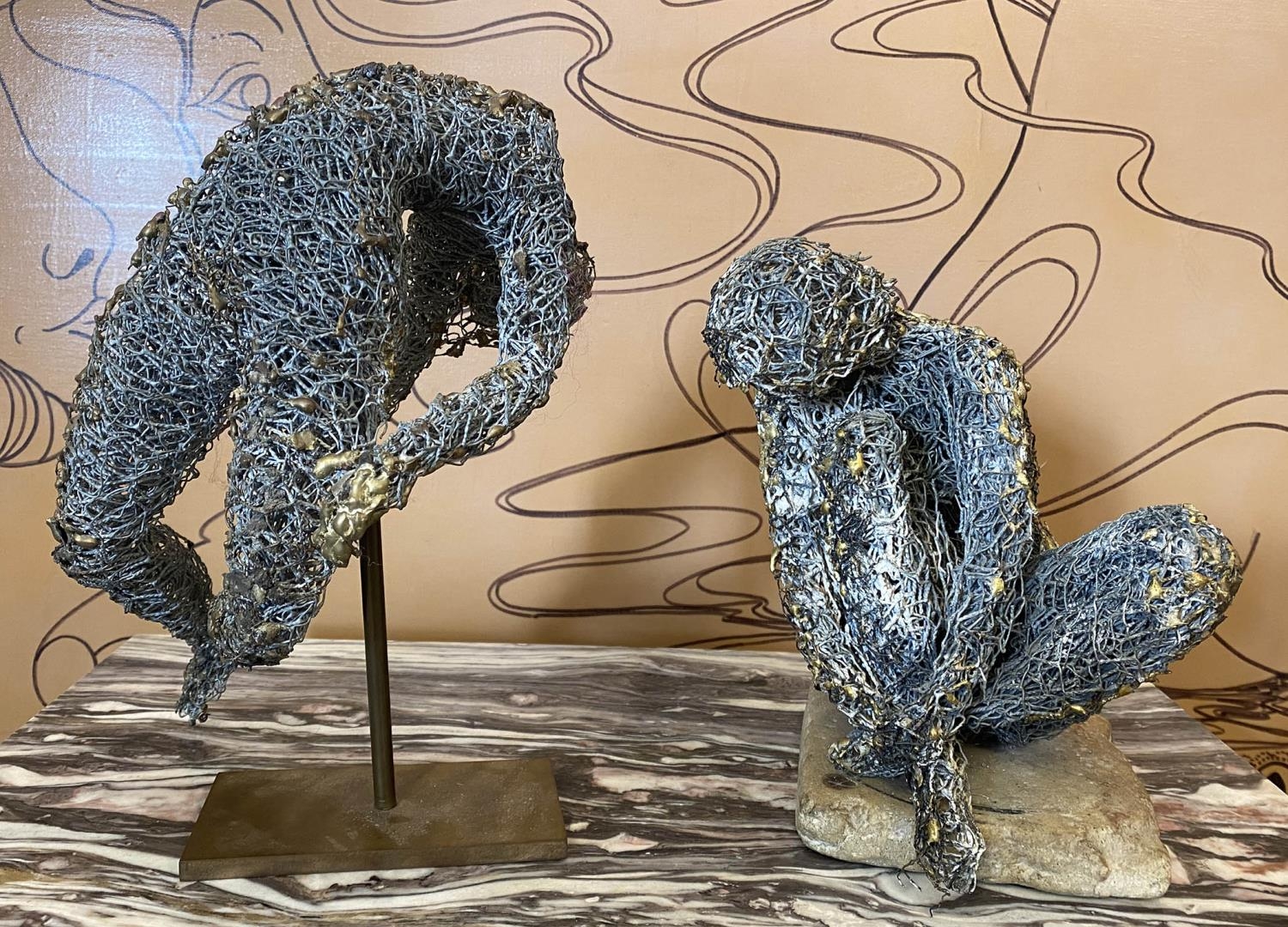 FRENCH SCHOOL 'Crouching and Stretched Figures', metallic wire sculptures, a pair, one with monogram 'M.P.'on the base, 28cm x 22cm x 20cm and 23cm x 18cm x 19cm. (2)