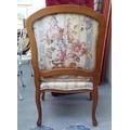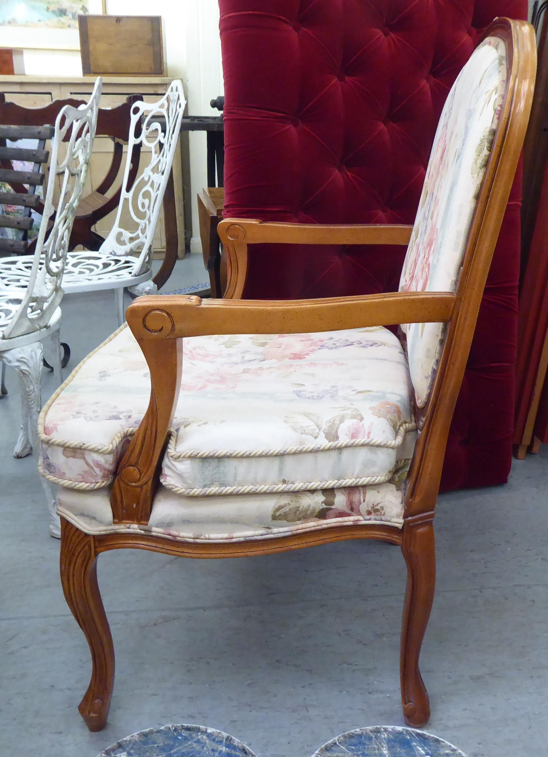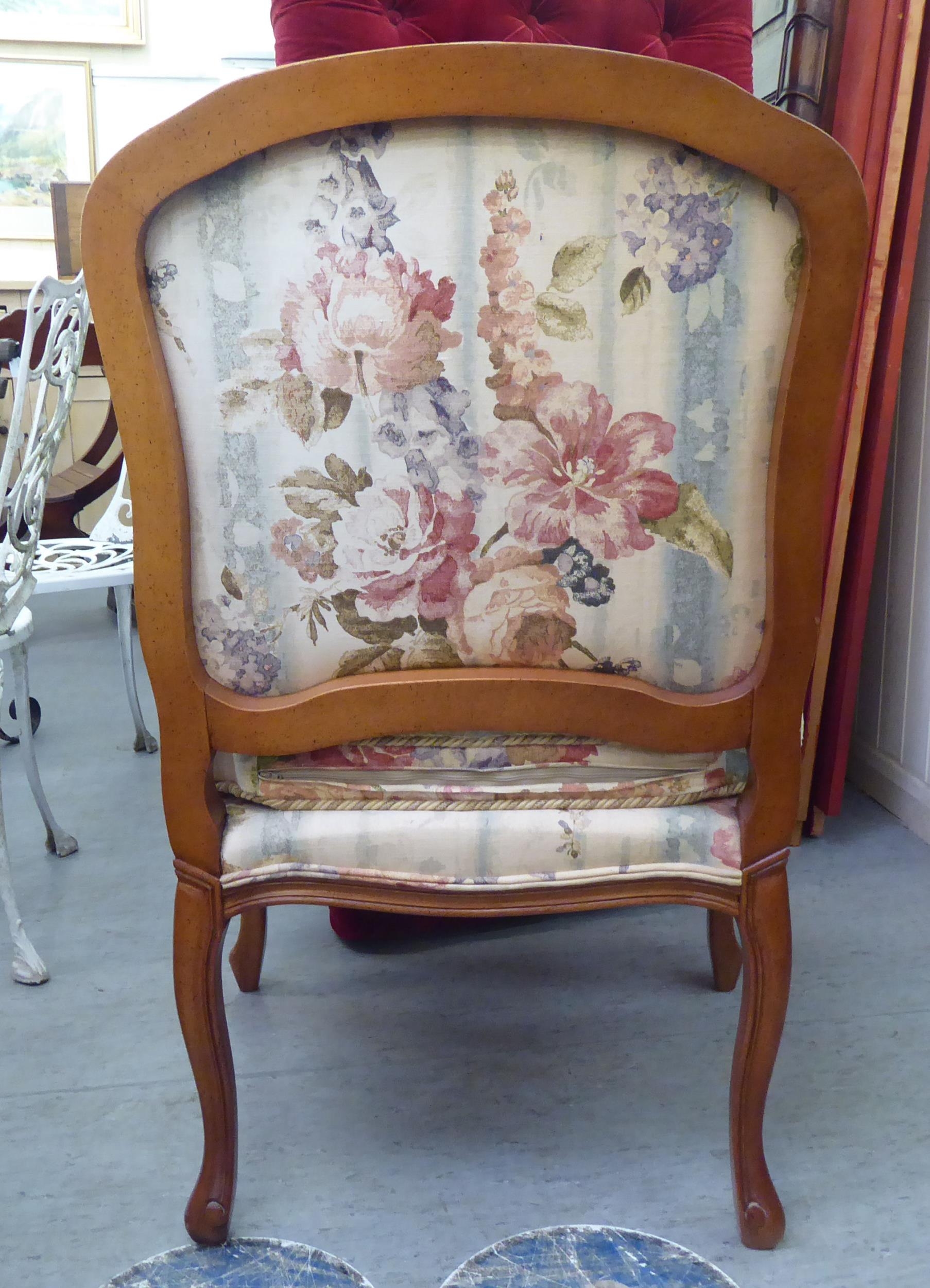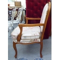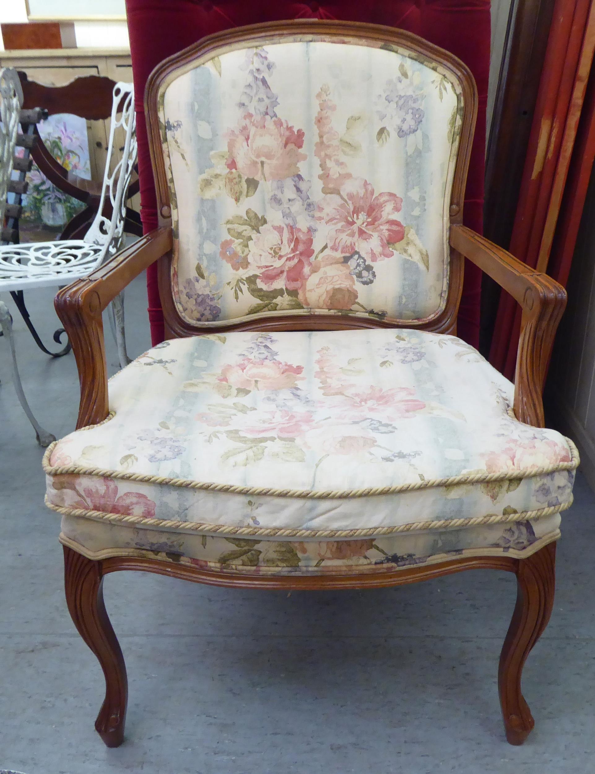 A modern French design carved beech framed open armchair with floral fabric upholstery and a cushioned seat, raised on cabriole forelegs
