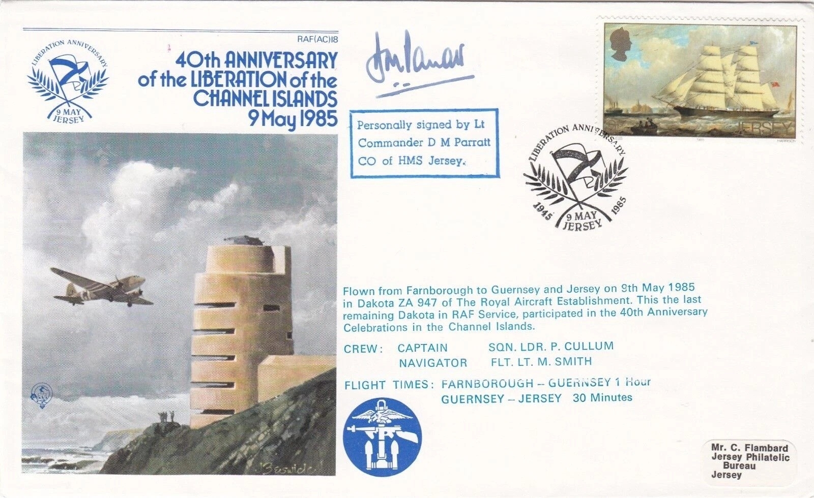 AC18a 40th Anniversary of the Liberation of Channel Signed D M Parratt. 9 May 1985 Liberation Anniversary. 40th Anniversary of the Liberation of Channel Islands. Flown Cachet flown from Farnborough to Guernsey and Jersey. Personally Signed by Commander D M Parratt CO of HMS Jersey. Certified Copy no 39 of 50 . Single Vendor RAF cover collection. Good condition. All autographs come with a Certificate of Authenticity. We combine postage on multiple winning lots and can ship worldwide. UK postage from £5.99, EU from £7.99, Rest of World from £9.99