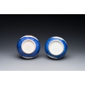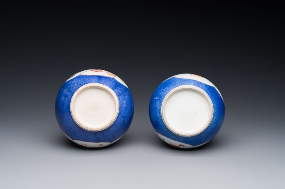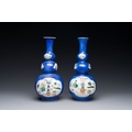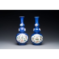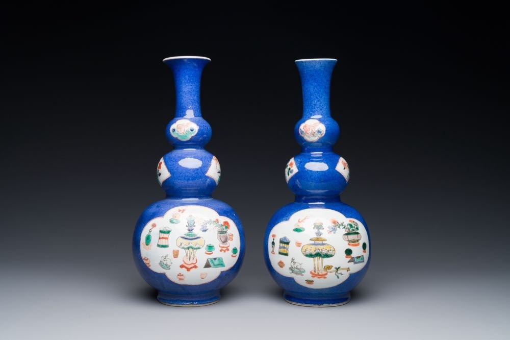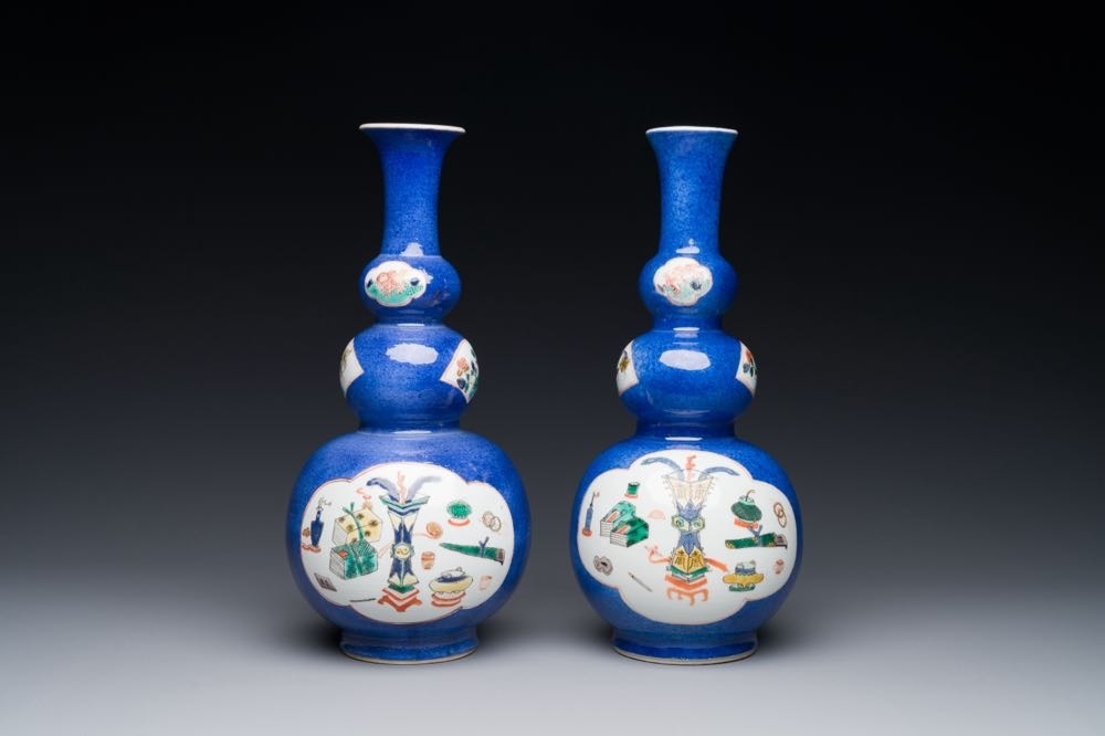 A pair of Chinese famille verte powder-blue-ground triple gourd 'antiquities' vases, Kangxi